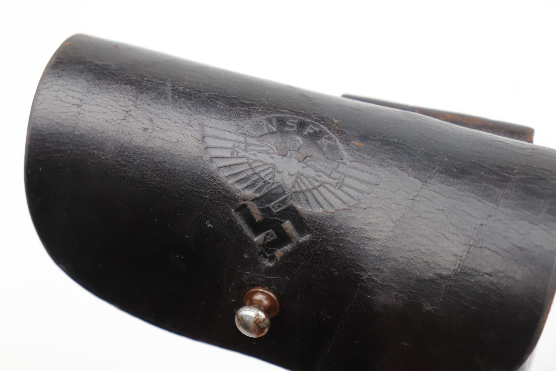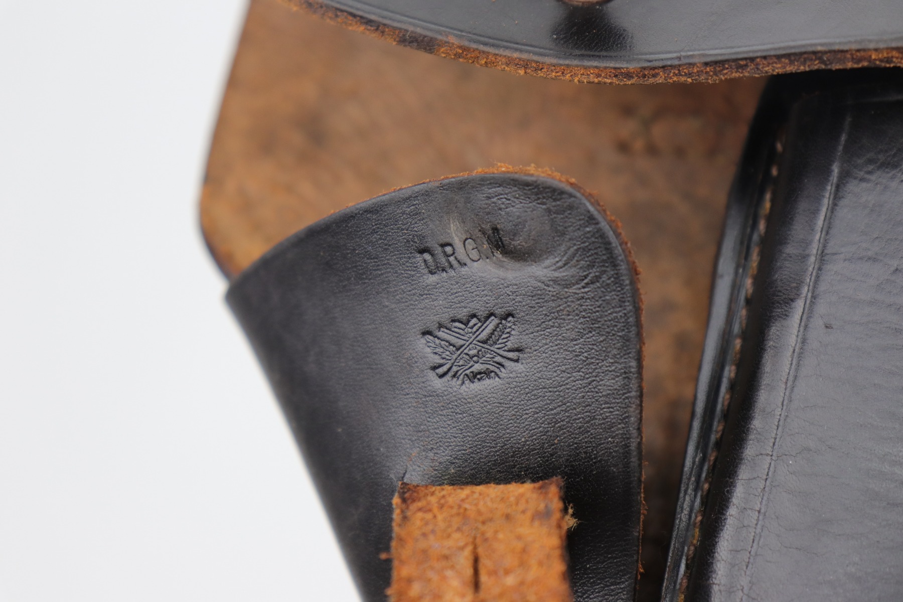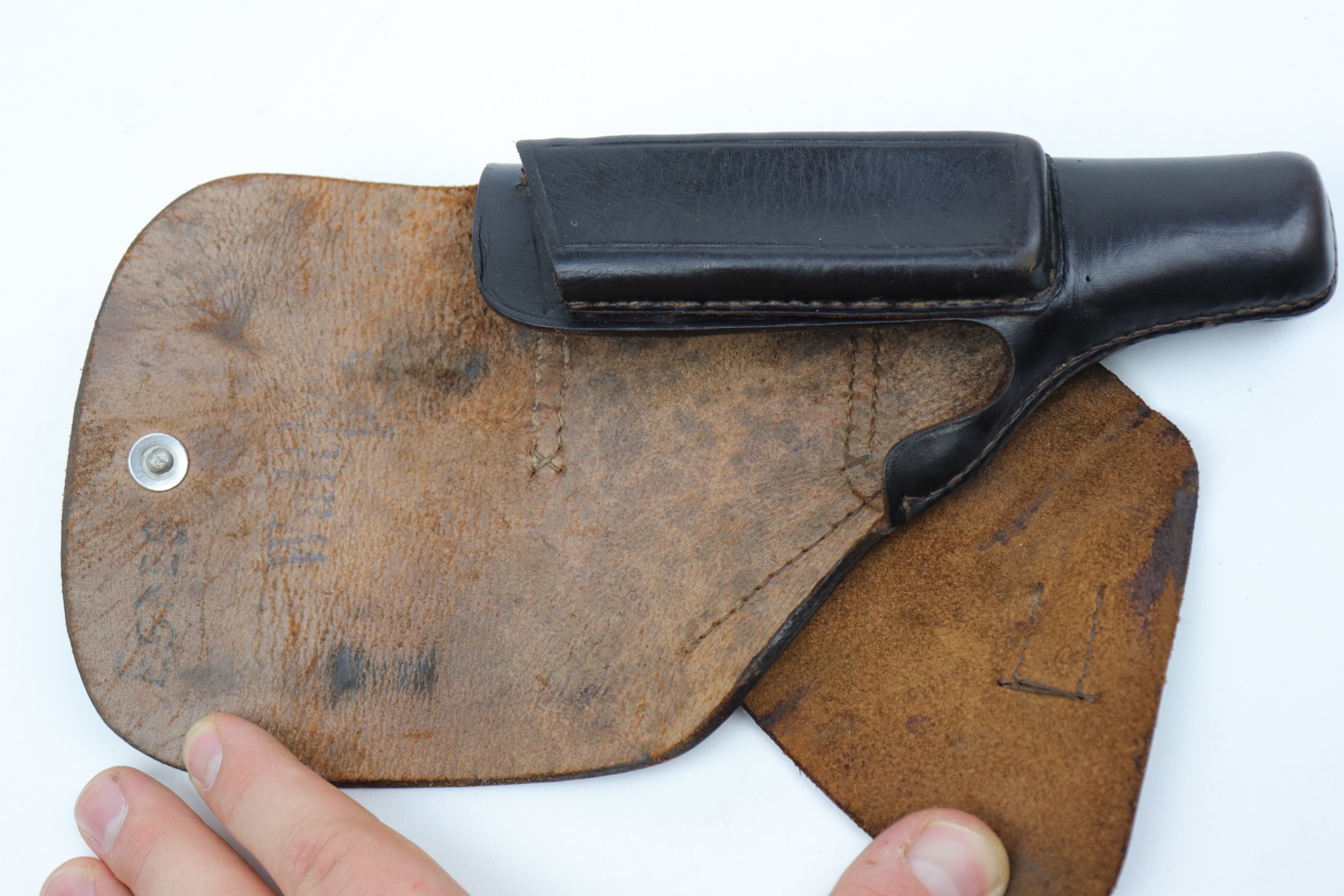 10/14/20 – This is an ultra rare NSFK-marked holster for a Walther PP. The NSFK marking is crisp and clear. It is Akah makers marked under the closure strap. The holster is in excellent condition – just some light surface scuffs and very light surface cracking on the top flap. There is a partially-visible ink stamp and name written on the inside.