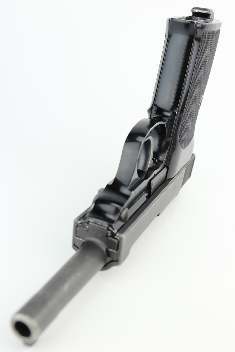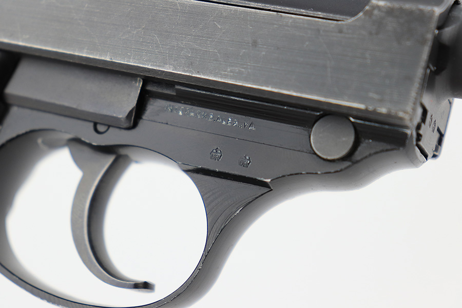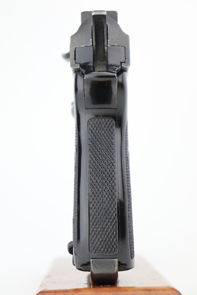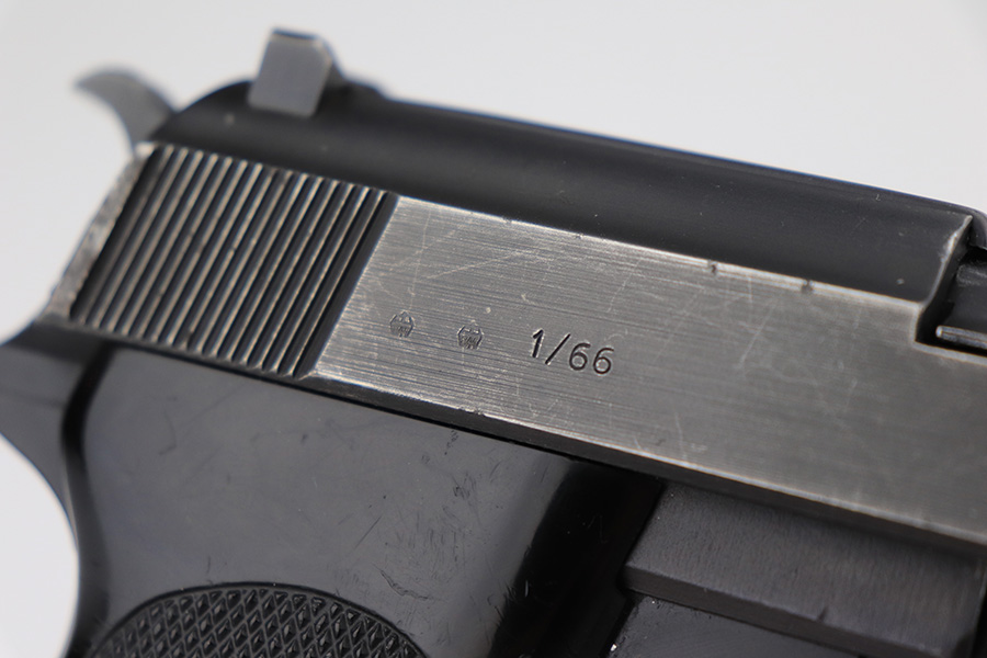 4/21/23 – This is an excellent example of an ultra-rare Walther P1 manufactured in January of 1966 and issued to the West German police. It is all matching with the proper West German proofs throughout. Interarms import mark on the right side of the frame. It has retained about 97% of its original finish with very minor wear around the muzzle and on the high edges of the slide. Some areas of light oxidation on some areas of the right side of the slide. Some tiny scratches and scuffs on the slide and barrel. Fitted with black plastic grips – a blue dot on the left side. Comes with a matching-numbered 1964-dated magazine. Mint bore. De-cocker is functional.