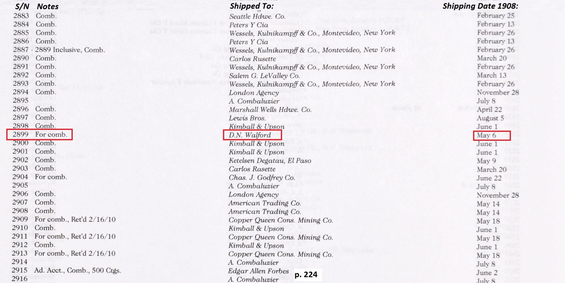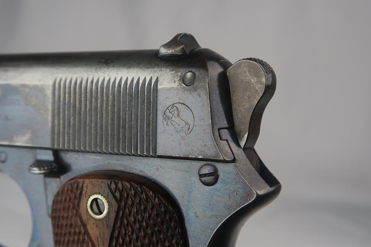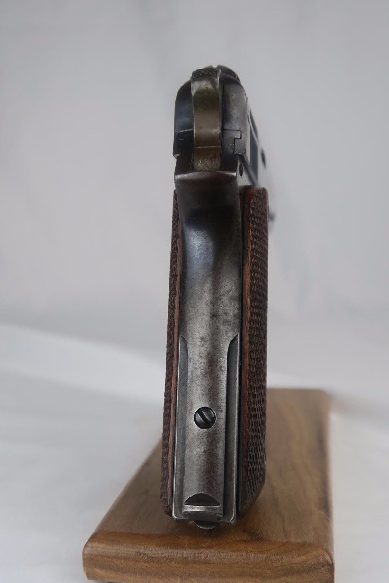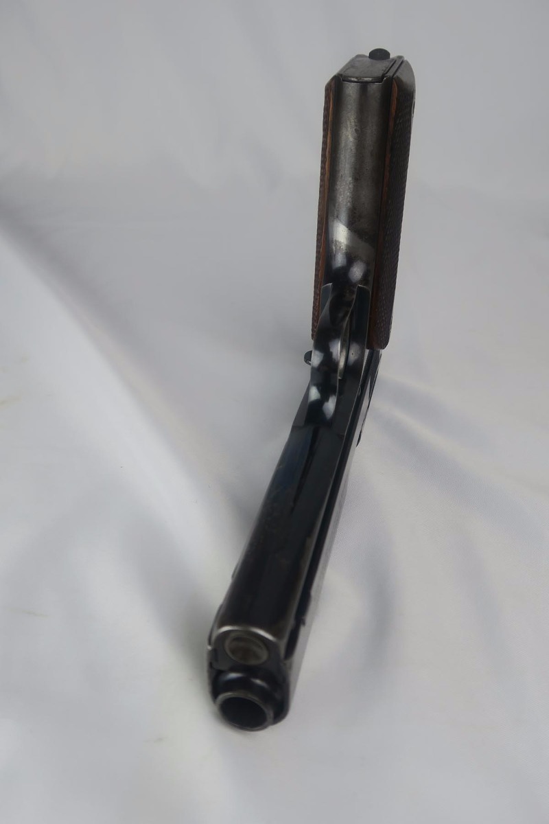 9/5/17 – This is an extremely rare Colt model 1905 – one of the approximately 440 such pistols with the cut in the back strap for optional combination stock/holster! The Colt model 1905 was designed by John Browning and was the first firearm chambered for the .45 ACP cartridge. It was submitted to the U.S. Army for trials to become the standard army sidearm but was rejected, and later improved and modified until it was eventually accepted as the model 1911. For this reason, these pistols have been casually referred to as the “father of the 1911”. There were only 6,000 of these pistols ever made, all between 1905 and 1911. The pistol listed here is documented in Goddard’s “The Government Models”, and was manufactured in 1908 and is all correct and original. It was shipped on May 6, 1908 to a D.N. Walford, as found in Goddard’s book on the subject. It was part of a block of mostly combo guns from serials 2883 to 2915. The high-polish blue rates at about 75-80%, and the trigger still shows excellent fire bluing. Original grips and magazine, all in very good to excellent condition. Excellent bore, too.