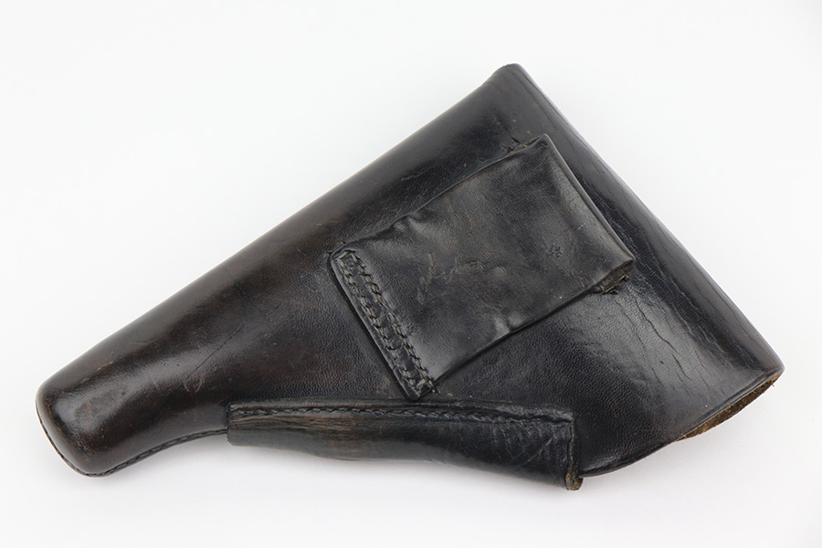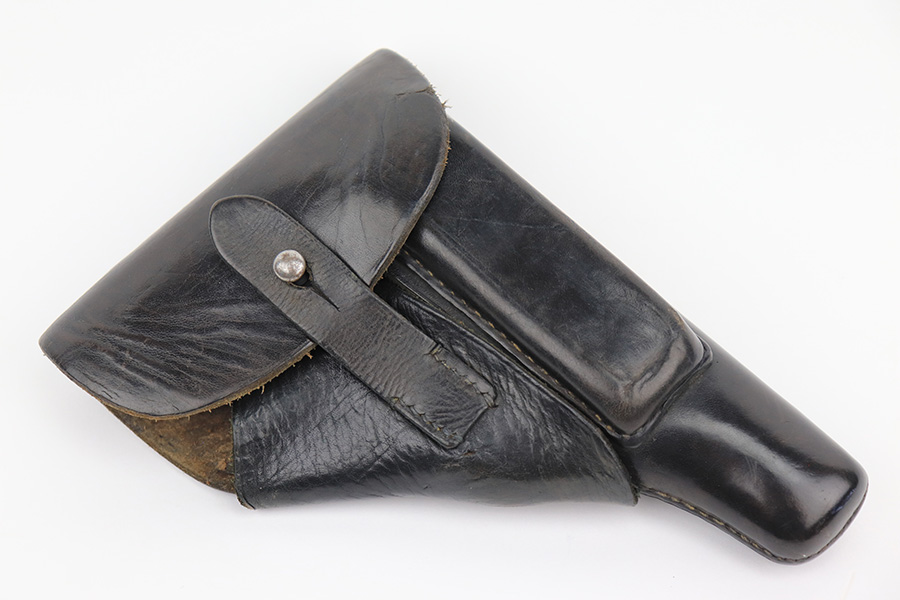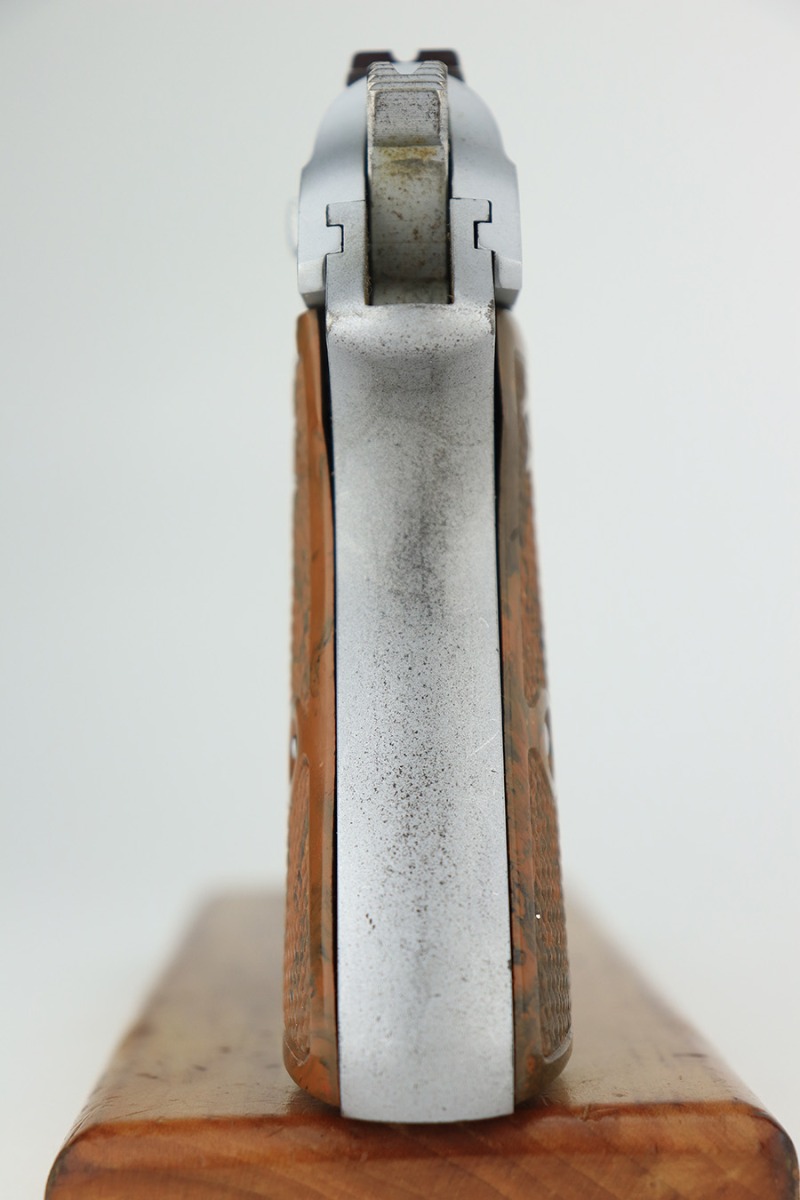 2/22/23 – This is a very rare Walther PP rig, with an estimated production of only about 600, with original Verchromt or satin finish. The production totals on the Verchromt PP are considerably lower than that of the PPK, and this is one of only a few we’ve ever offered. The profile is very nice with most of the finish loss on the straps. Excellent brown grips. Original satin finish magazine. Comes with a nice, original Akah holster.