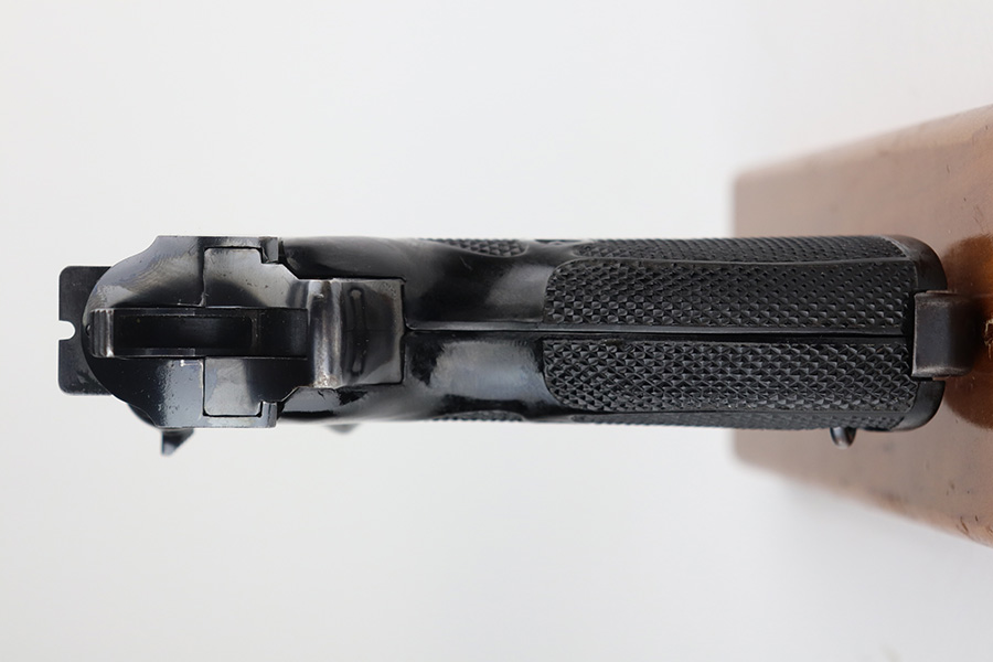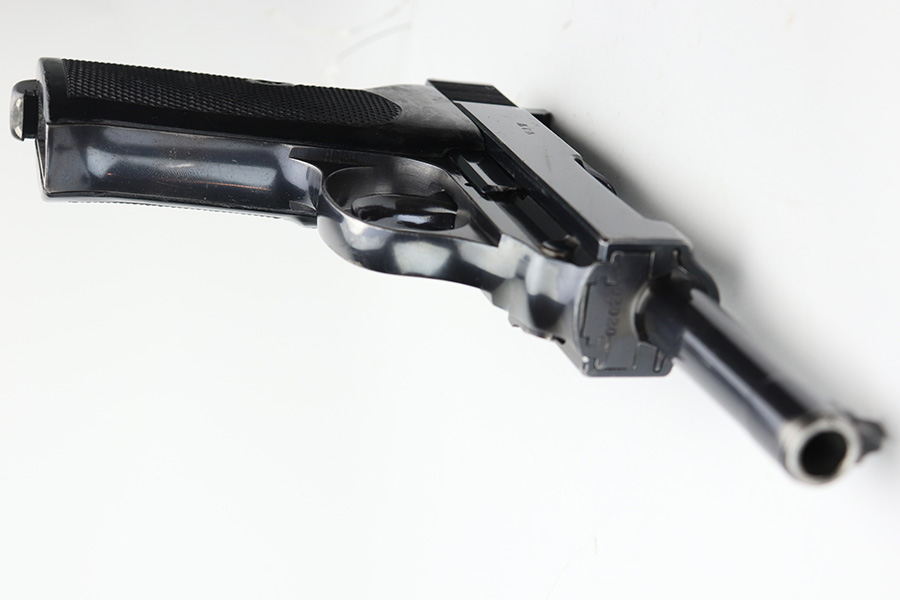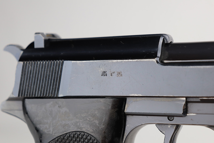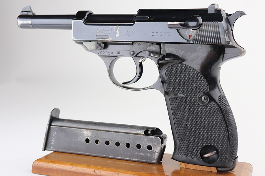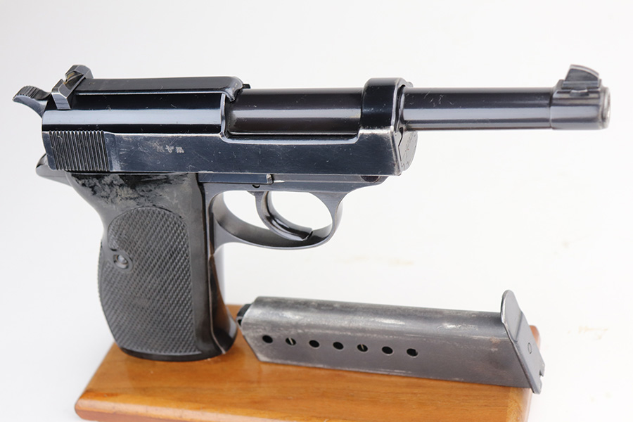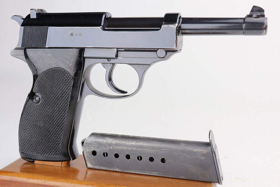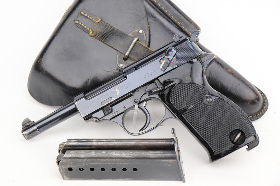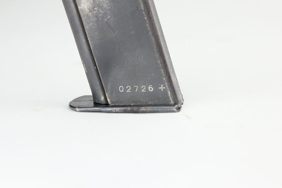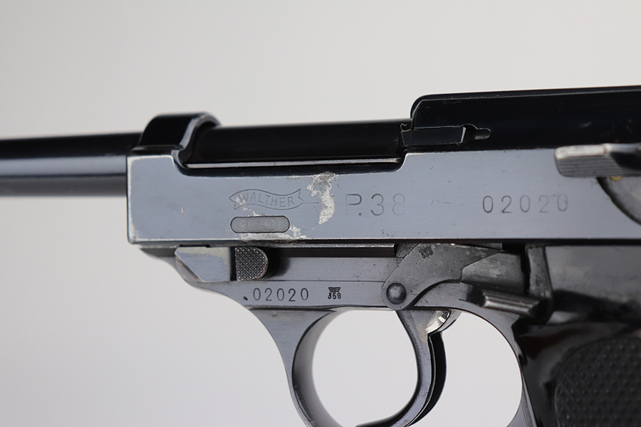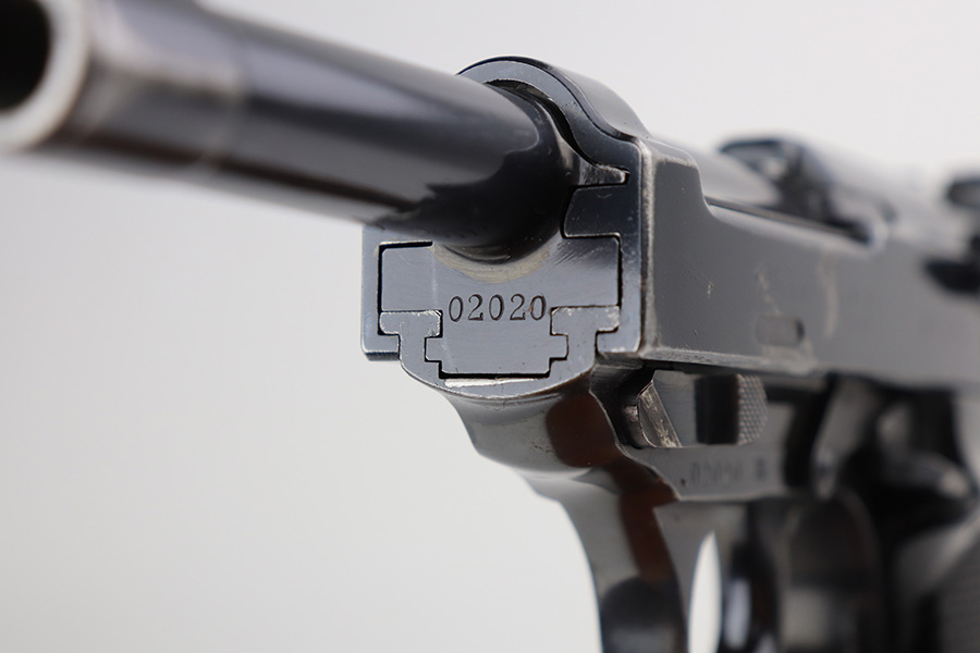 5/25/23 – This is an ultra rare 2nd variation Zero Series Walther P.38 with milled panel on slide. Krutzek’s P.38 book labels it as a variation 2b example, one of only ~320 ever produced. These were made using leftover 480 coded slides, and the Zero Series variation milled out the 480 marking from the slide. Otherwise, it is mechanically identical to the other second variation examples. This one is all matching and original, including the grips. The bluing rates at about 90%, with a patch of finish loss on the left side of the muzzle, left side of slide, and a little more on trigger guard and front strap. The magazine is an original and correct second variation example but is about 700 digits off from the pistol. Safety works but not as a de-cocker. Bore has decent rifling but freckling through the grooves. Listing includes a spare Walther magazine, and comes with an excellent 1943 hardshell holster.