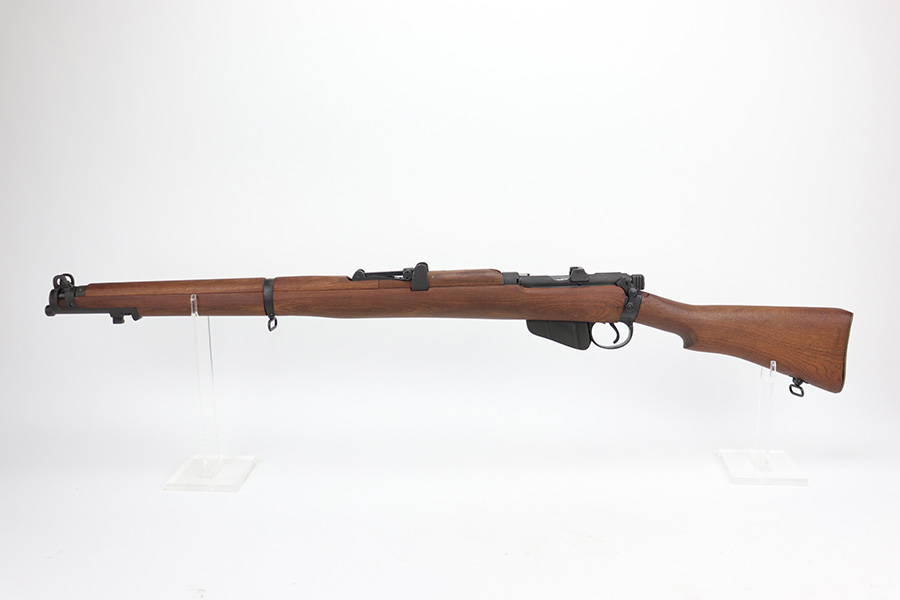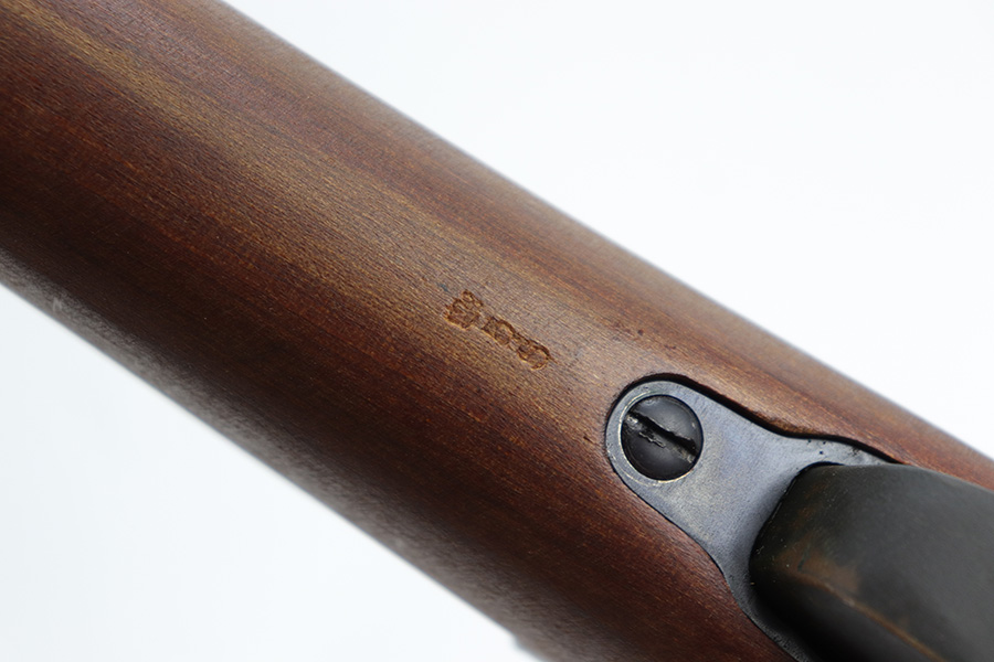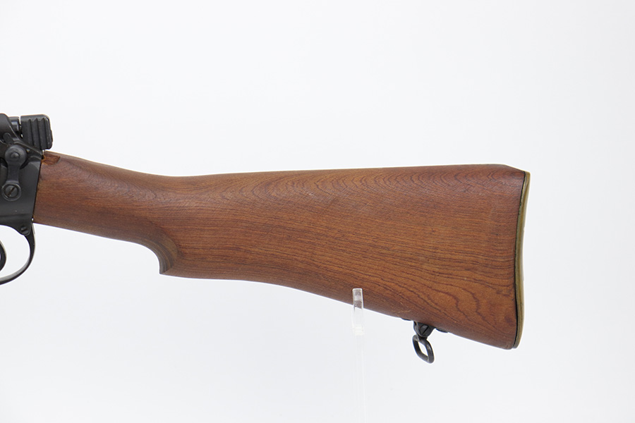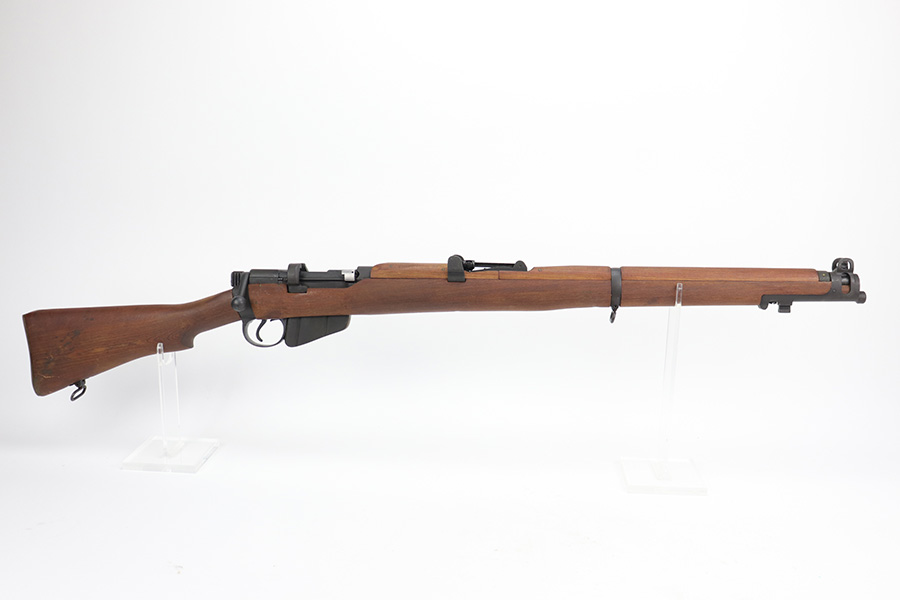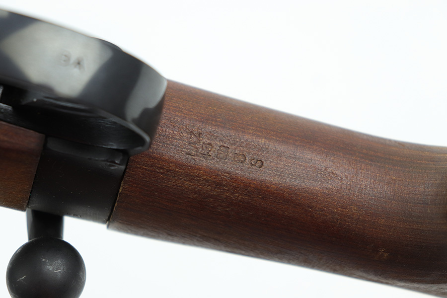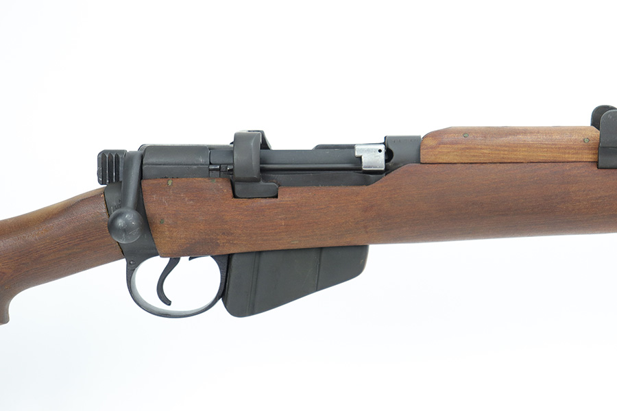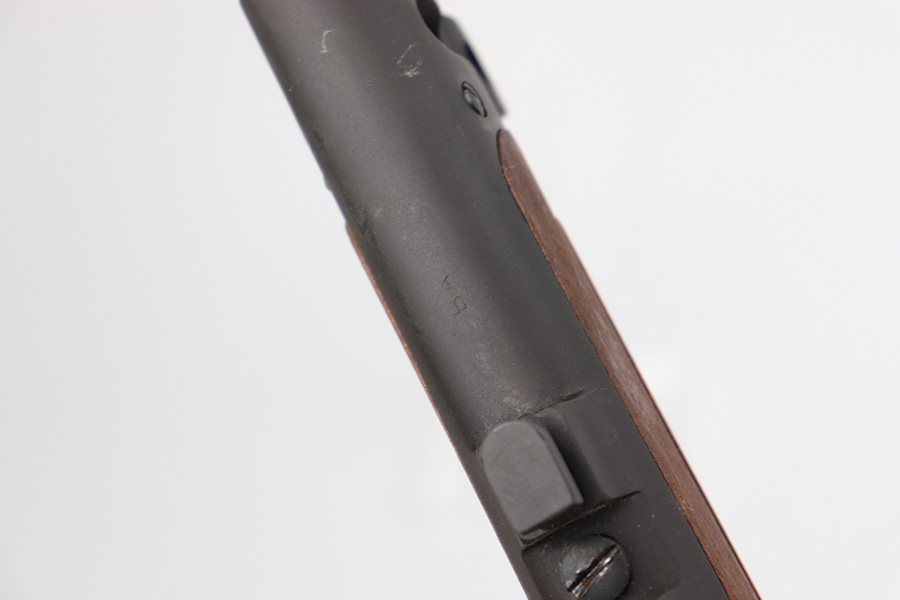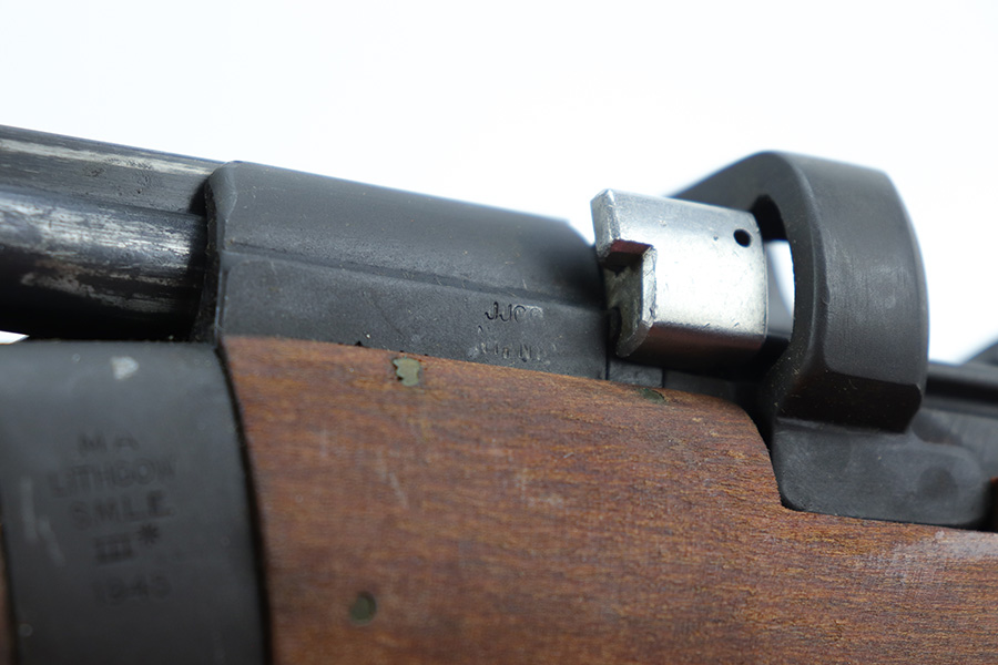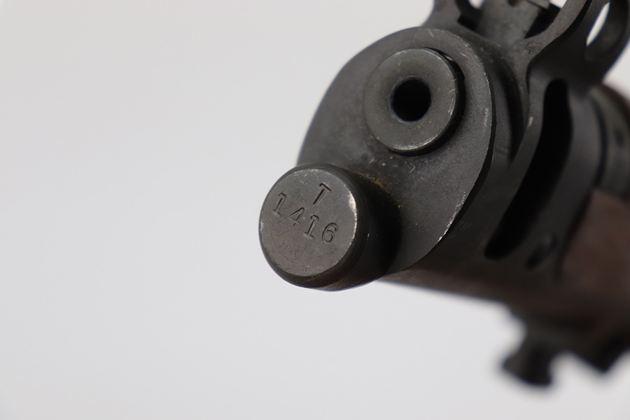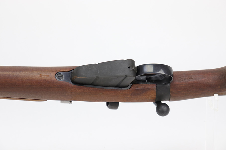 7/18/23 – This is an un-issued example of a British Lithgow SMLE III Training rifle, manufactured in 1945 and chambered in .22 LR. It is all matching with a tiny import mark on the right side of the receiver. Missing a follower and spring in the magazine. The gun is in un-issued condition with virtually no finish loss – just some very minor surface scuffing here and there. Minty wood furniture with some dark staining on the right side of the butt stock. Mint bore.