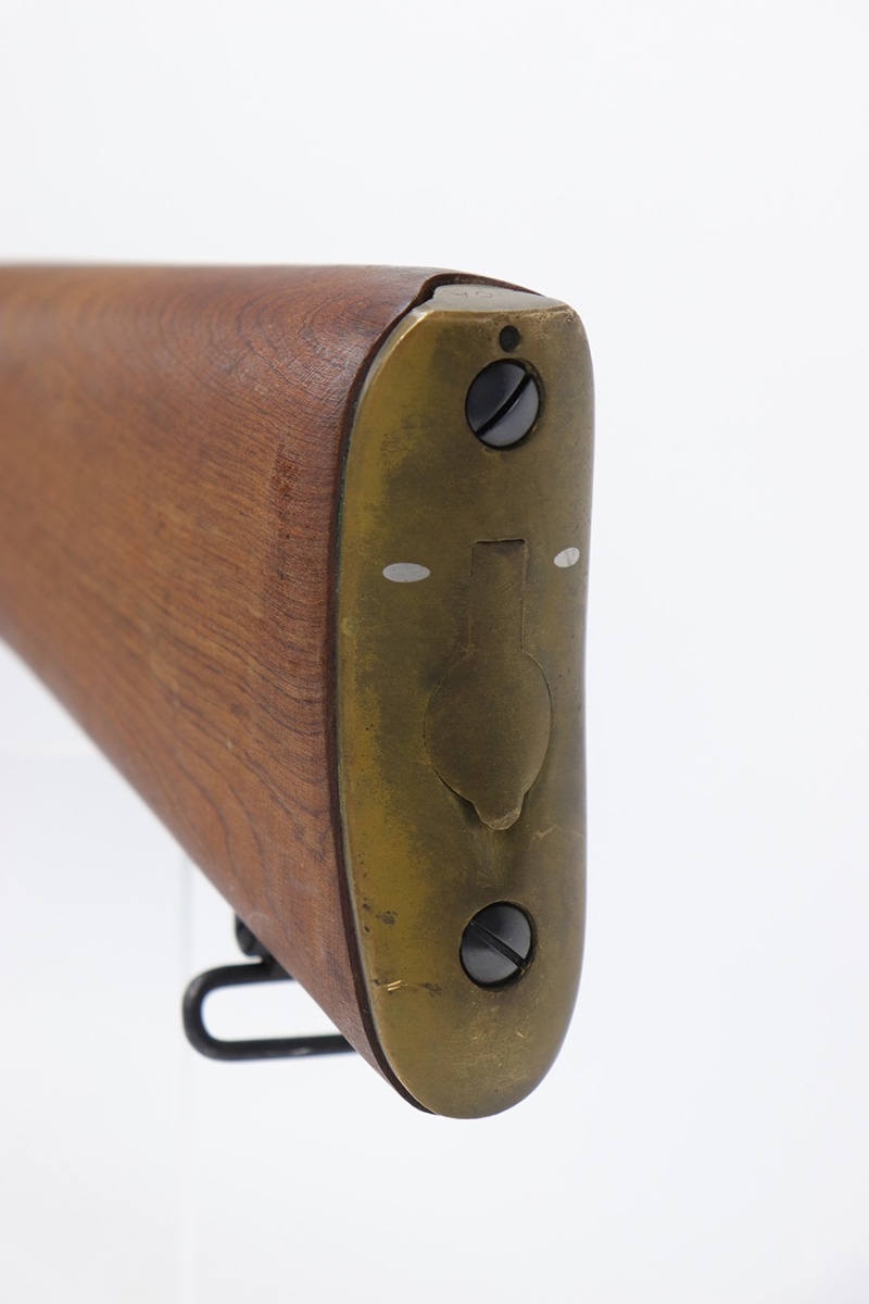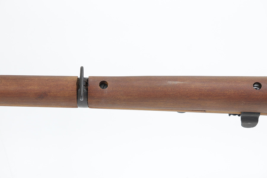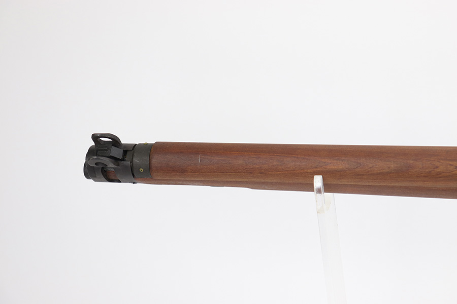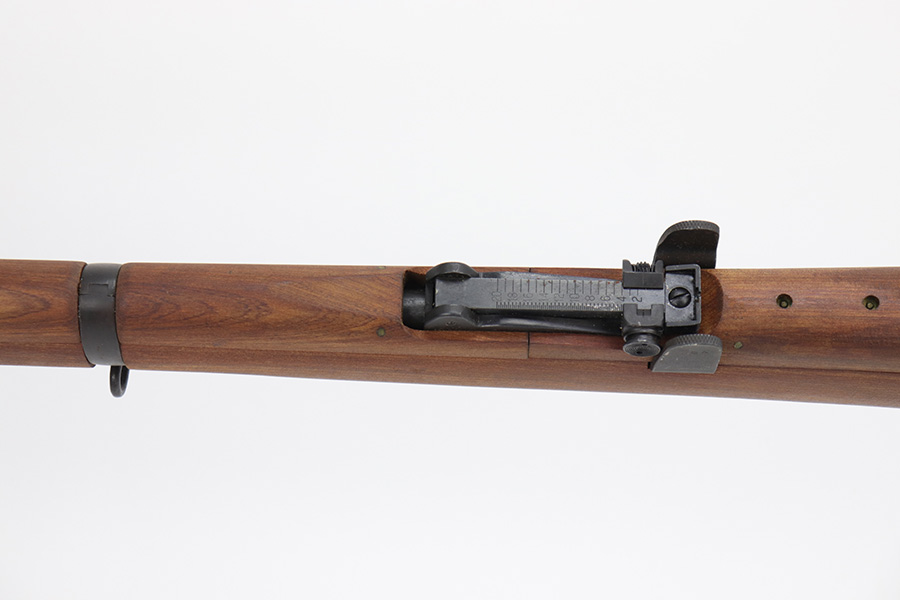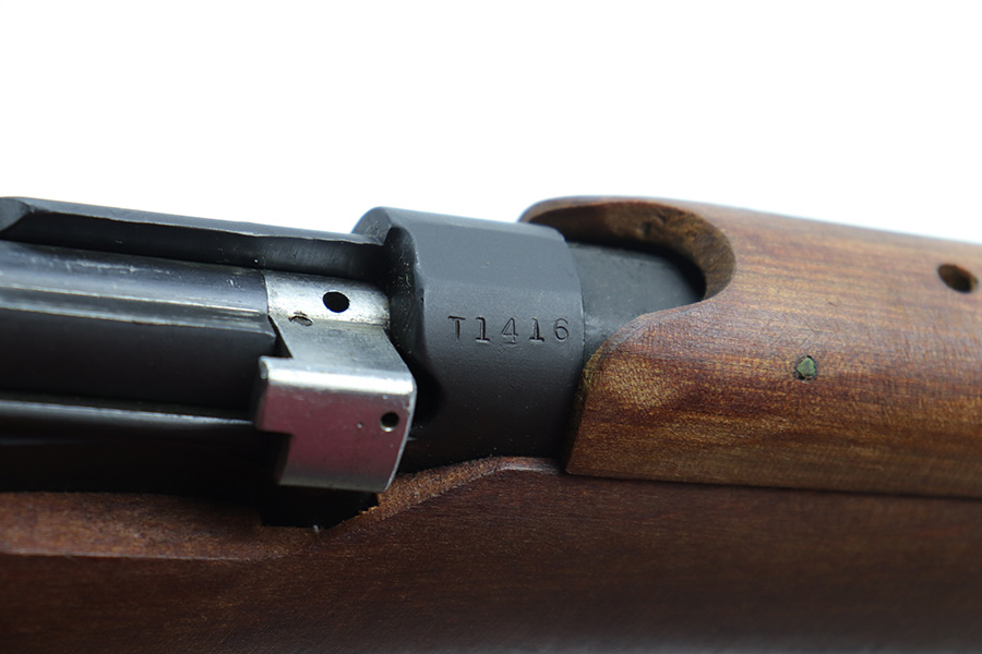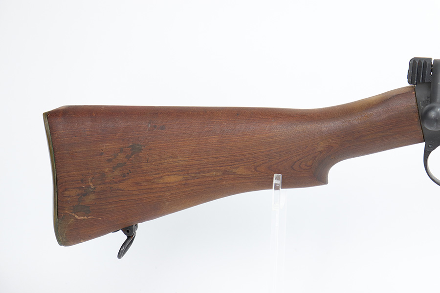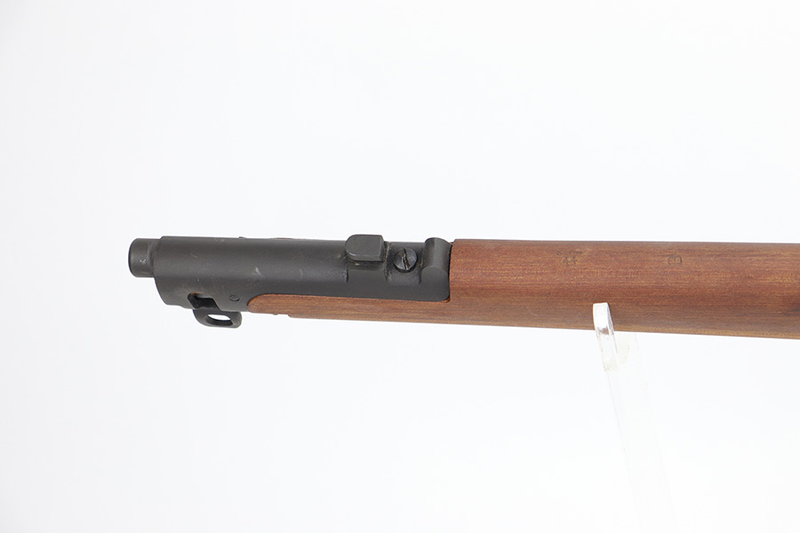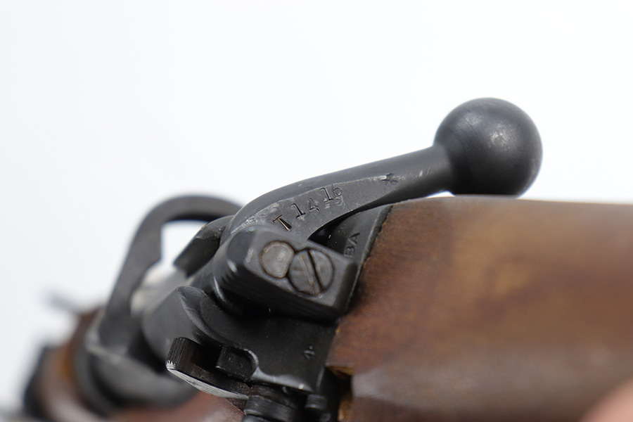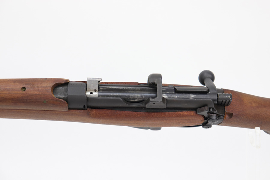 7/18/23 – This is an un-issued example of a British Lithgow SMLE III Training rifle, manufactured in 1945 and chambered in .22 LR. It is all matching with a tiny import mark on the right side of the receiver. Missing a follower and spring in the magazine. The gun is in un-issued condition with virtually no finish loss – just some very minor surface scuffing here and there. Minty wood furniture with some dark staining on the right side of the butt stock. Mint bore.