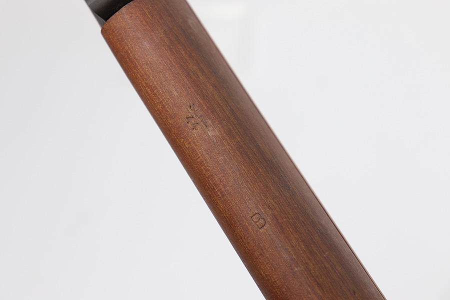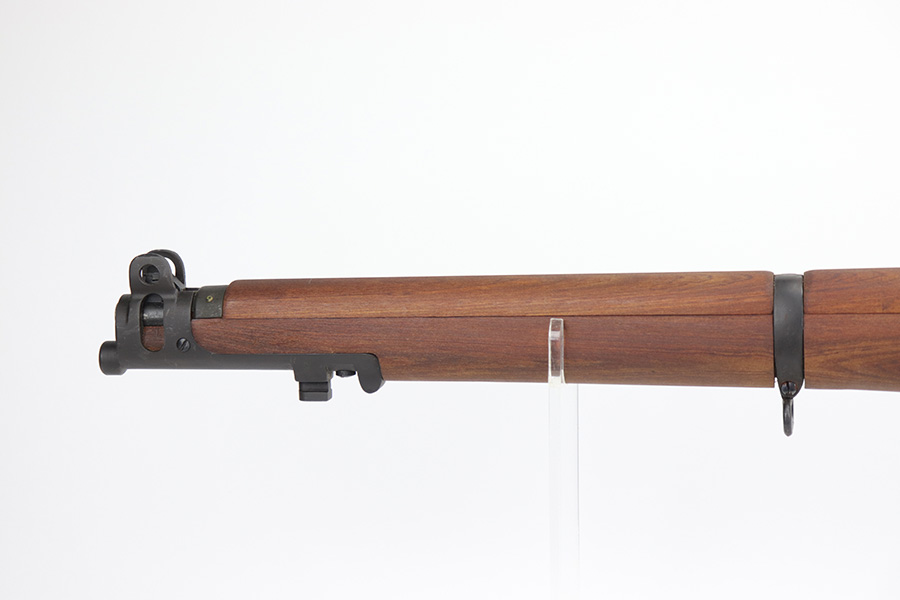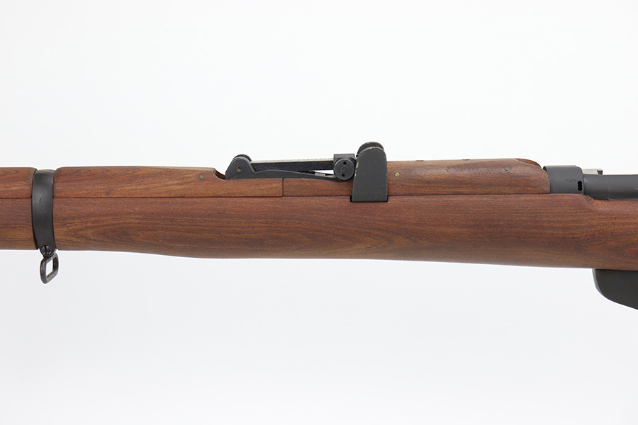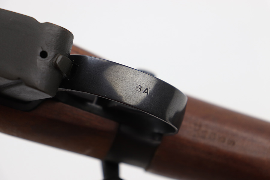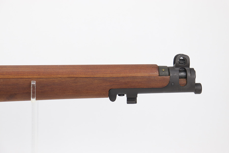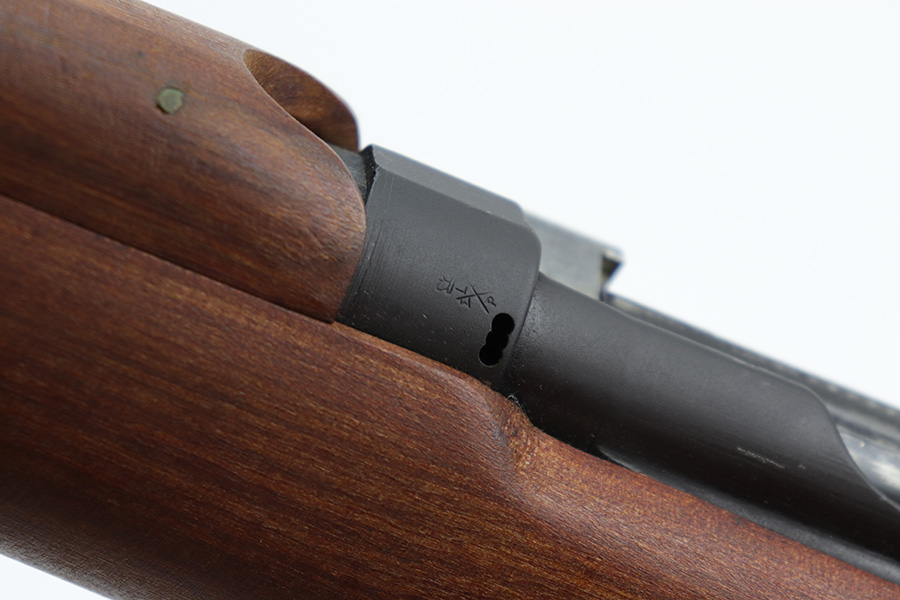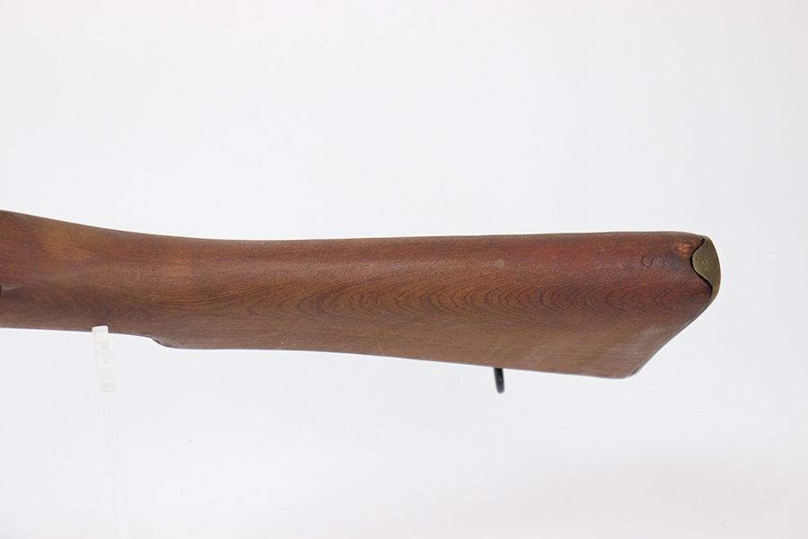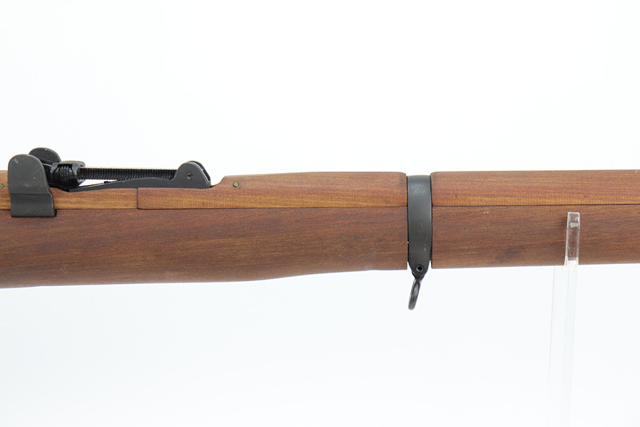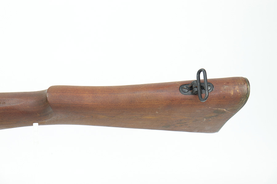 7/18/23 – This is an un-issued example of a British Lithgow SMLE III Training rifle, manufactured in 1945 and chambered in .22 LR. It is all matching with a tiny import mark on the right side of the receiver. Missing a follower and spring in the magazine. The gun is in un-issued condition with virtually no finish loss – just some very minor surface scuffing here and there. Minty wood furniture with some dark staining on the right side of the butt stock. Mint bore.
