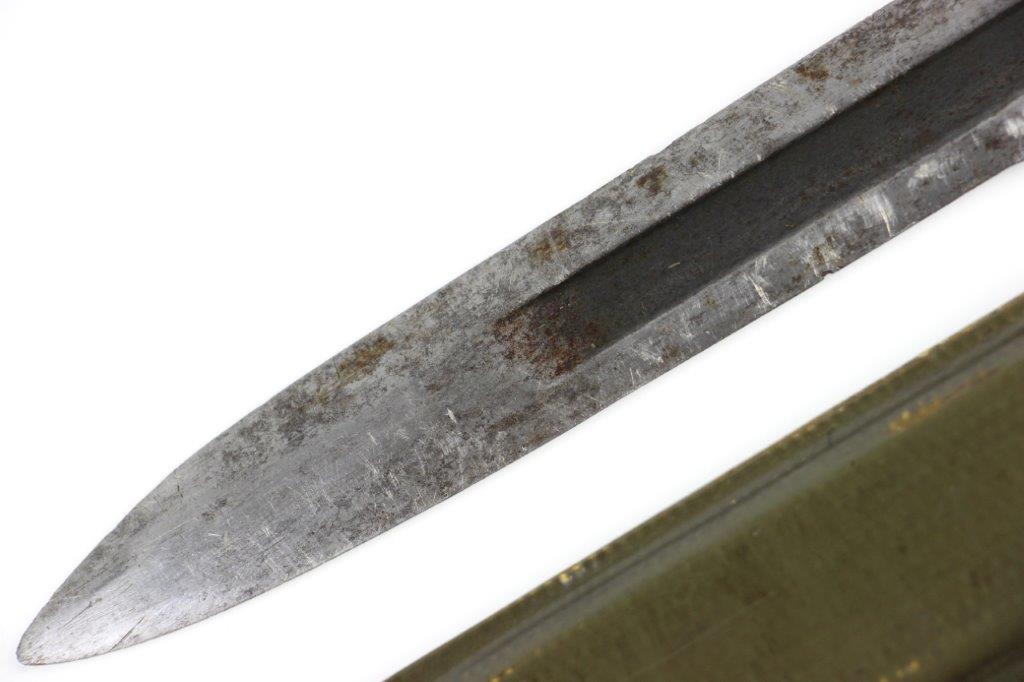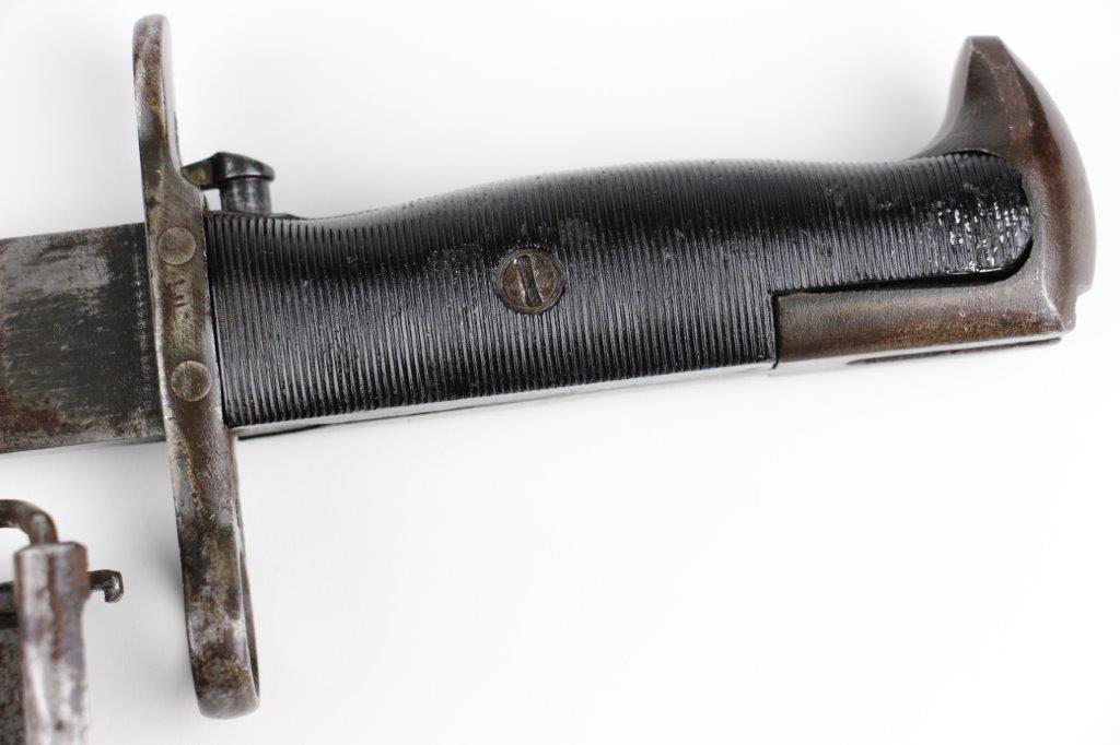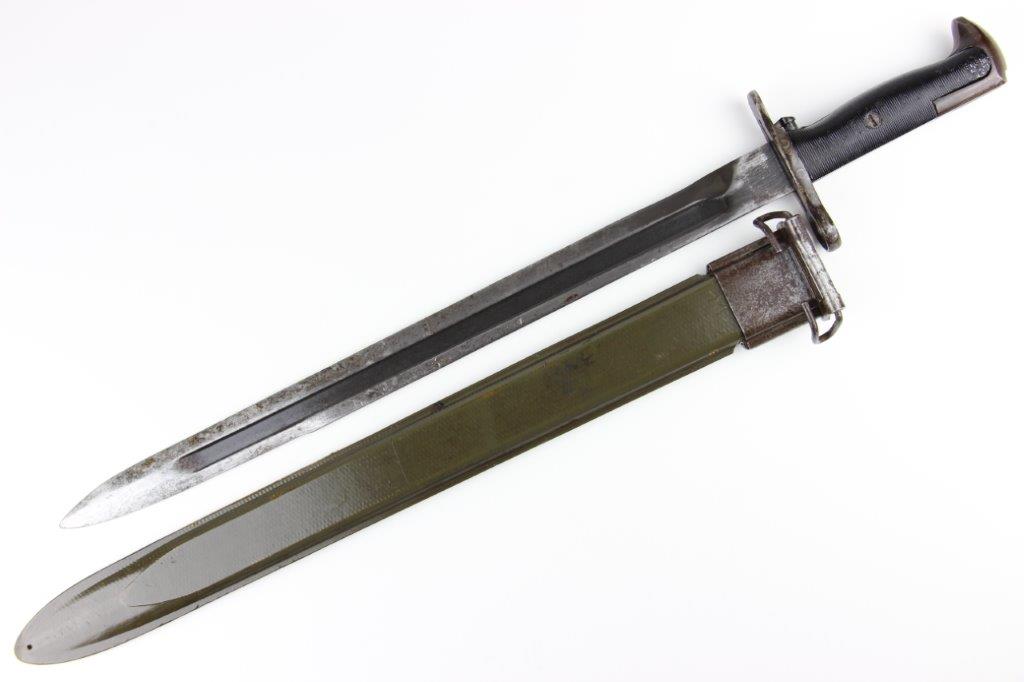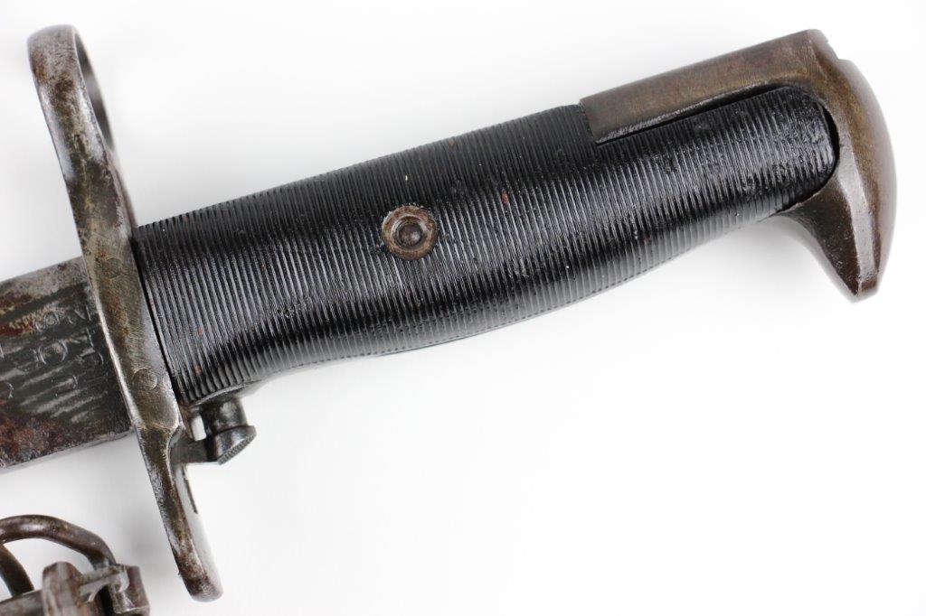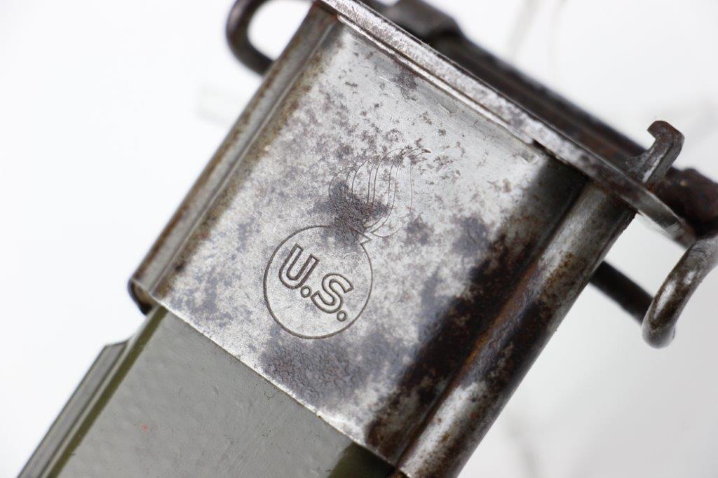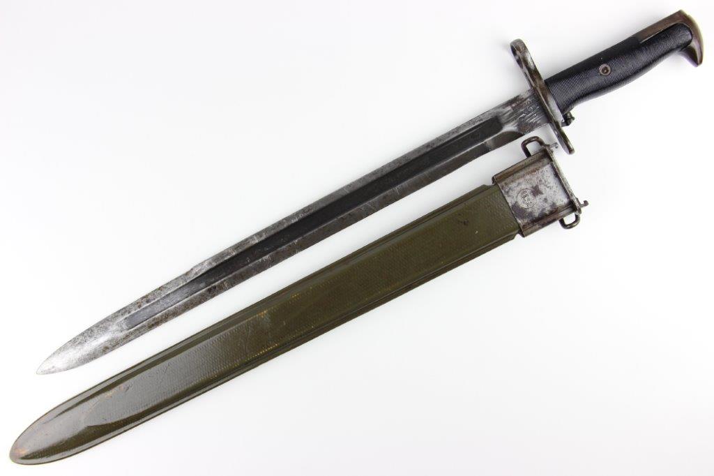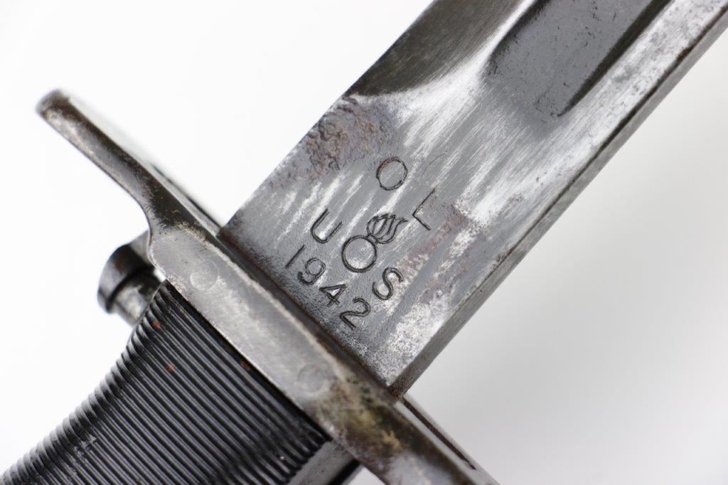 7/15/24 – This is an original, uncut (16 inch blade) M1 Garand bayonet from WW2. The bayonet blade is maker stamped “O L” by Oneida Limited, which is one of the more desirable manufacturers, having only made around 250,000 bayonets during the war. The ricasso is also stamped with a US Ordnance stamp and early 1942 date stamp. The blade has natural surface wear and finish loss throughout; there’s speckling oxidation and mild surface scratches from use and scabbard rub wear. The edge is fairly clean with some mild wear but no major damage or issues. The cross guard, hilt, and pommel have natural browning patina throughout but no rust or pitting. Great condition black grip panels that show light handling wear. Comes with an original scabbard in great overall condition.