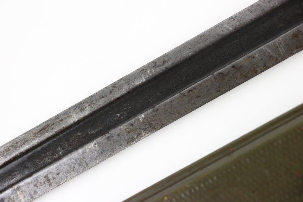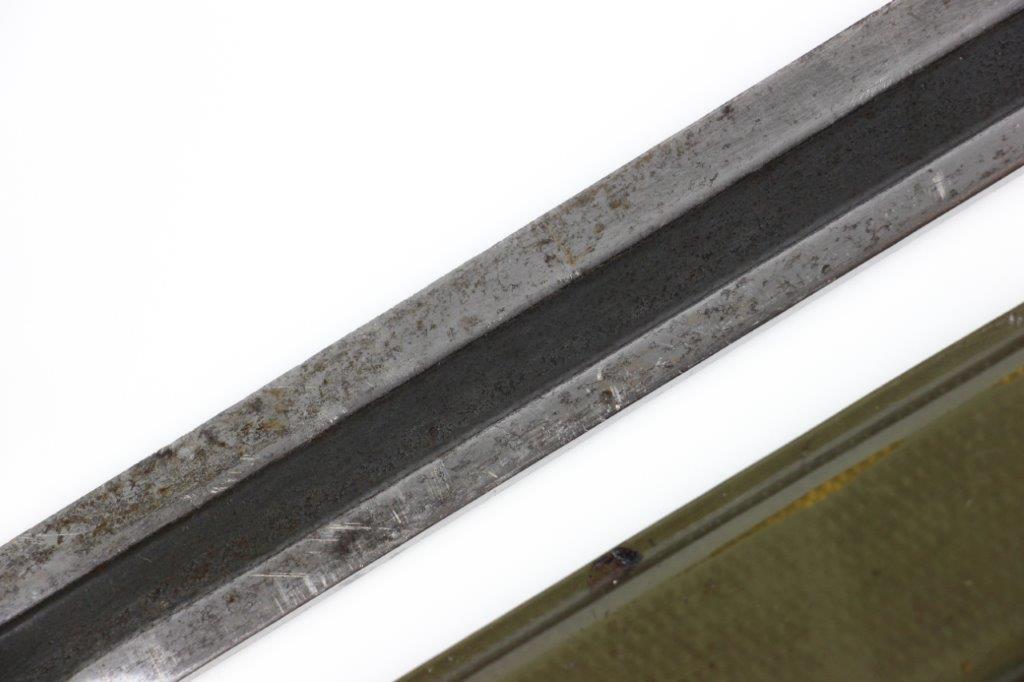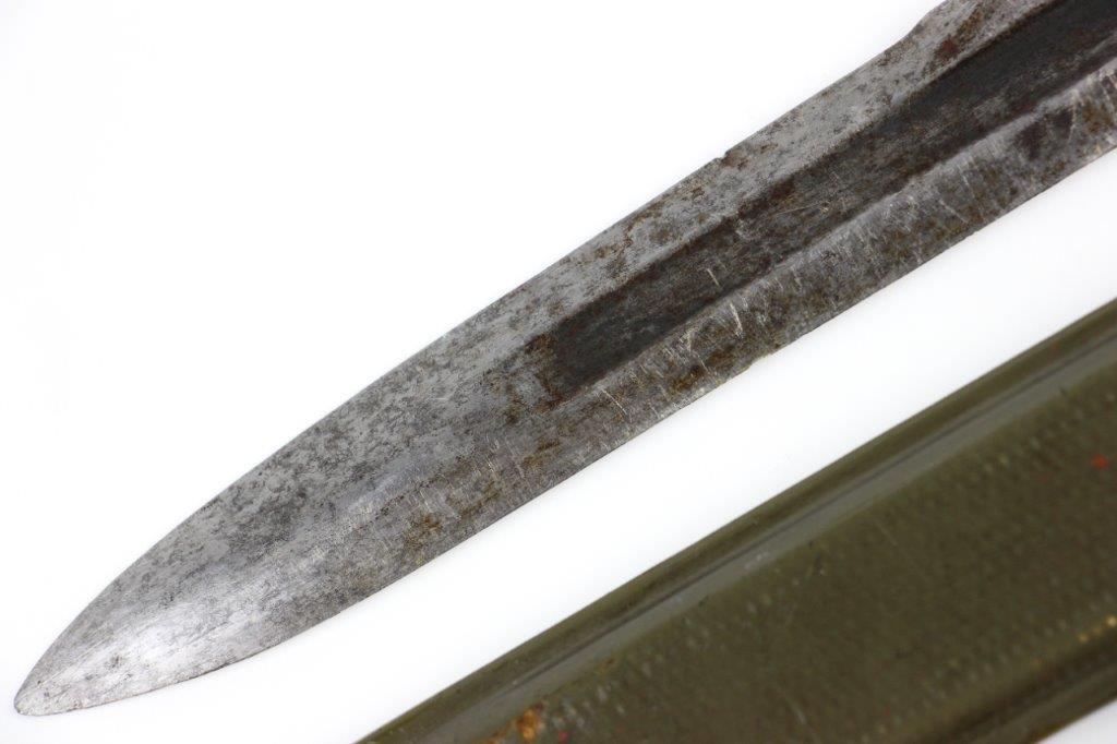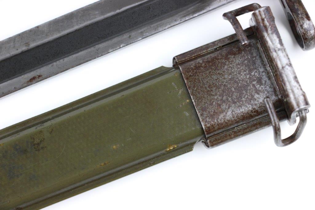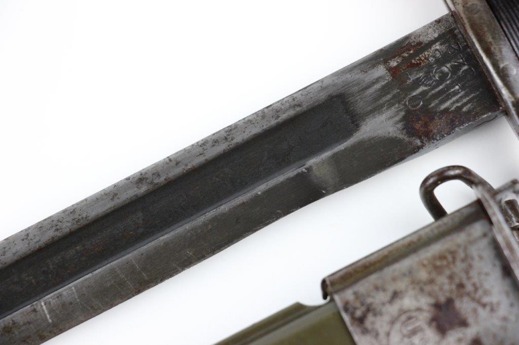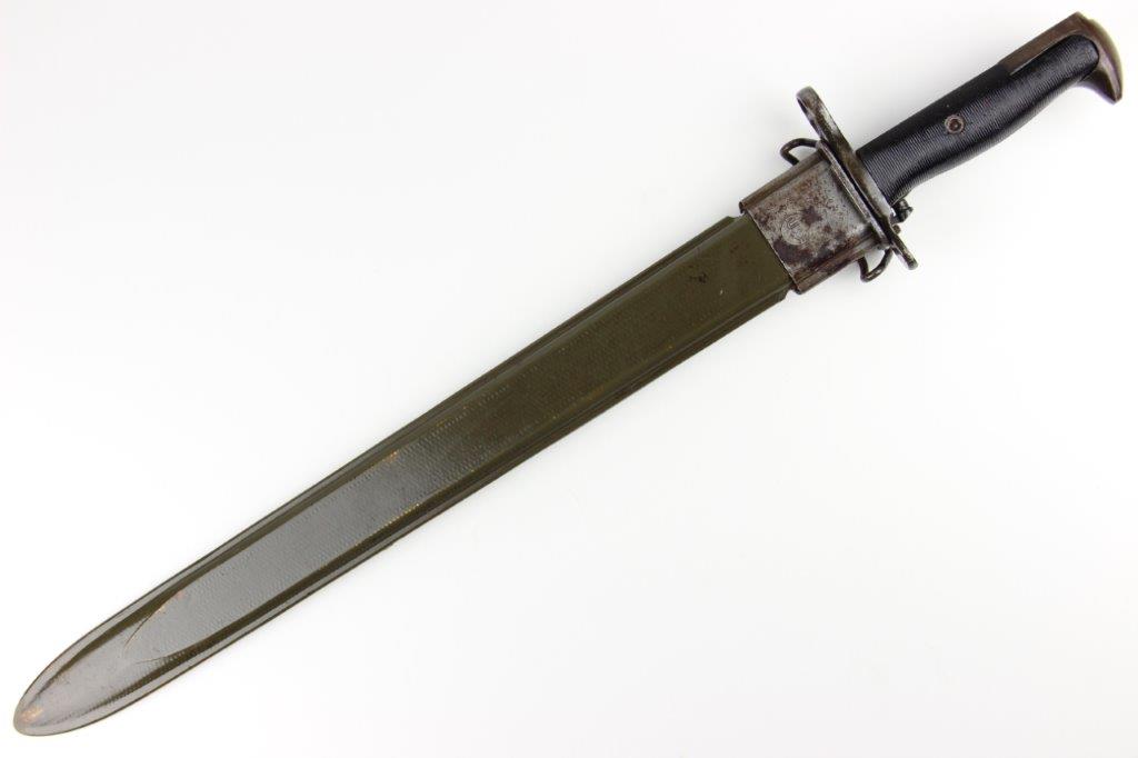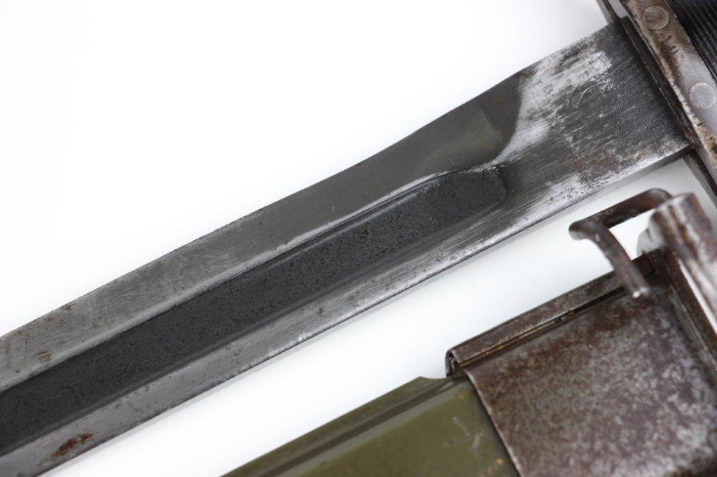 7/15/24 – This is an original, uncut (16 inch blade) M1 Garand bayonet from WW2. The bayonet blade is maker stamped “O L” by Oneida Limited, which is one of the more desirable manufacturers, having only made around 250,000 bayonets during the war. The ricasso is also stamped with a US Ordnance stamp and early 1942 date stamp. The blade has natural surface wear and finish loss throughout; there’s speckling oxidation and mild surface scratches from use and scabbard rub wear. The edge is fairly clean with some mild wear but no major damage or issues. The cross guard, hilt, and pommel have natural browning patina throughout but no rust or pitting. Great condition black grip panels that show light handling wear. Comes with an original scabbard in great overall condition.