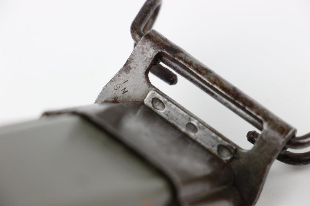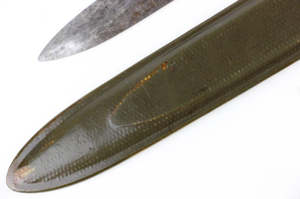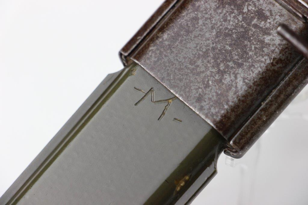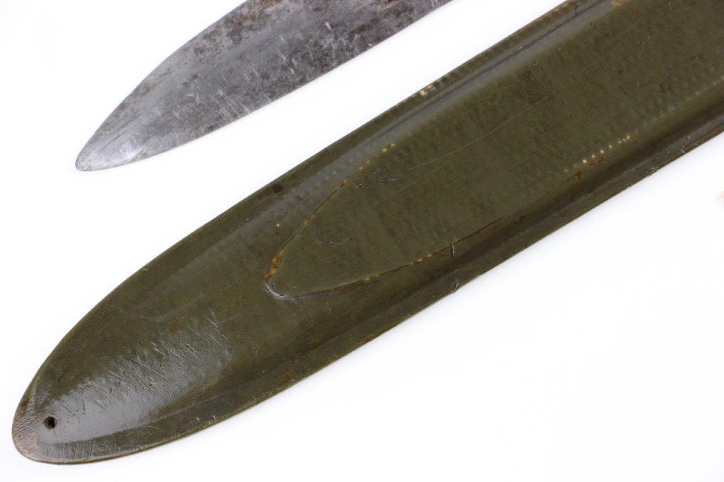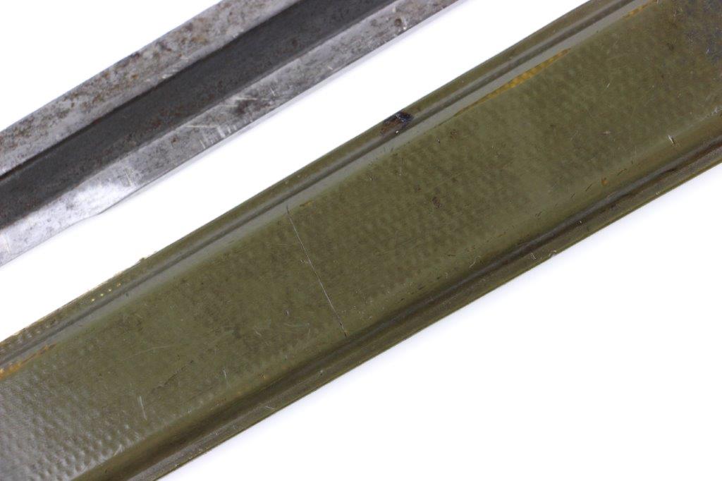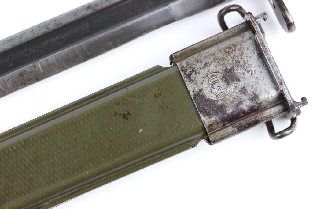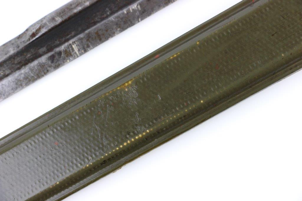 7/15/24 – This is an original, uncut (16 inch blade) M1 Garand bayonet from WW2. The bayonet blade is maker stamped “O L” by Oneida Limited, which is one of the more desirable manufacturers, having only made around 250,000 bayonets during the war. The ricasso is also stamped with a US Ordnance stamp and early 1942 date stamp. The blade has natural surface wear and finish loss throughout; there’s speckling oxidation and mild surface scratches from use and scabbard rub wear. The edge is fairly clean with some mild wear but no major damage or issues. The cross guard, hilt, and pommel have natural browning patina throughout but no rust or pitting. Great condition black grip panels that show light handling wear. Comes with an original scabbard in great overall condition.