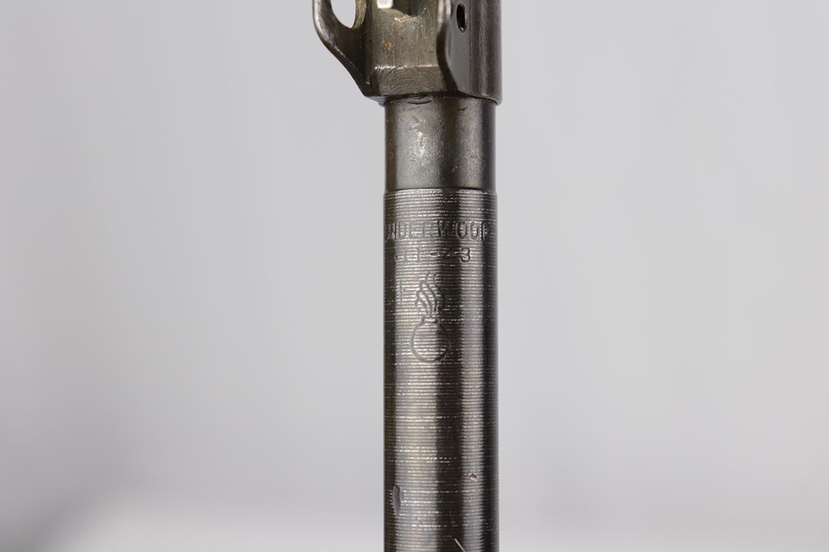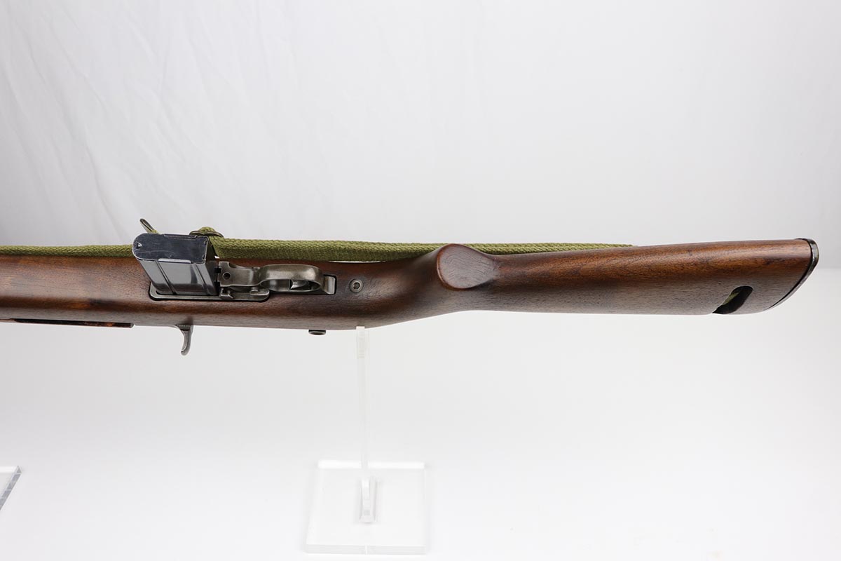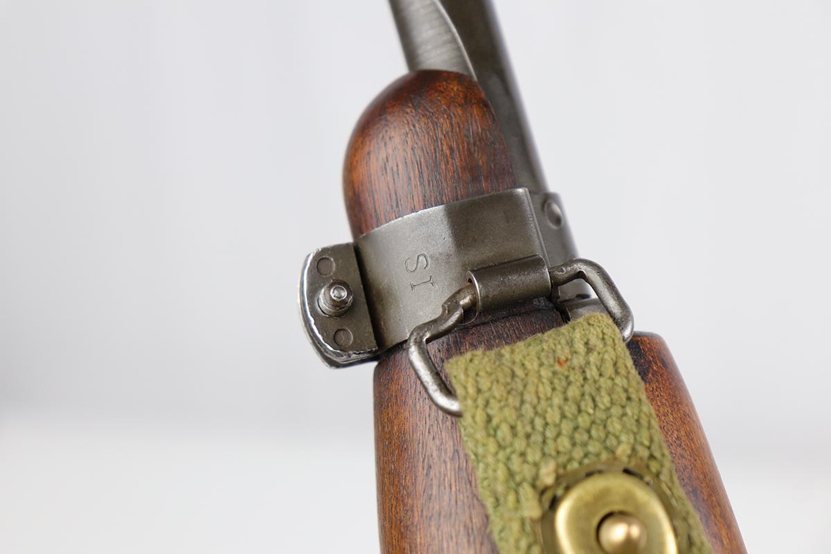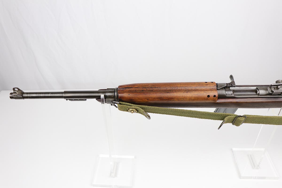 10/2/19 – This is a nice example of an Underwood M1 Carbine from 1943 that was re-worked following the war, likely for Korea. The finish is original and rates at about 90% with a uniform but natural thinning on the receiver and bayonet lug. Receiver and barrel are Underwood marked, and barrel is dated to November of 1943. Stock and handguard are unmarked aside from circle P on the wrist. Front barrel band is ‘IS’ marked. Barrel is very shiny with strong rifling, but there is minor pitting in the forward third of the barrel. ‘IU’ marked magazine. Original sling. Import mark under the barrel.