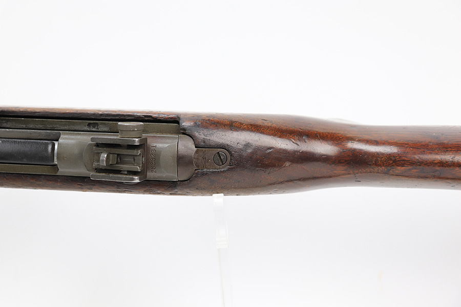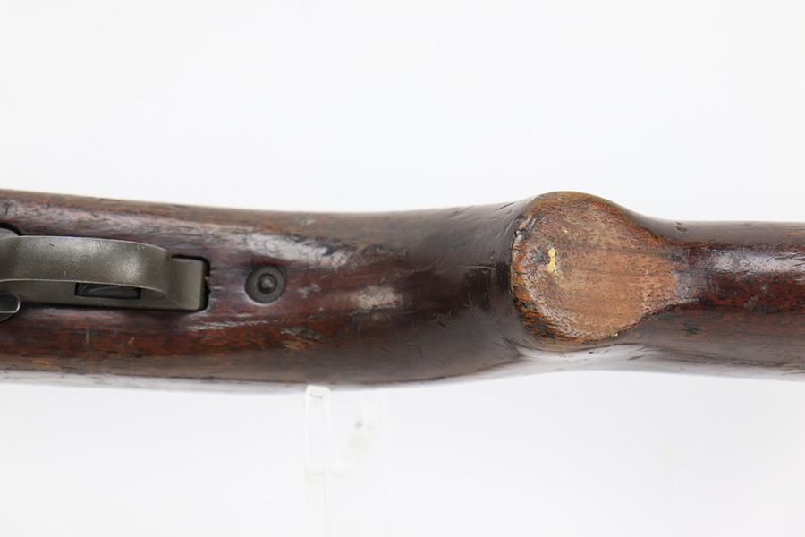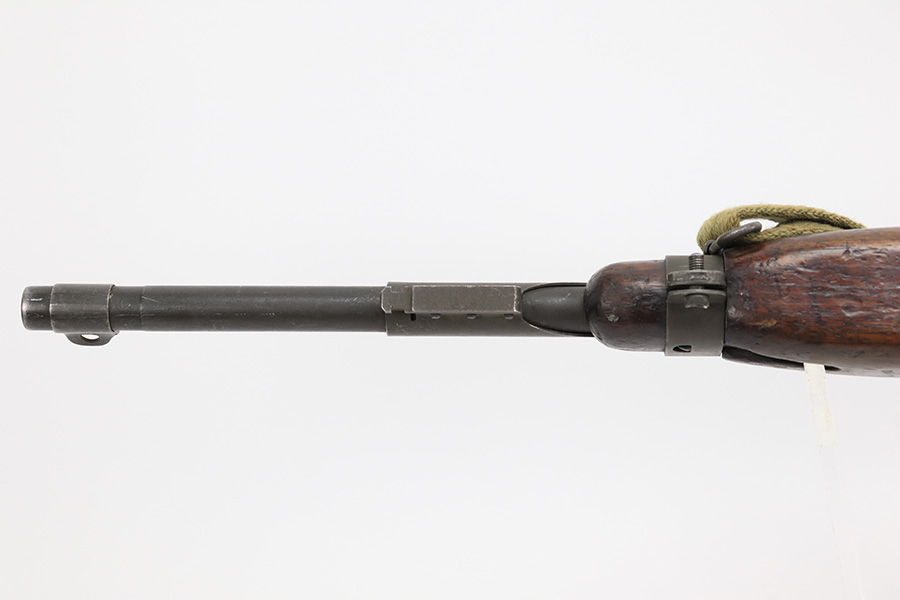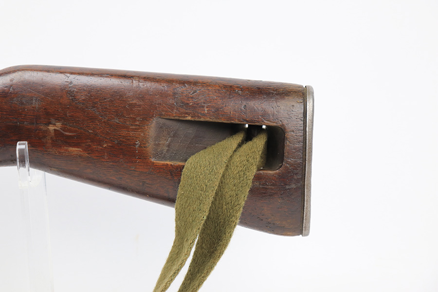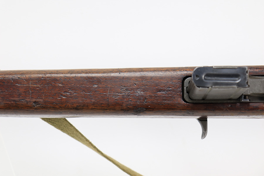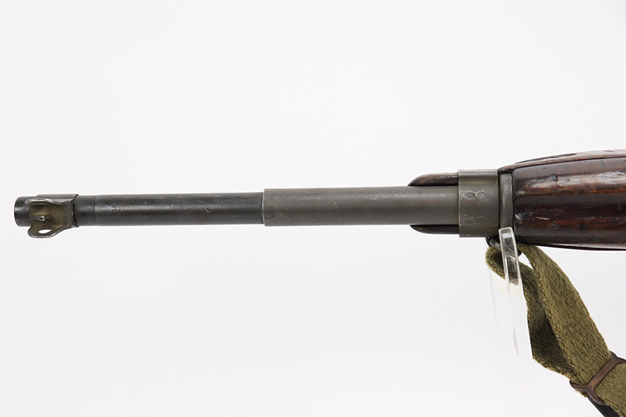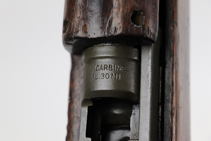 5/10/23 – This is an Underwood M1 Carbine issued to the US military in 1943-44. The barrel is IBM-marked. The stock was made by Winchester and is faintly “W” marked in the sling well. A bayonet lug and an adjustable rear sight were added, likely for re-issue during the Korean War. “Blue Sky” import mark on the left side of the barrel. There is not much finish loss; the metal parts have retained about 97%. There is general minor high edge wear and some very light scuffs along the barrel. There are obvious signs of use on the wood furniture. There are heavy sanding marks on the right side of the butt stock and on the grip cap. The gun comes with an oiler, a fairly worn canvas sling, and a parkerized magazine. The bore is generally shiny with good rifling, but there is some tiny pin-pricking near the muzzle end.