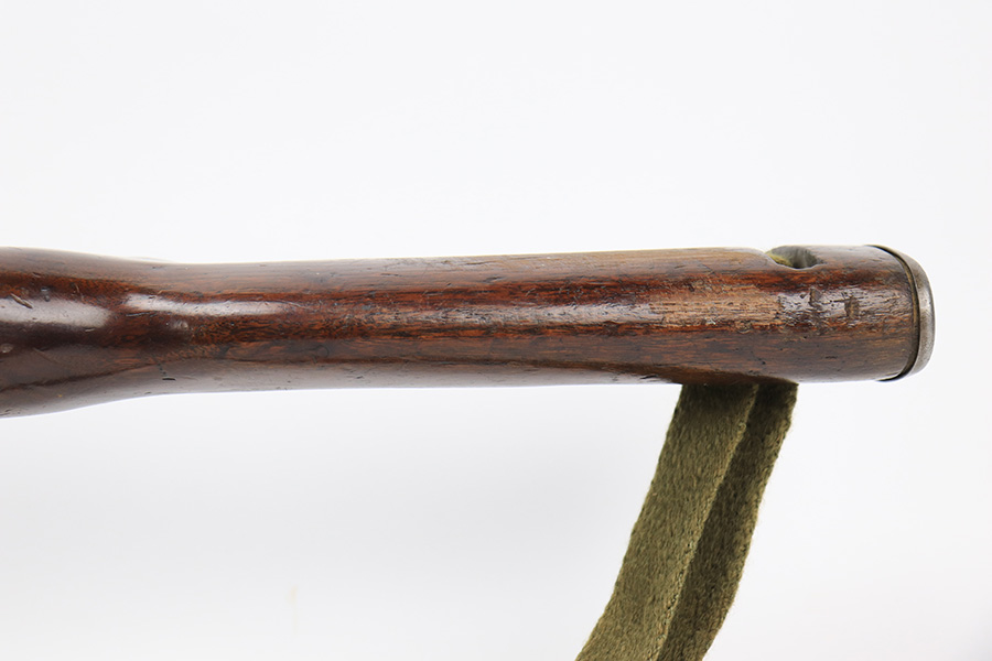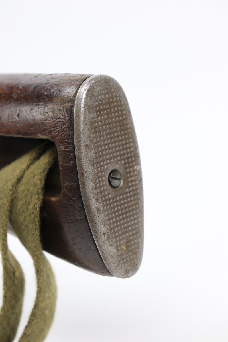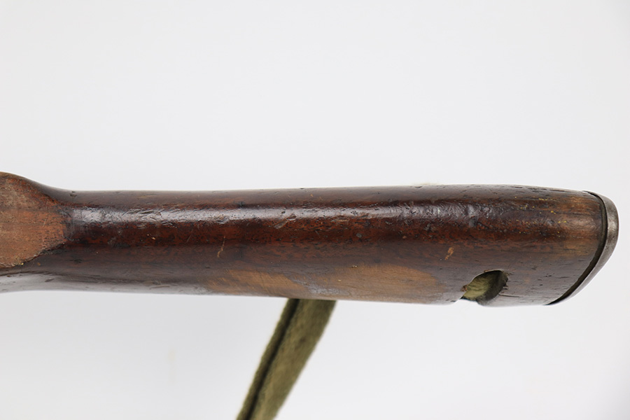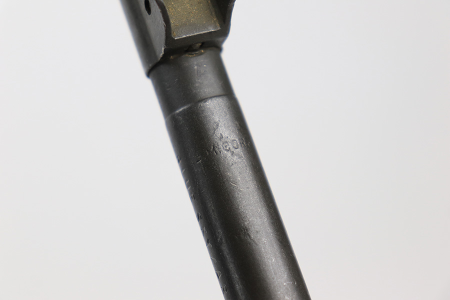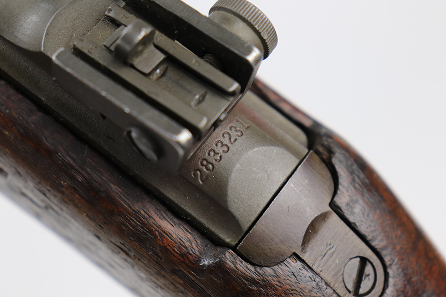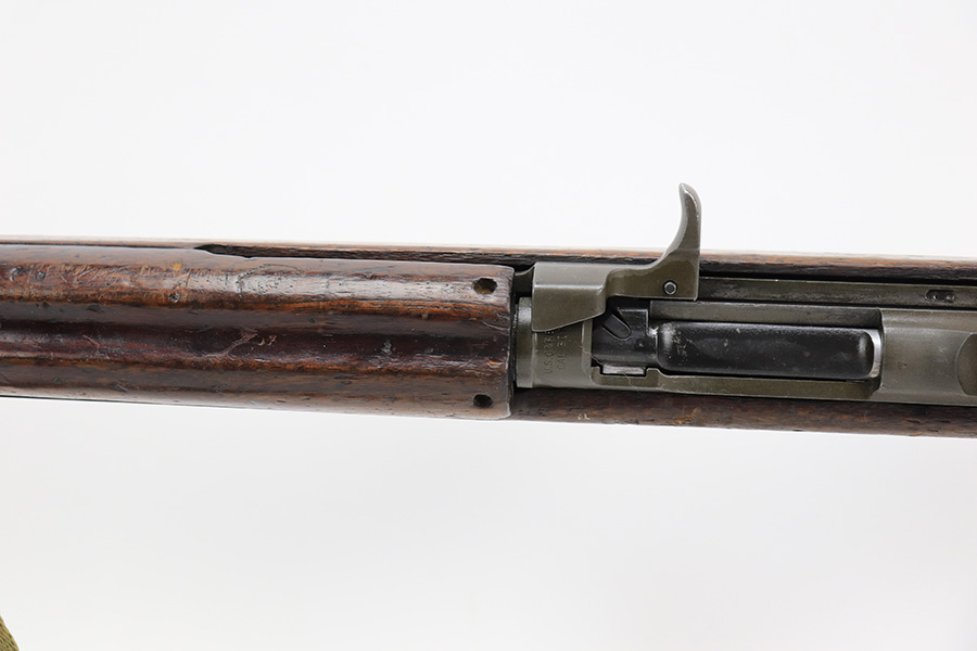 5/10/23 – This is an Underwood M1 Carbine issued to the US military in 1943-44. The barrel is IBM-marked. The stock was made by Winchester and is faintly “W” marked in the sling well. A bayonet lug and an adjustable rear sight were added, likely for re-issue during the Korean War. “Blue Sky” import mark on the left side of the barrel. There is not much finish loss; the metal parts have retained about 97%. There is general minor high edge wear and some very light scuffs along the barrel. There are obvious signs of use on the wood furniture. There are heavy sanding marks on the right side of the butt stock and on the grip cap. The gun comes with an oiler, a fairly worn canvas sling, and a parkerized magazine. The bore is generally shiny with good rifling, but there is some tiny pin-pricking near the muzzle end.