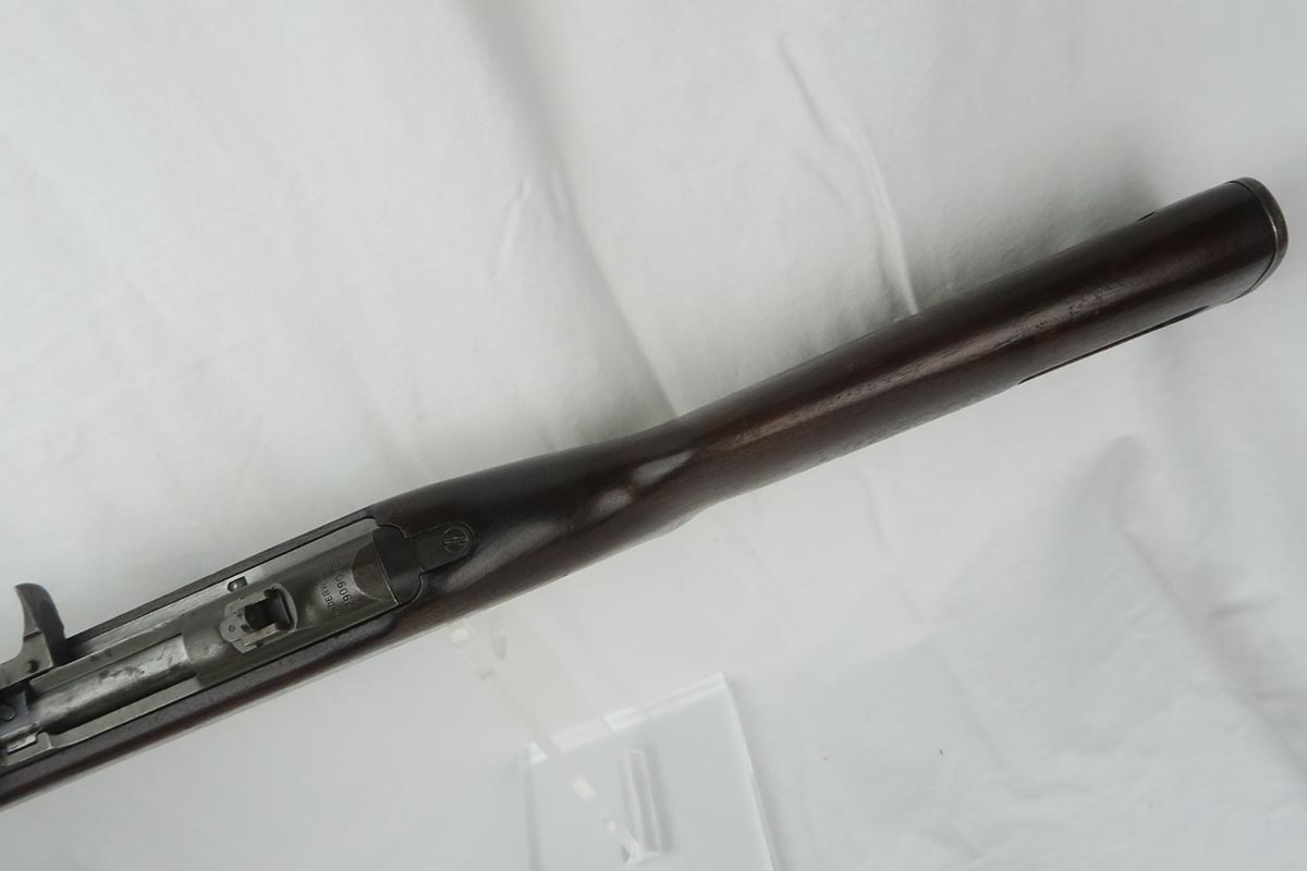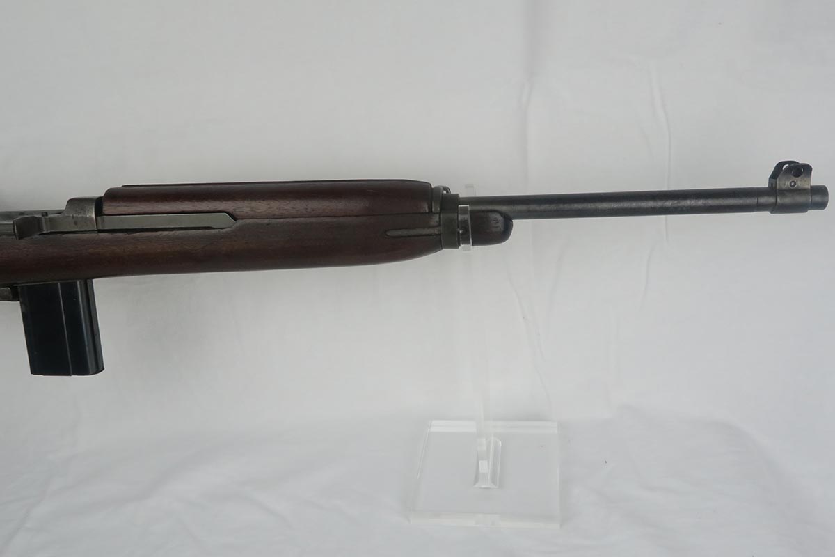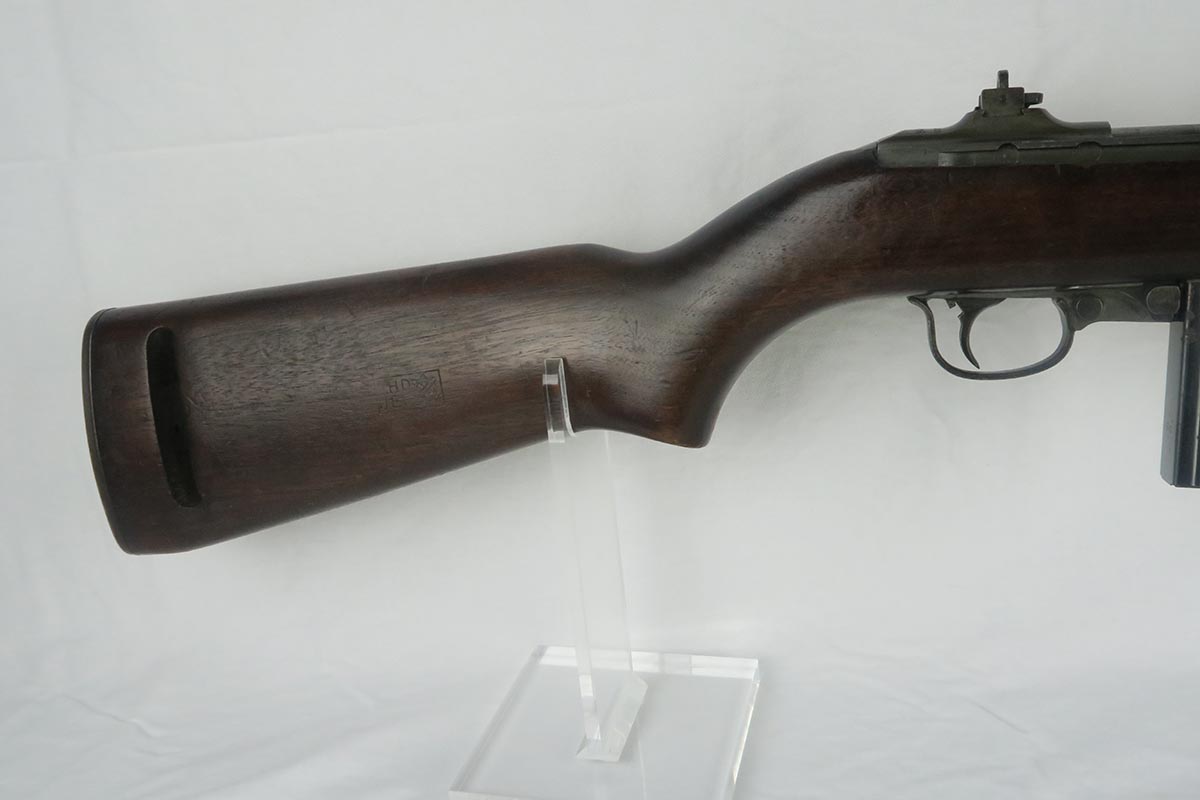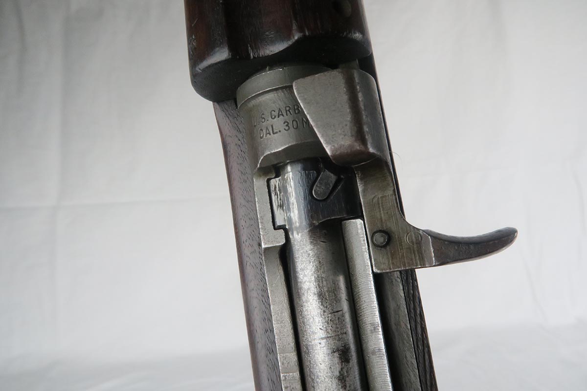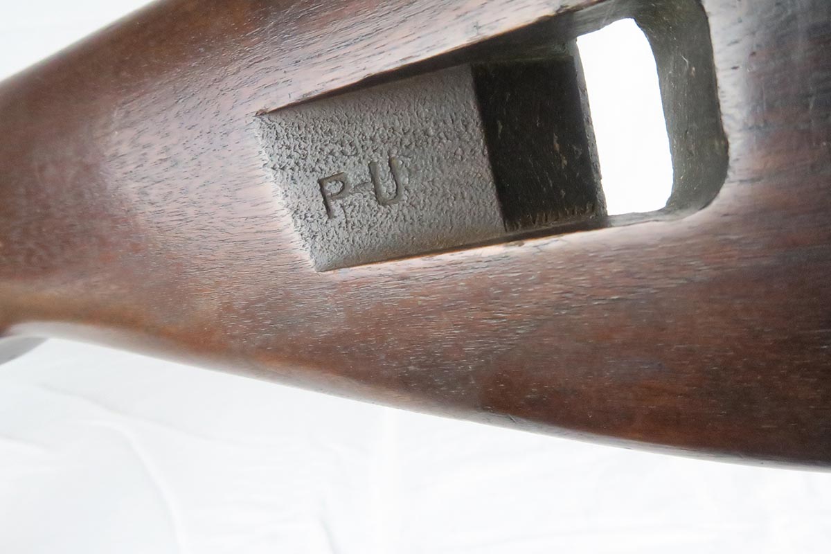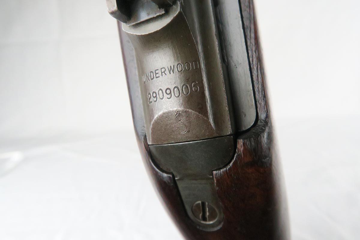 1/8/18 – Underwood Typewriter Corp. made a relatively small number of M1 carbines for World War II.  This one is mid-war and falls in the 2.9 million serial range.  Stock has correct cartouche and inspector proof on right side, and is marked P-U (Underwood) in sling cut.  Low wood, small barrel band.  Correct flip sight is ‘S’ marked.  Excellent bore.  Wartime magazine is marked S-0.  Wood is in pretty good condition but does show some nicks and dings, which is to be expected on used M1 Carbines.  The receiver has a nice parkerized finish but the barrel shows some thinning and patina.