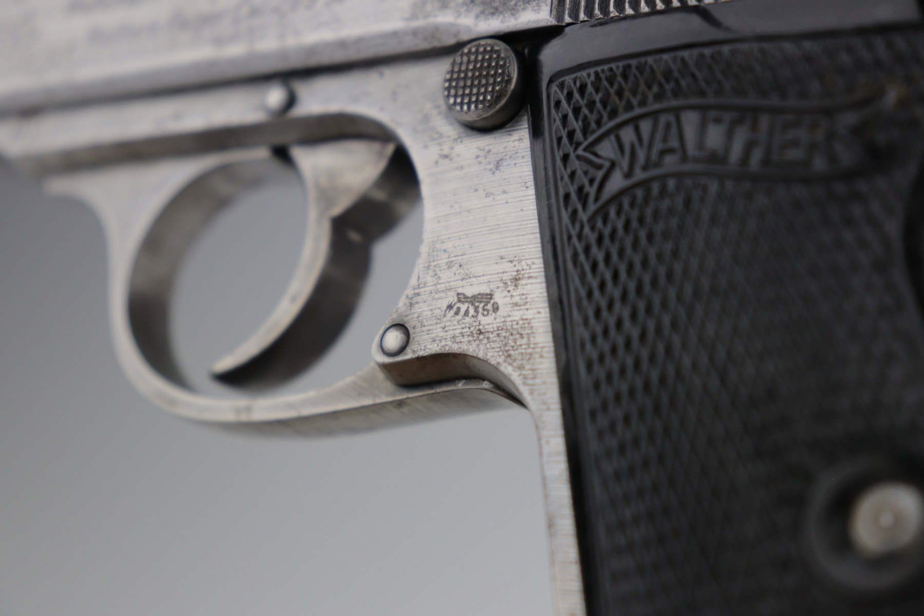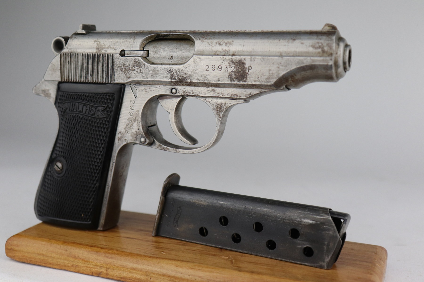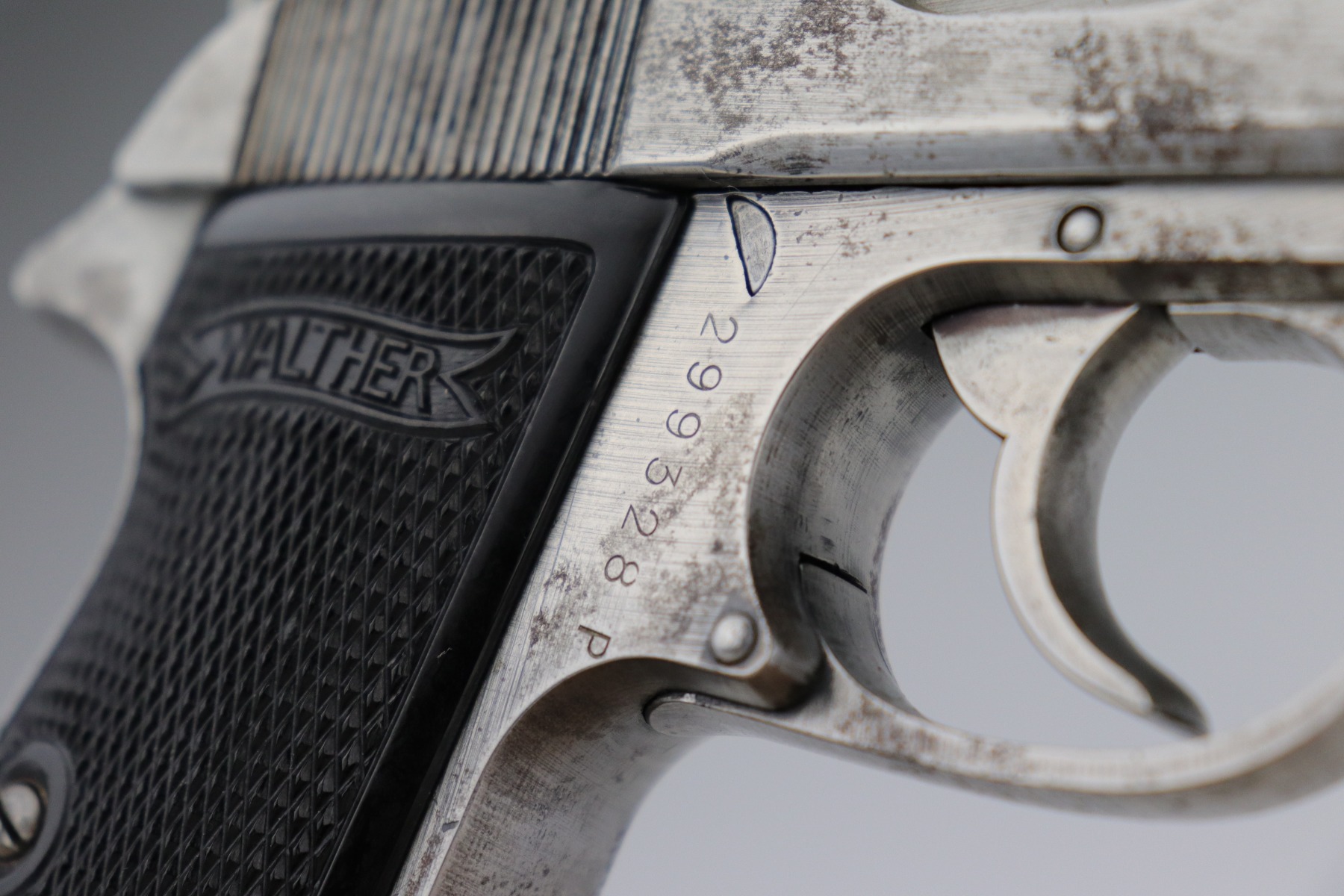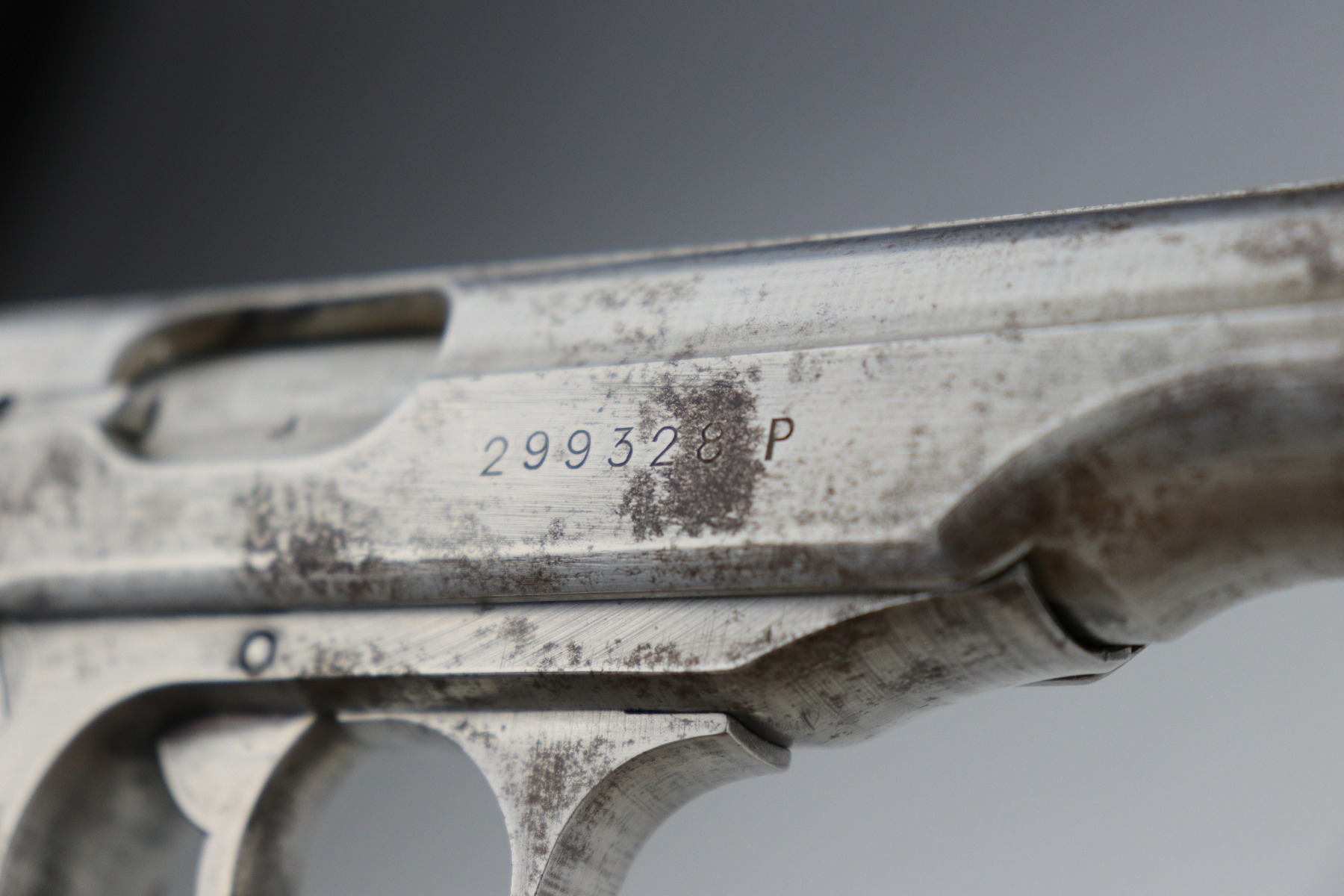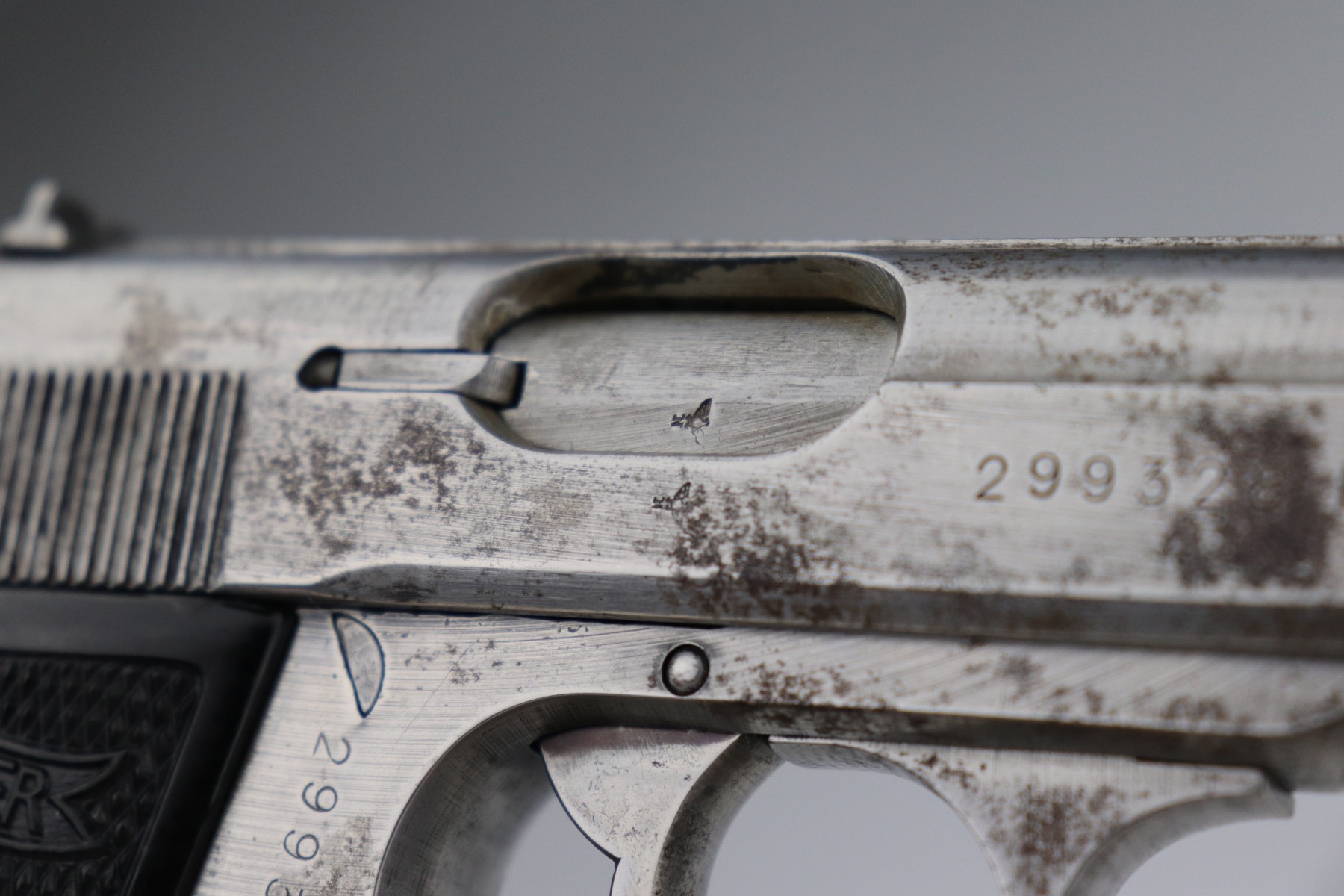 1/5/21 – This is a Walther PP issued to the Nazi military in about 1942-43. This particular gun is interesting because it has the proper “Waffen 359” military proofs, but the metal was never blued or finished, giving it a chrome look. It is all matching and original. The gun is difficult to rate because there is no finish. But the metal is in good condition with spotty oxidation throughout. It comes with excellent grips and a blued wartime magazine. The bore is near-mint.