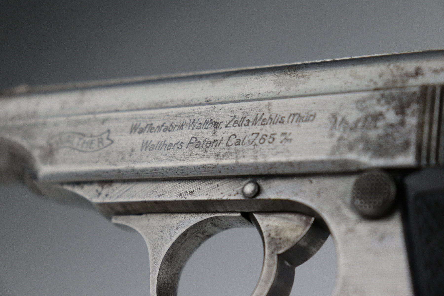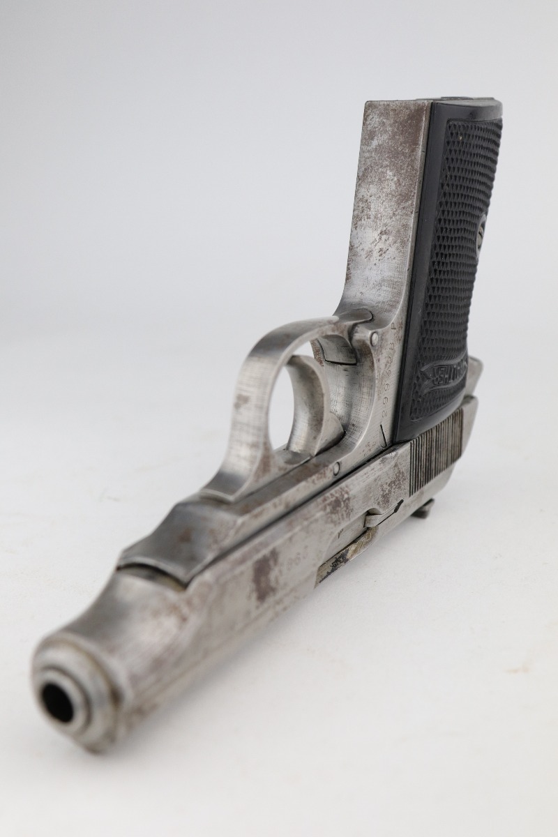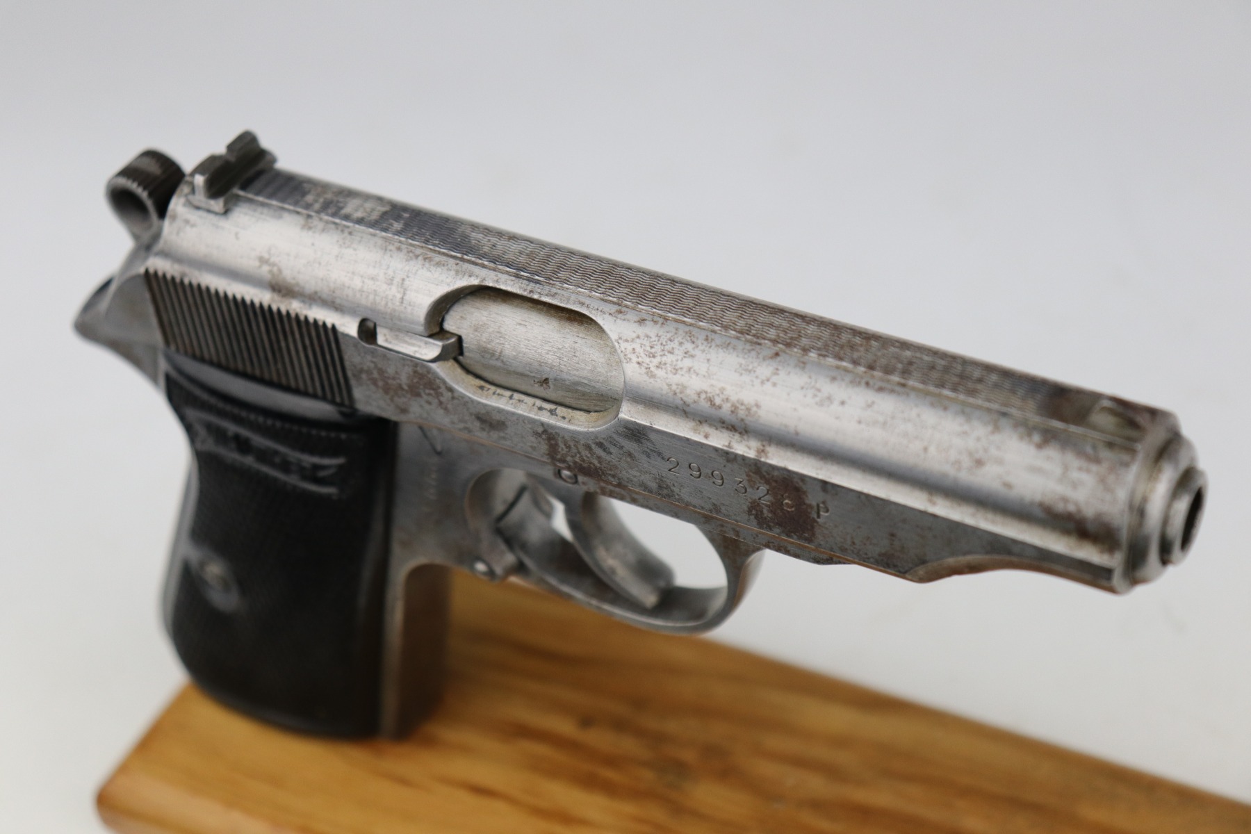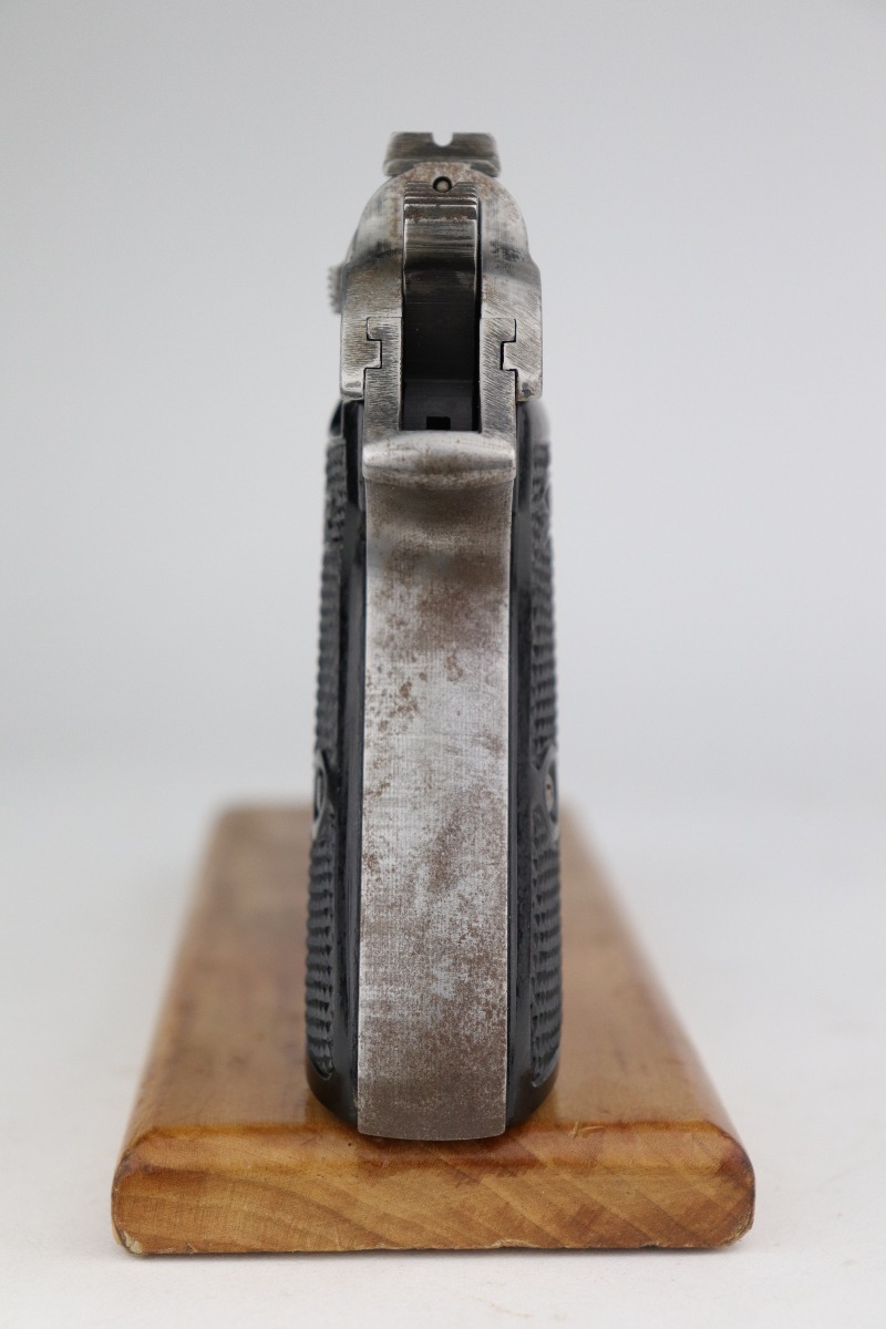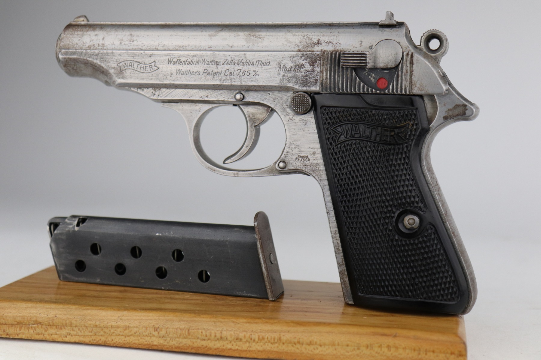 1/5/21 – This is a Walther PP issued to the Nazi military in about 1942-43. This particular gun is interesting because it has the proper “Waffen 359” military proofs, but the metal was never blued or finished, giving it a chrome look. It is all matching and original. The gun is difficult to rate because there is no finish. But the metal is in good condition with spotty oxidation throughout. It comes with excellent grips and a blued wartime magazine. The bore is near-mint.