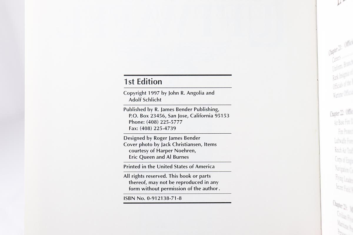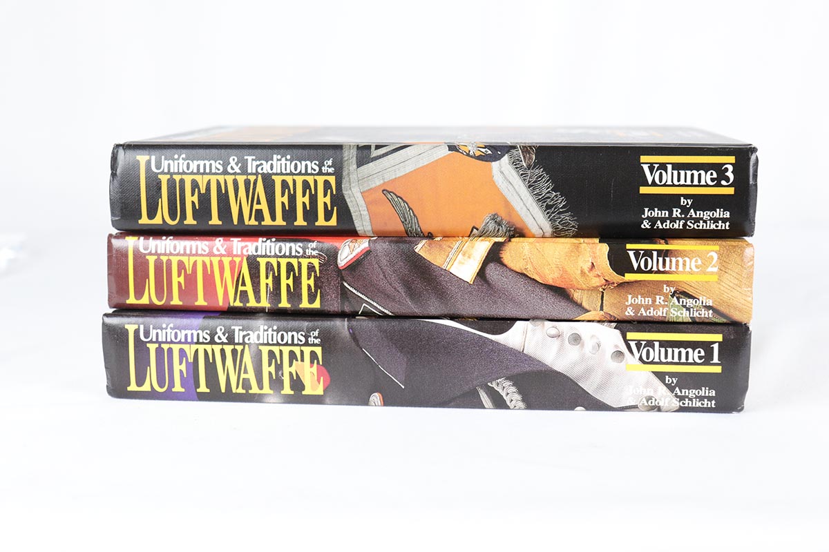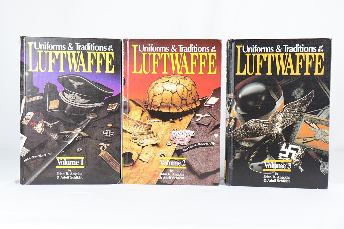 2/22/18 – This is a near-mint and full set of the 3-volume “Uniforms & Traditions of the Luftwaffe” book series.  This is a set of 1st edition prints, and these books are rare and out of print, so nearly impossible to find in this complete and excellent condition.  Written by John R. Angolia & Adolf Schlicht.