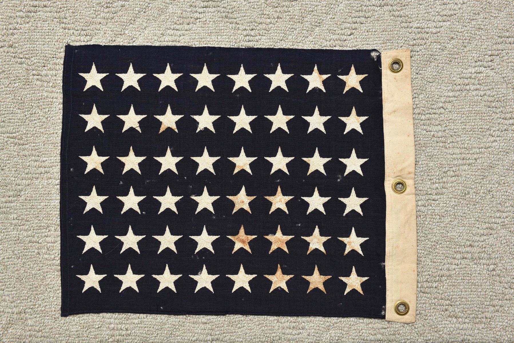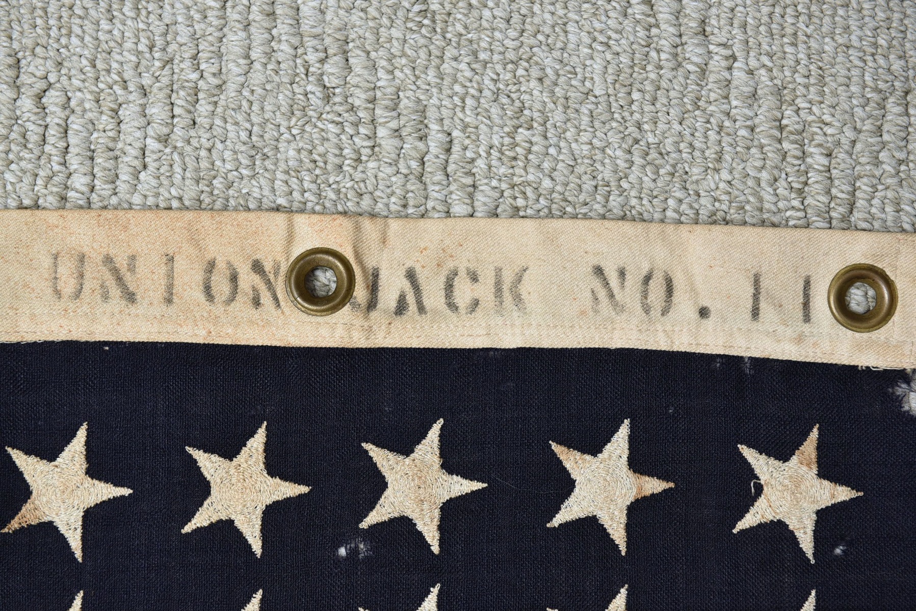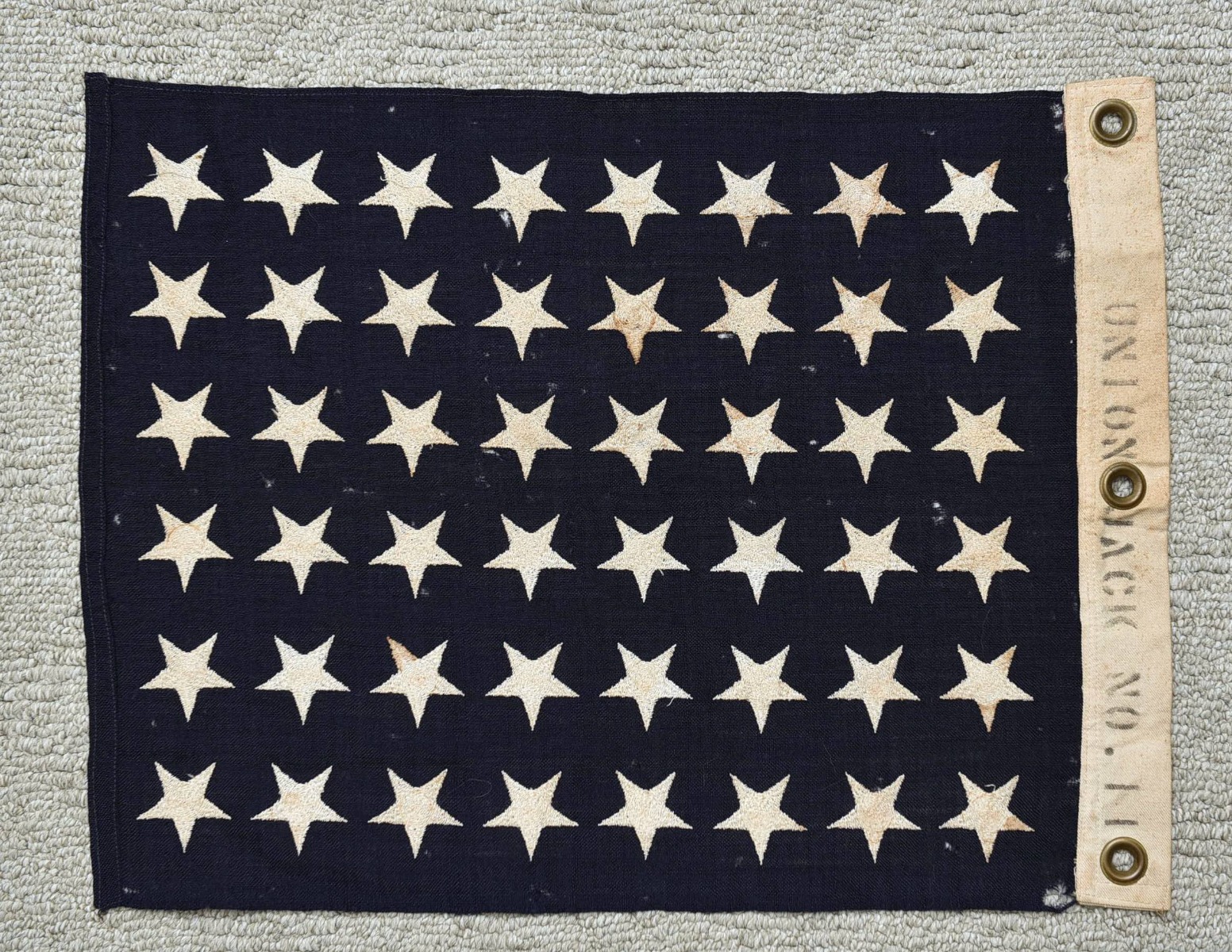 8/19/21 – This is an old, pre WW2 Union Jack No. 11 Canton Flag. Great condition with some natural aging / yellowing and some small holes in the linen throughout. Measures 19×14.5 inches. Each star is individually sewn.