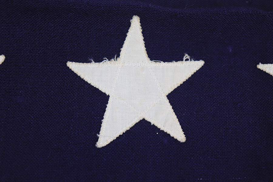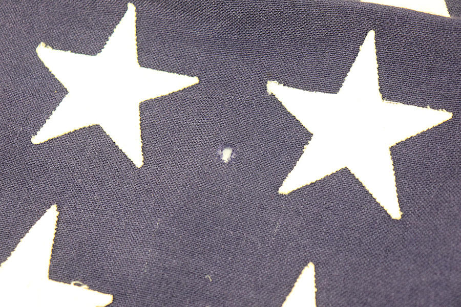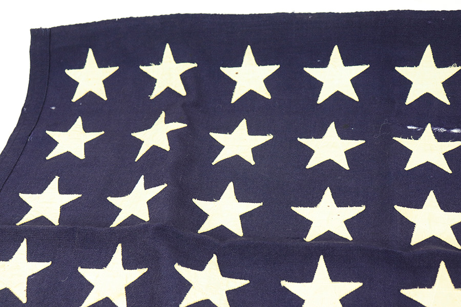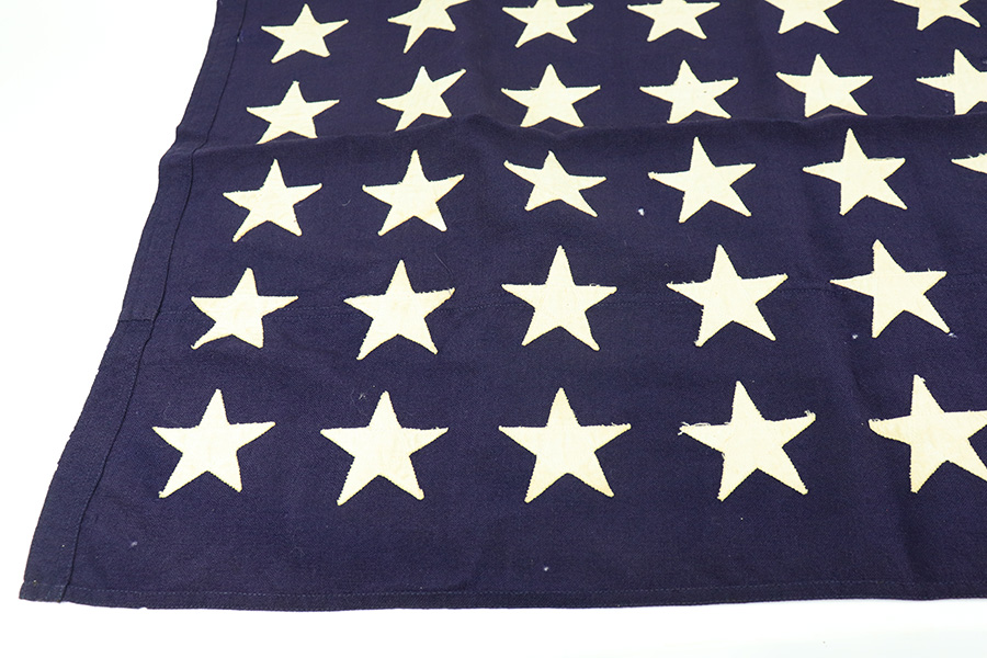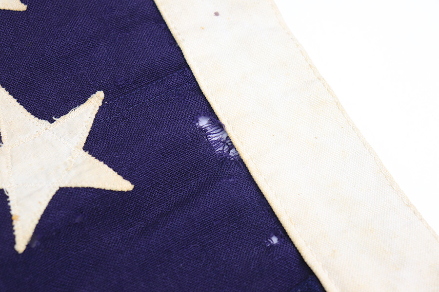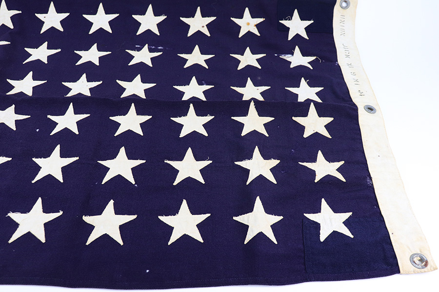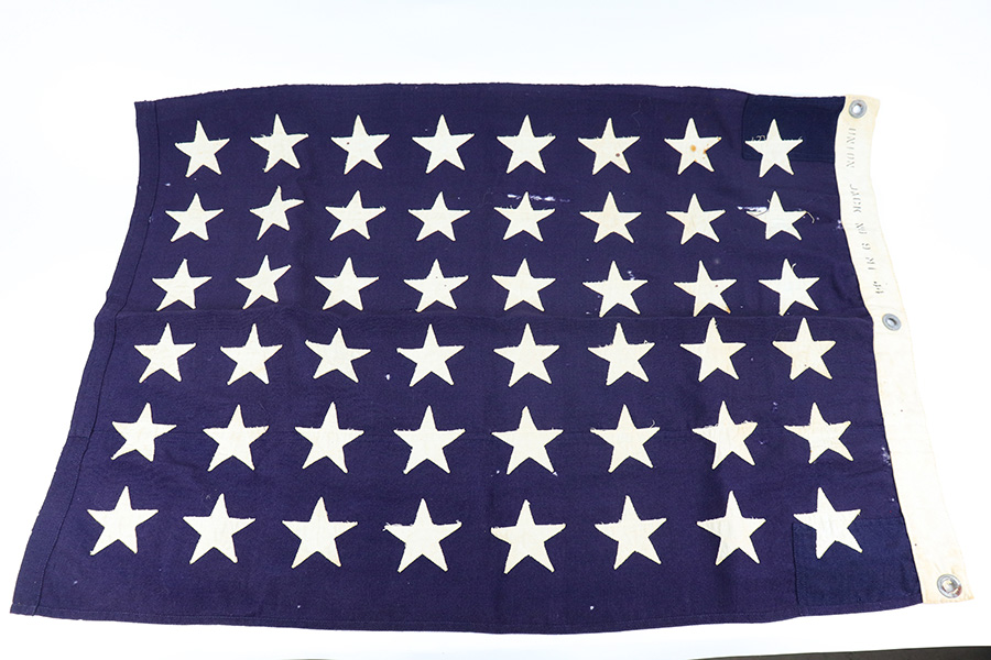 12/1/21 – This is an original US WW2 Navy Canton flag. The flag has 48 stars and measures approximately 36 x 25 inches. The flag is maker marked “Union Jack No 9 MI 44”. The stars are sewn-on and in great condition. There are multiple small holes and minor tares in the cloth. Most of the stars are clean but some have mild yellowing. Mostly in tact and in very good overall condition.