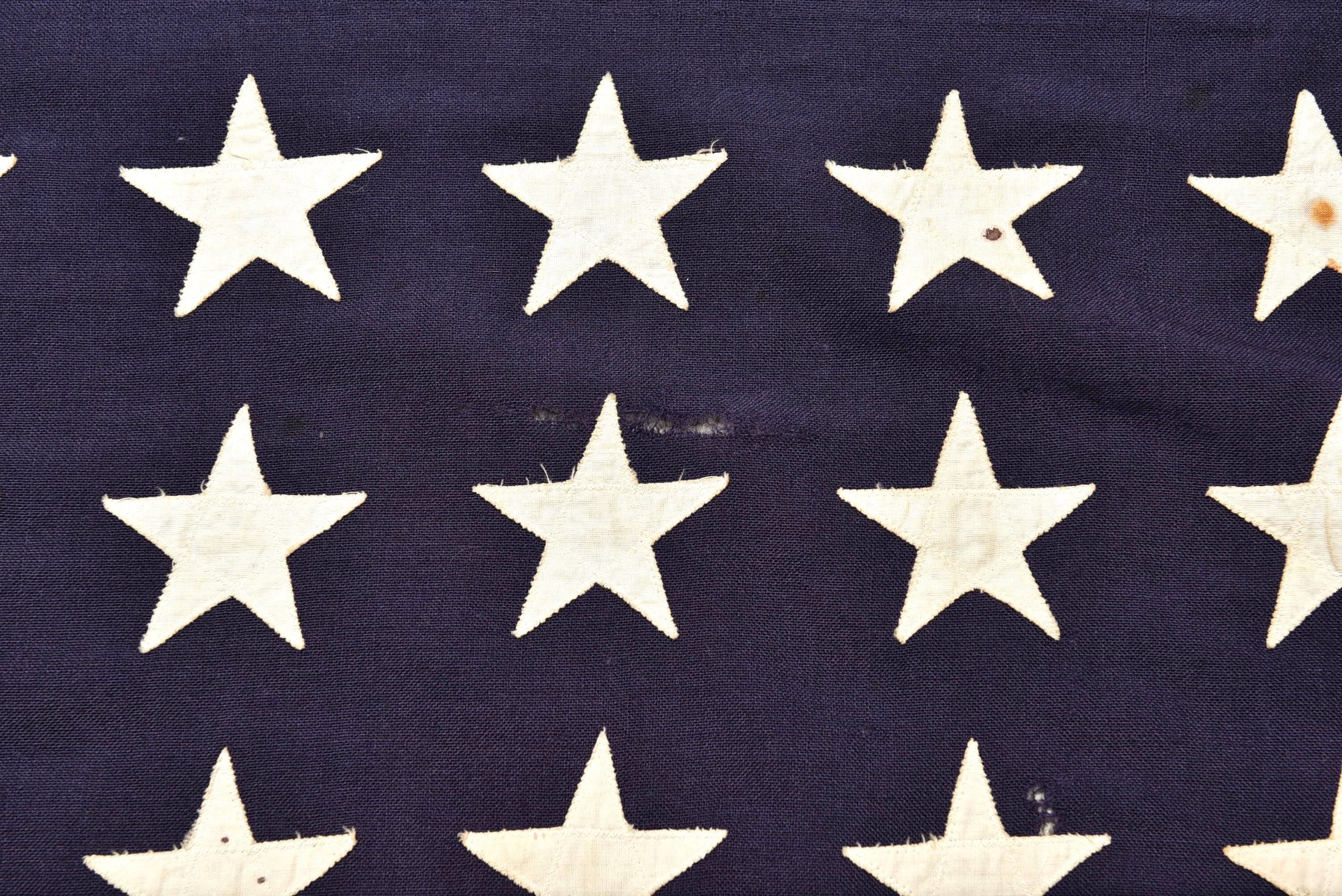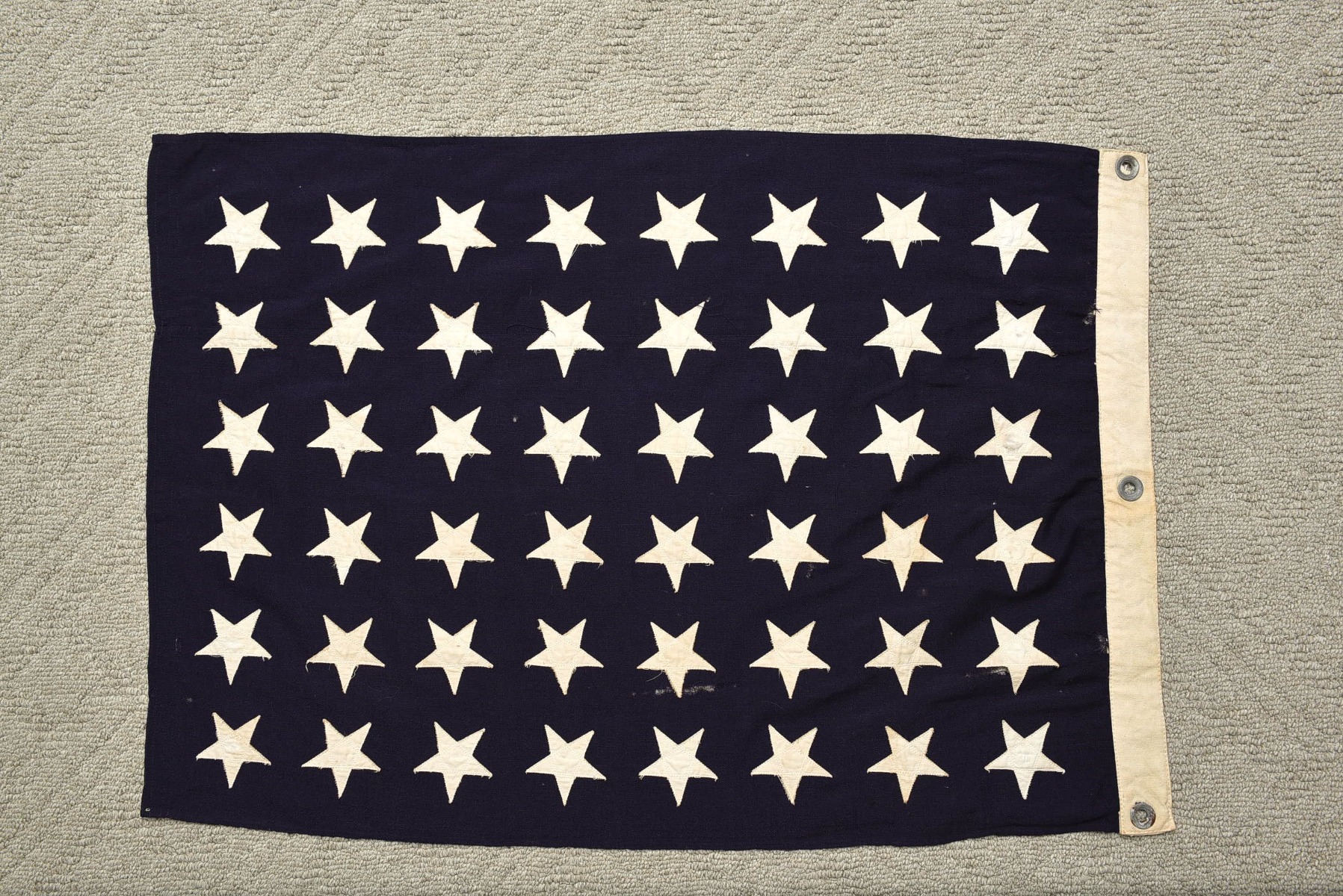 8/12/21 – This is an original US WW2 Navy Canton flag. The flag has 48 stars and measures approximately 33 x 22 inches. The flag is maker marked “Union Jack No 9 MI 44”. The stars are sewn-on and in great condition. There are multiple small holes and minor tares in the cloth. Most of the stars are clean but some have mild yellowing. Mostly in tact and in good overall condition.