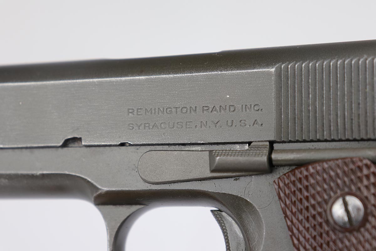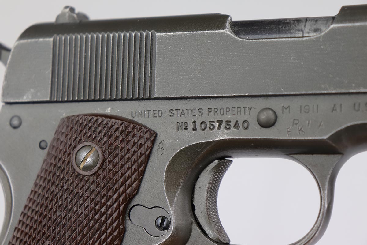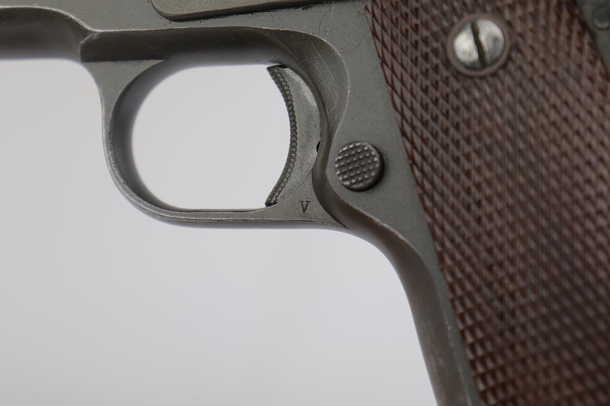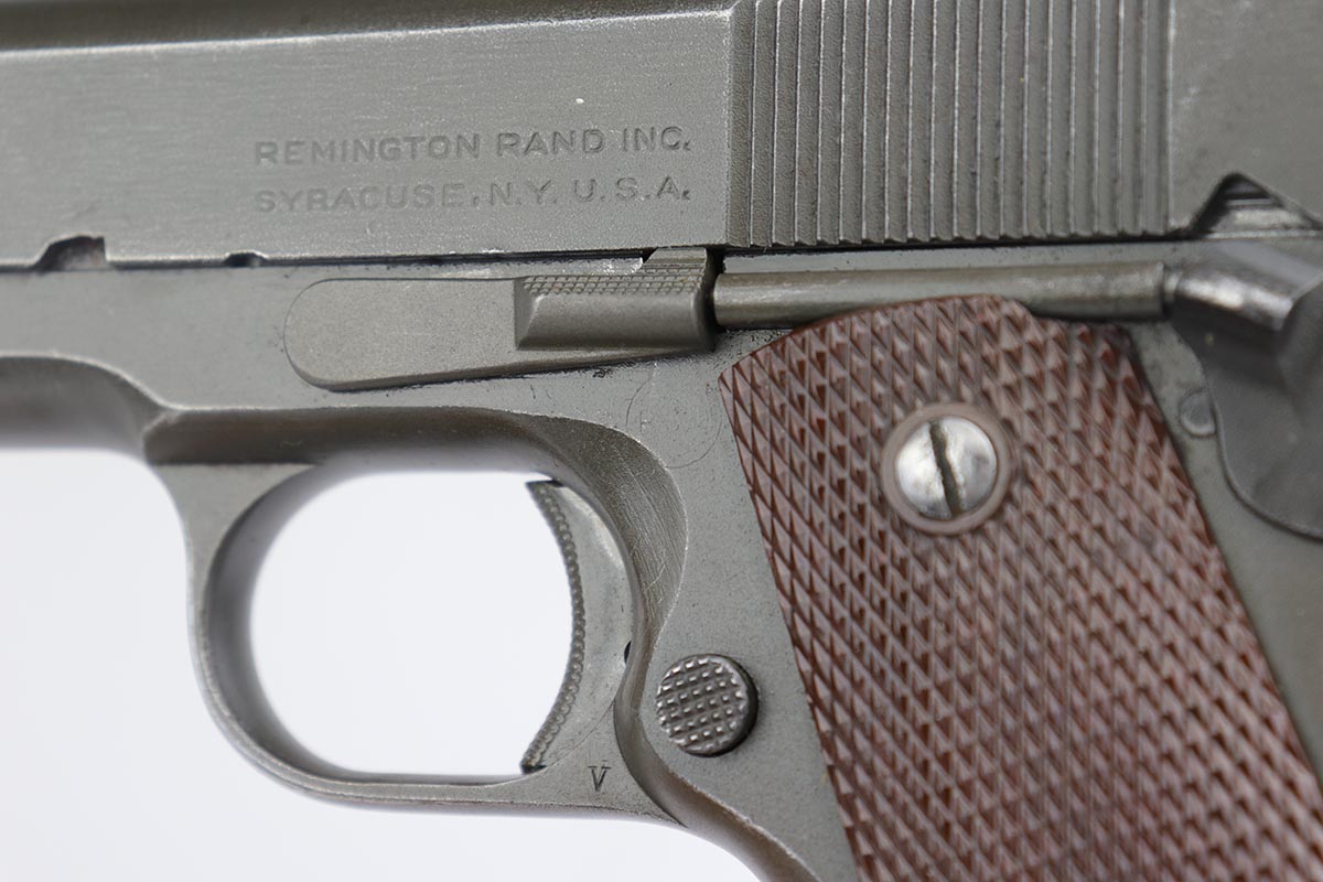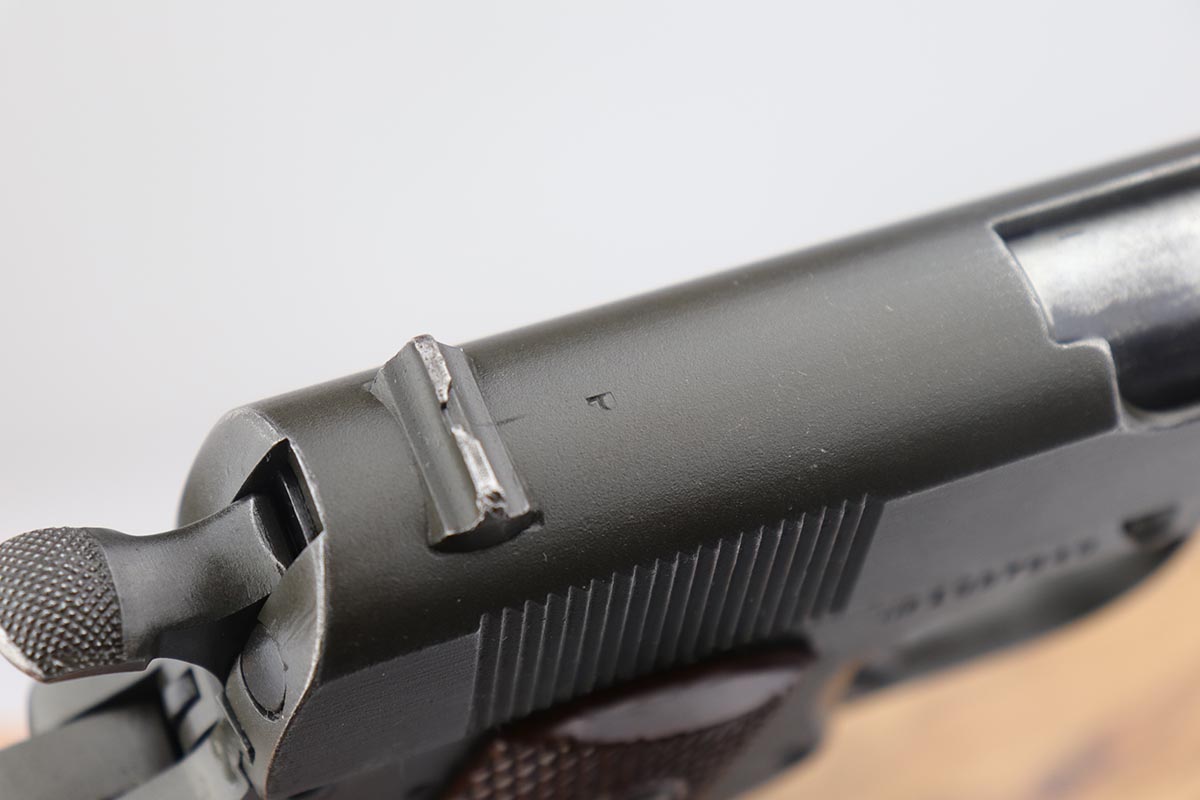 4/11/19 – This is a World War II era 1911A1 re-work, with Rock Island Arsenal proofs on frame. The frame is an original Union Switch & Signal production, and the slide is an original Remington slide. The finish is uniform and rates at about 92-94%, with the majority of finish loss on the front strap. Bore has strong rifling but minor frost/freckling in the grooves. Post-war magazine. HS barrel.