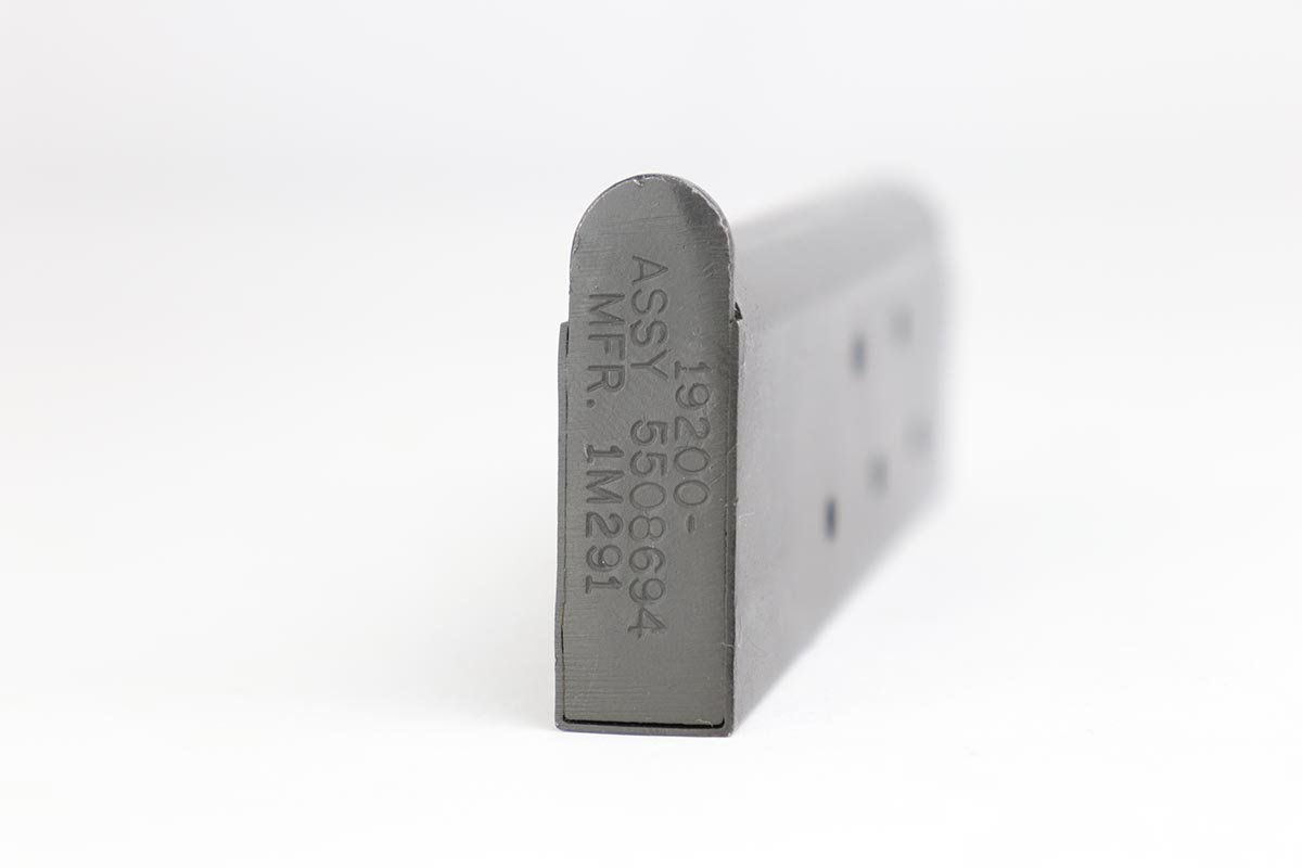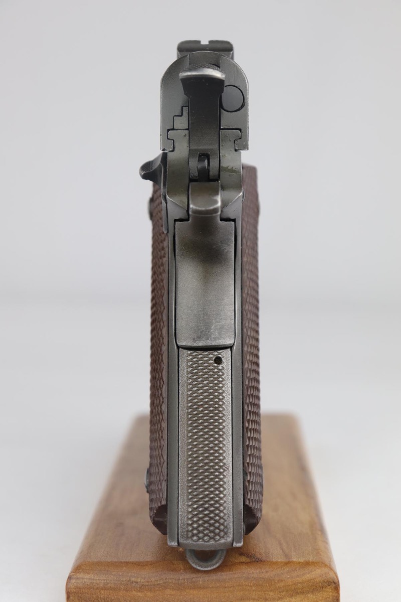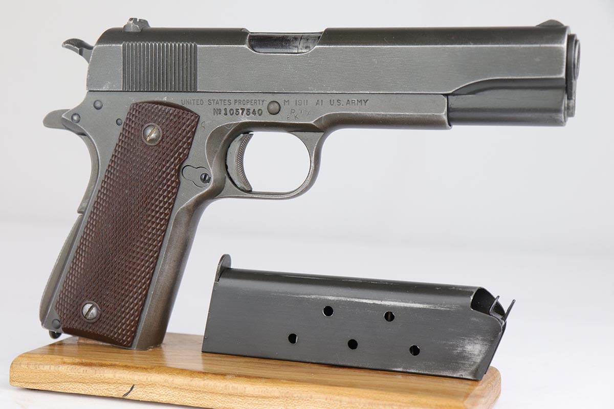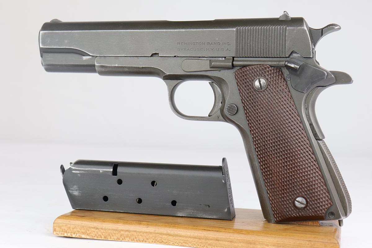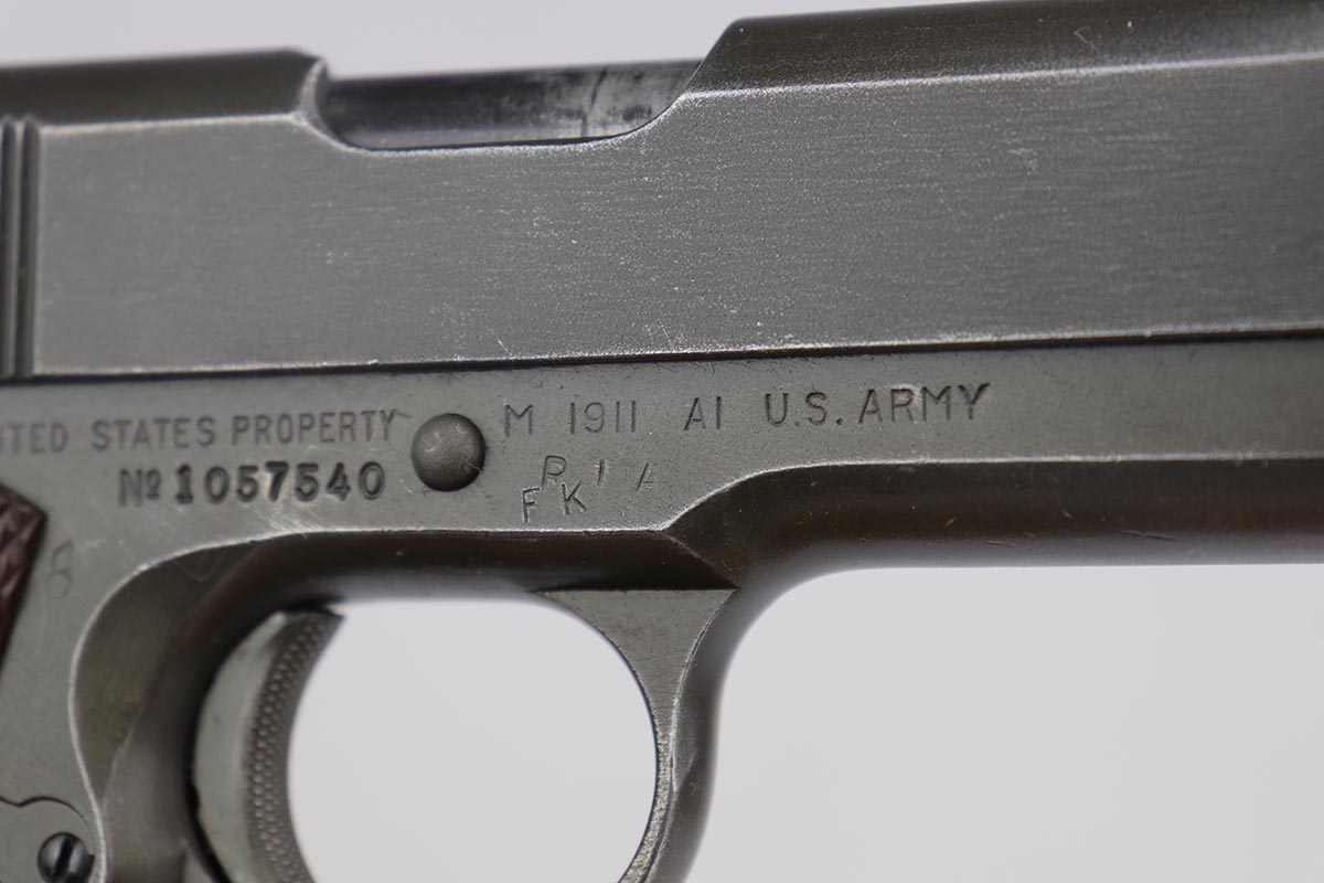 4/11/19 – This is a World War II era 1911A1 re-work, with Rock Island Arsenal proofs on frame. The frame is an original Union Switch & Signal production, and the slide is an original Remington slide. The finish is uniform and rates at about 92-94%, with the majority of finish loss on the front strap. Bore has strong rifling but minor frost/freckling in the grooves. Post-war magazine. HS barrel.