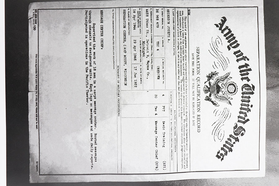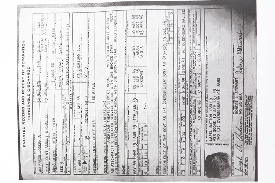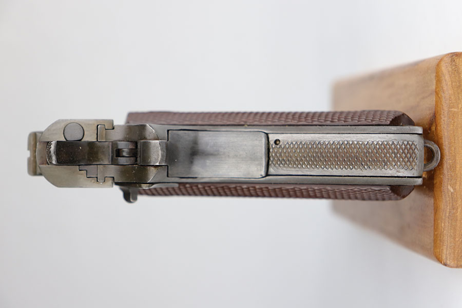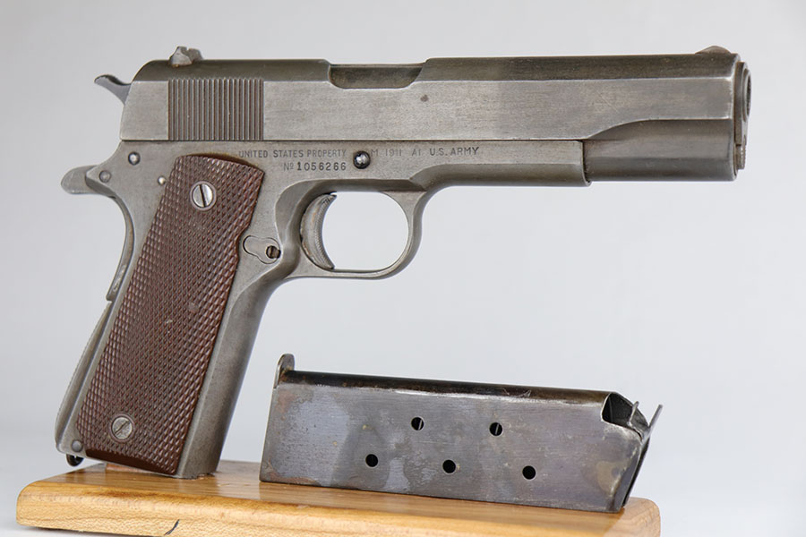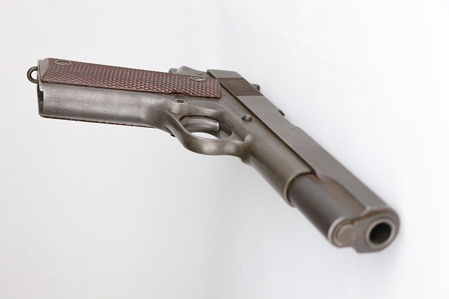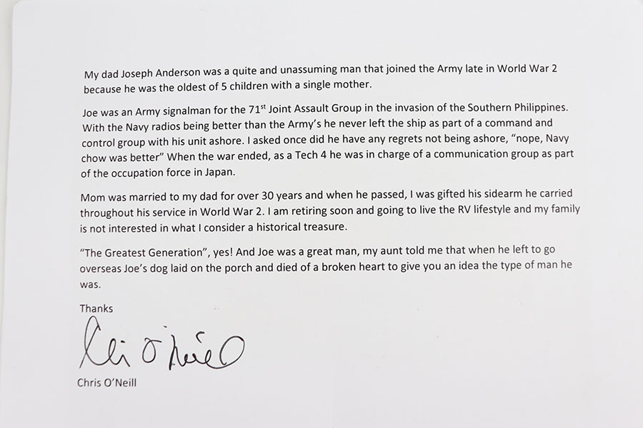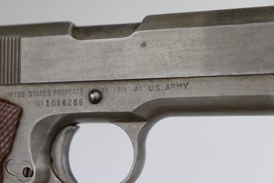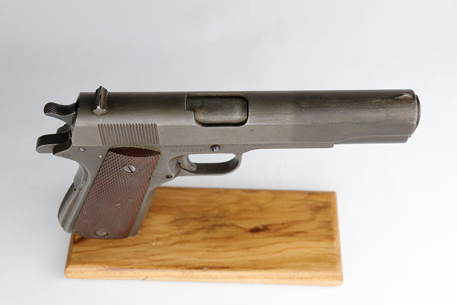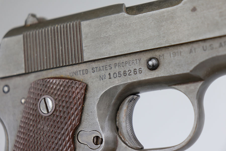 6/19/20 – This is a scarce Union Switch & Signal 1911A1 that comes to us from the son of the vet that carried it! Joseph Anderson was an Army signalman for the 71st Joint Assault Group in the invasion of the South Philippines. The listing is accompanied by a brief letter about Mr. Anderson, as well as some photos of him and his honorable discharge paperwork. The gun itself has lots of character and feels especially authentic. It’s thinning and browning throughout, but appears to have all the original parts. HS barrel with a minty bore. Concentric circles on the barrel bushing. Excellent grips. ‘A’ marking on magazine.