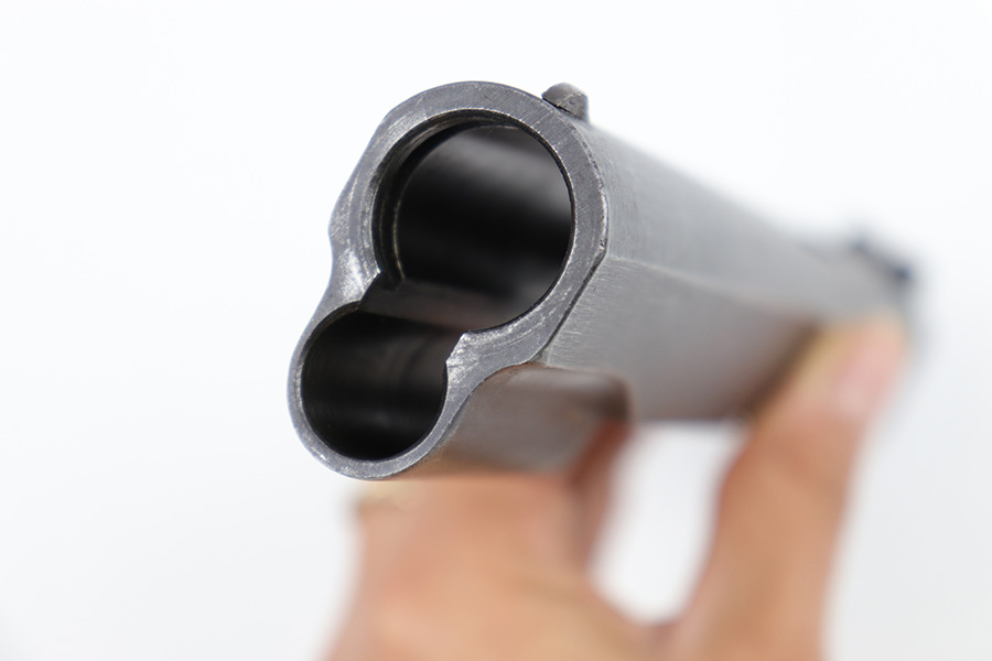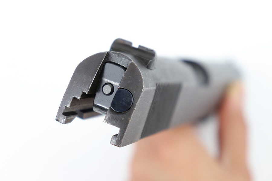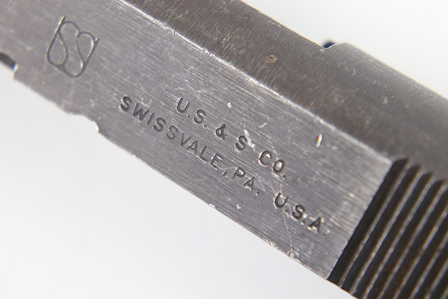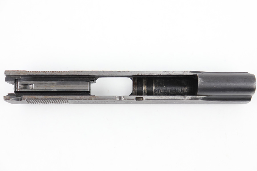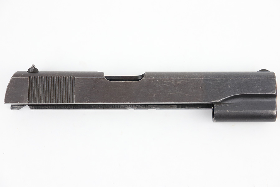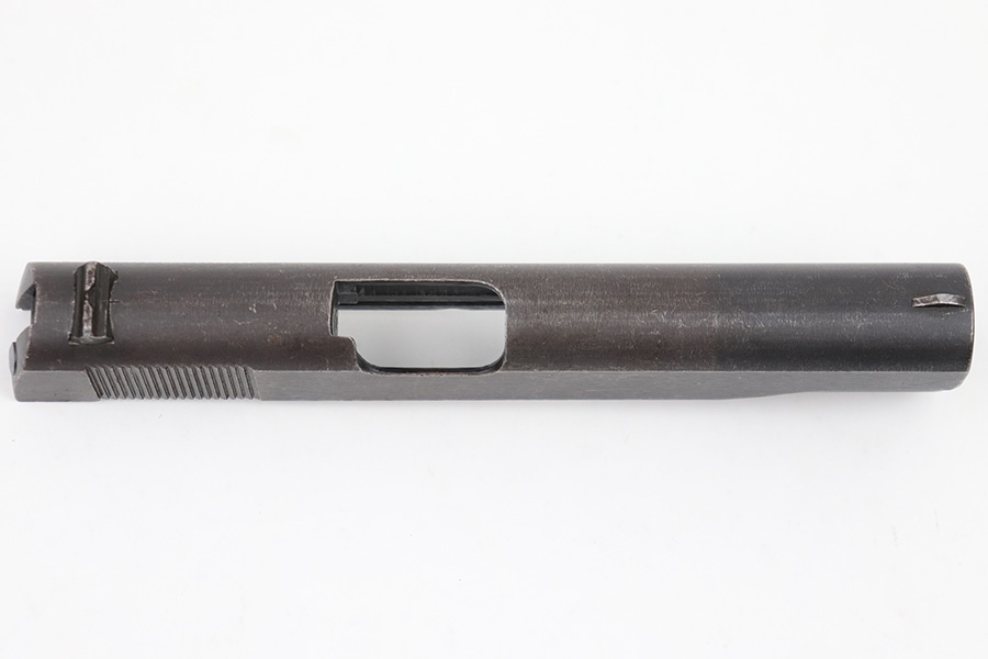 5/3/23 – This is an original Union Switch & Signal M1911A1 slide. The slide has an original Du-Lite finish that rates around 85-90%. There’s some mild honest wear and thinning throughout the slide, along with some high edge wear and finish loss near the muzzle. Comes complete with an original firing pin inside. This is a rare variation WW2 era production part.