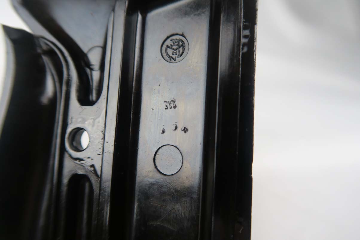 4/19/17 – This is a new one for Legacy – a 1st variation AC 41 with MIXED proofs. Never seen one before but will check with but will check with experts to see if this has ever been encountered before. The finish looks to be all original, however, the polish finish has dulled to a brownish patina. This makes it difficult to give this pistol a rating by finish percentage, as there isn’t much actual wear/finish loss. All of the small parts are appropriately Eagle 359 proofed including the grips. The grips are also numbered to the gun. It has the AC on the trigger guard and the barrel. It also has the early experimental “horseshoe sear” under the grip. All correct early features – EXCEPT the WAFFEN 359 proof on the right side of slide. I did find another one like this on Mark Castel’s website. It is in the 7xxxa serial range and pictured on his site. He states that these are extremely rare. As stated, this is the first Legacy has ever encountered. Only the magazine is not original to the gun. It is Walther proofed, but not numbered, so it would have been made a little later than the gun. The bore is cloudy, but not pitted. I would rate it a 6 out of 10.