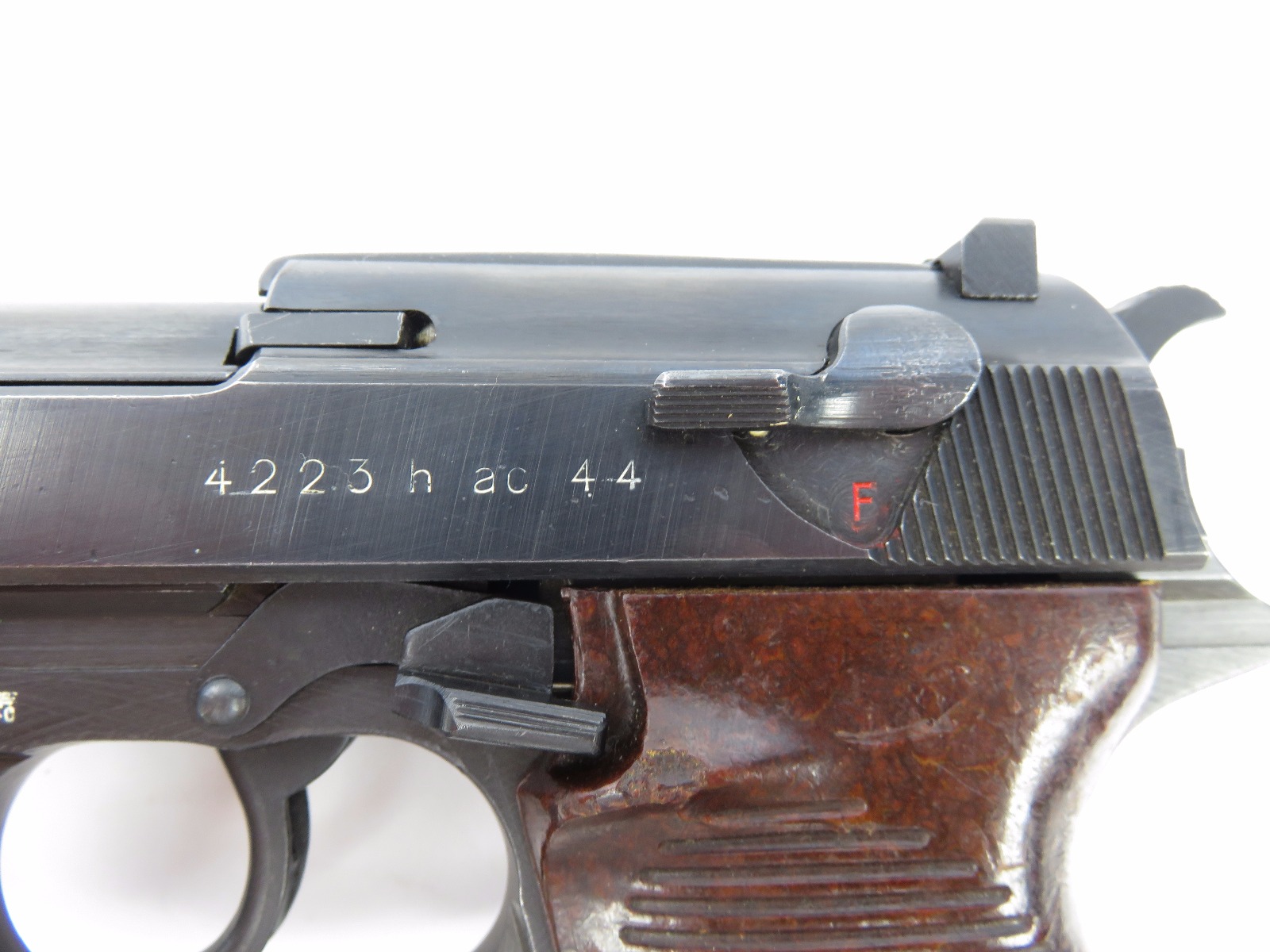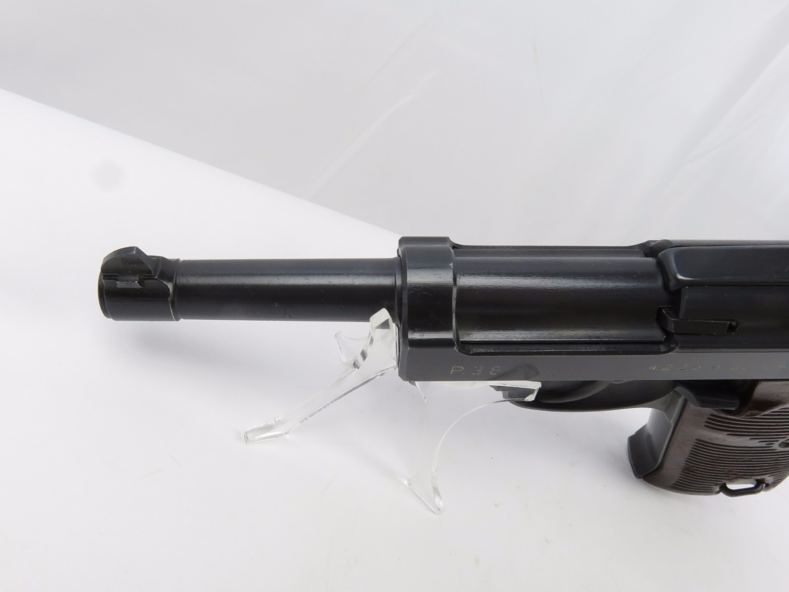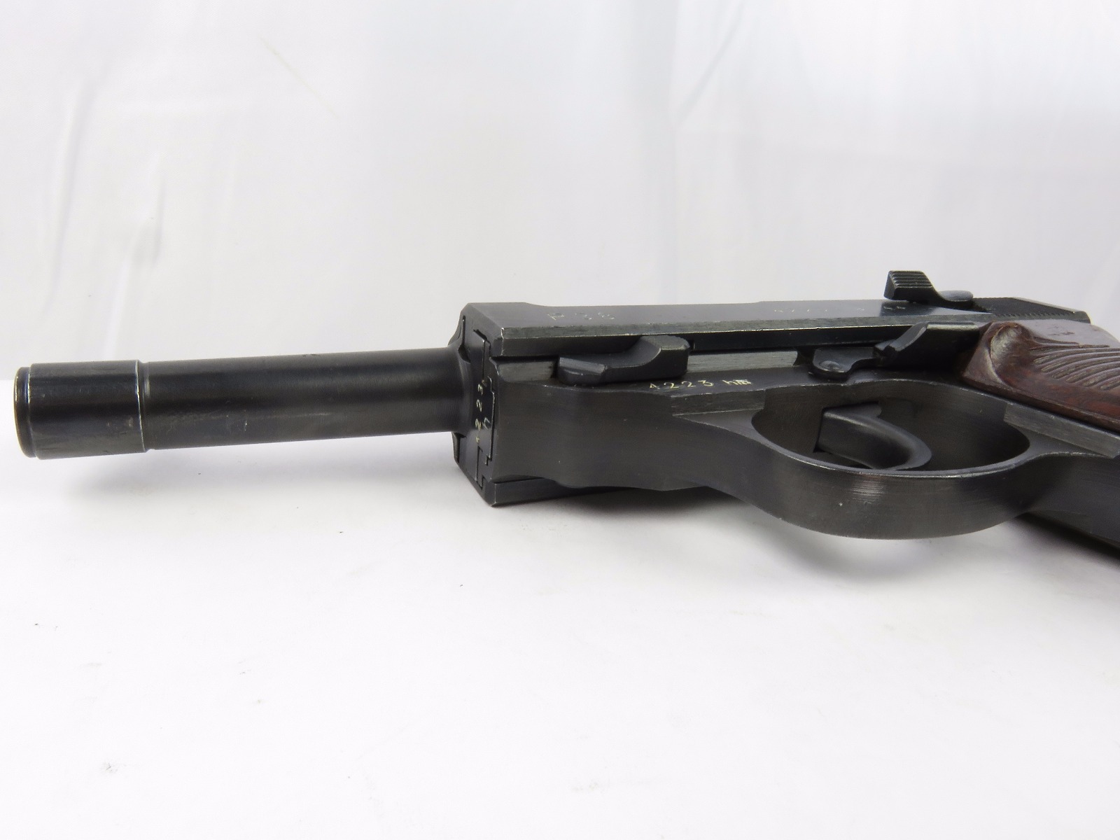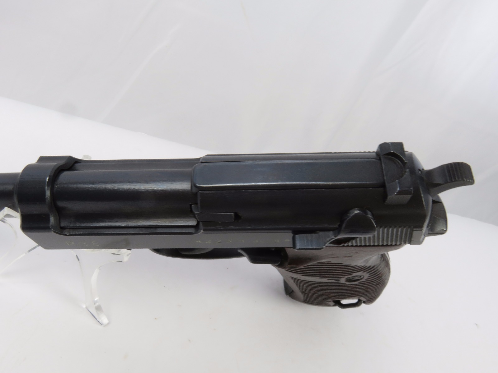 8/28/17 – This is a unique and somewhat rare P.38 variation from late WW2. The pistol is Walther made AC44 – straight line, but has a frame that was made by the FN factory in Belgium. It is properly Eagle 140 proofed on the frame and Eagle 359 (Walther factory) proofed everywhere else. The slide, frame, barrel and locking block are matching. This pistol has the correct mid-war grips and a wartime magazine that is both Walther and Spreewerke proofed. Now for the only negative: This gun had a “dipped” finish (a dark dip that the Russians used to preserve their captured guns). We had the dip removed as well as could be done without hurting the original finish. What we have left is the original finish that is a bit darker than ususal. The spring are all clean – “in the white”, as is the locking block. The bore is very nice – shiny and clean lines. There is NO Russian X or any import marks on this gun. Many of these were brought into the US by Doug Smith of FGS back about 10 years ago, from former East German. He didn’t import mark them and has since passed away. So, overall a tough find.