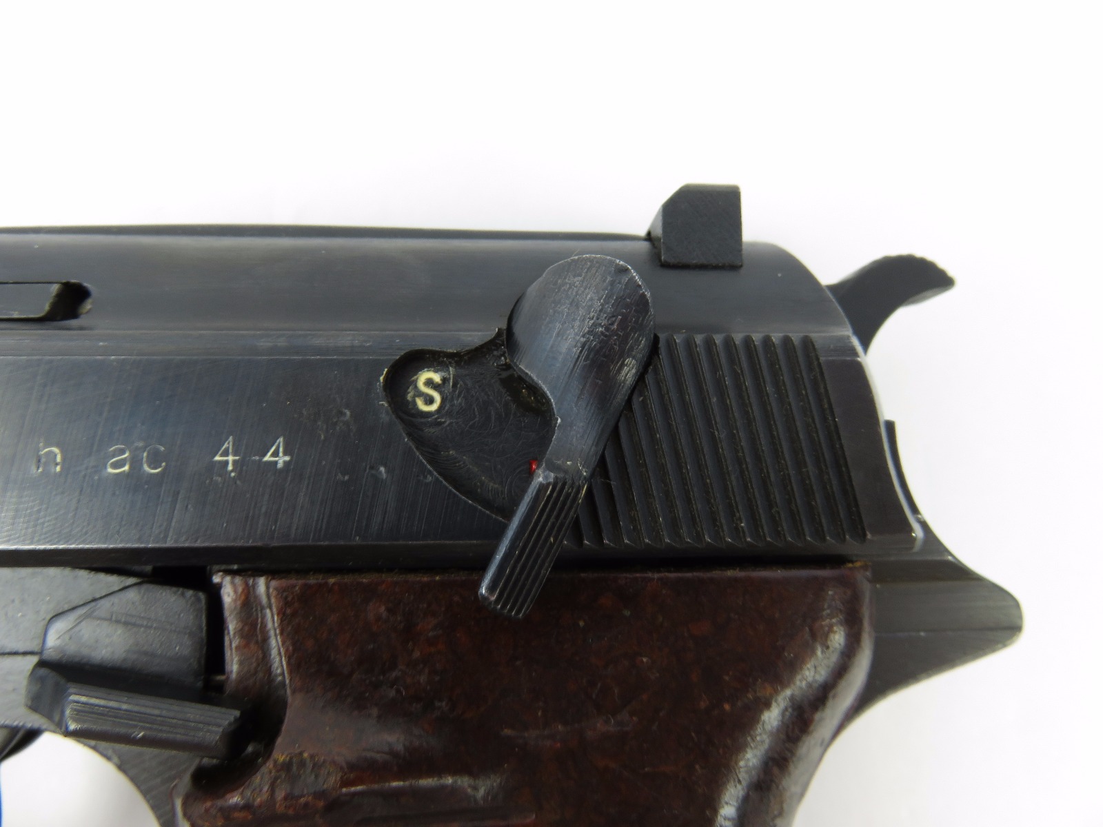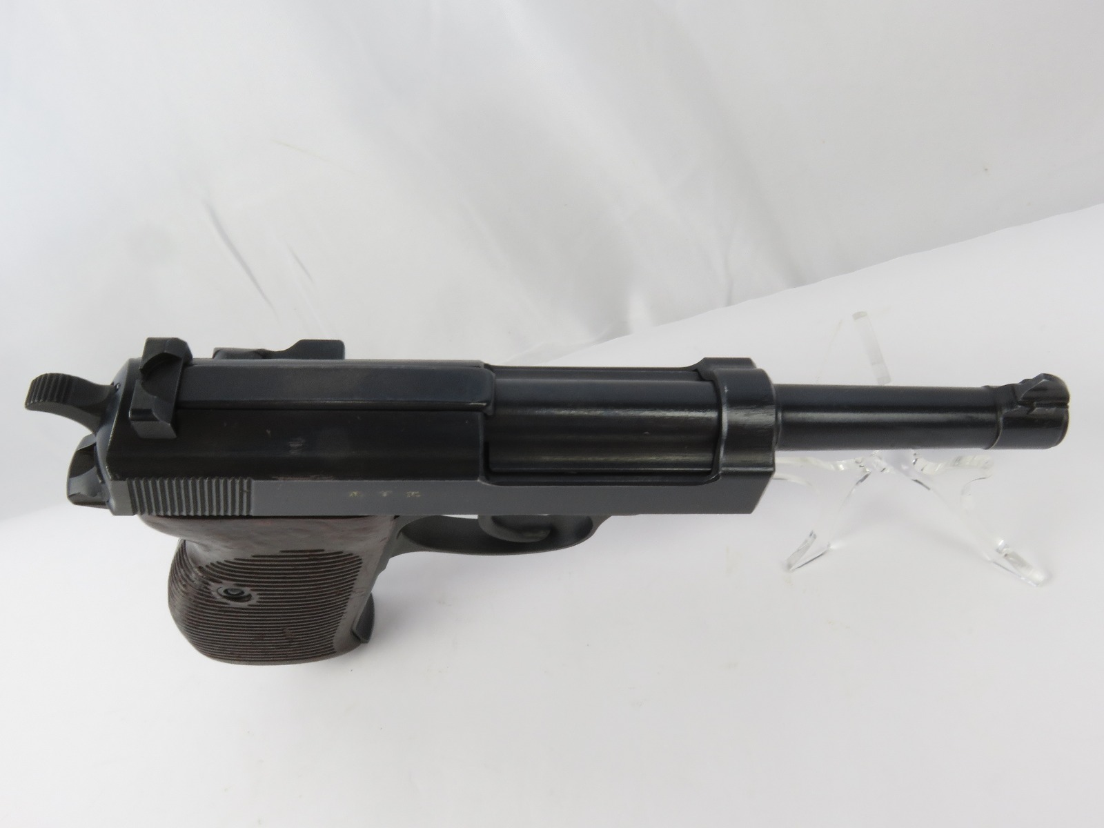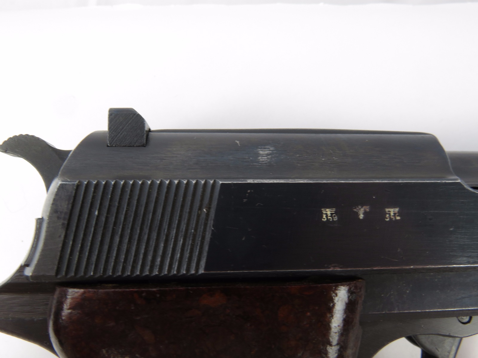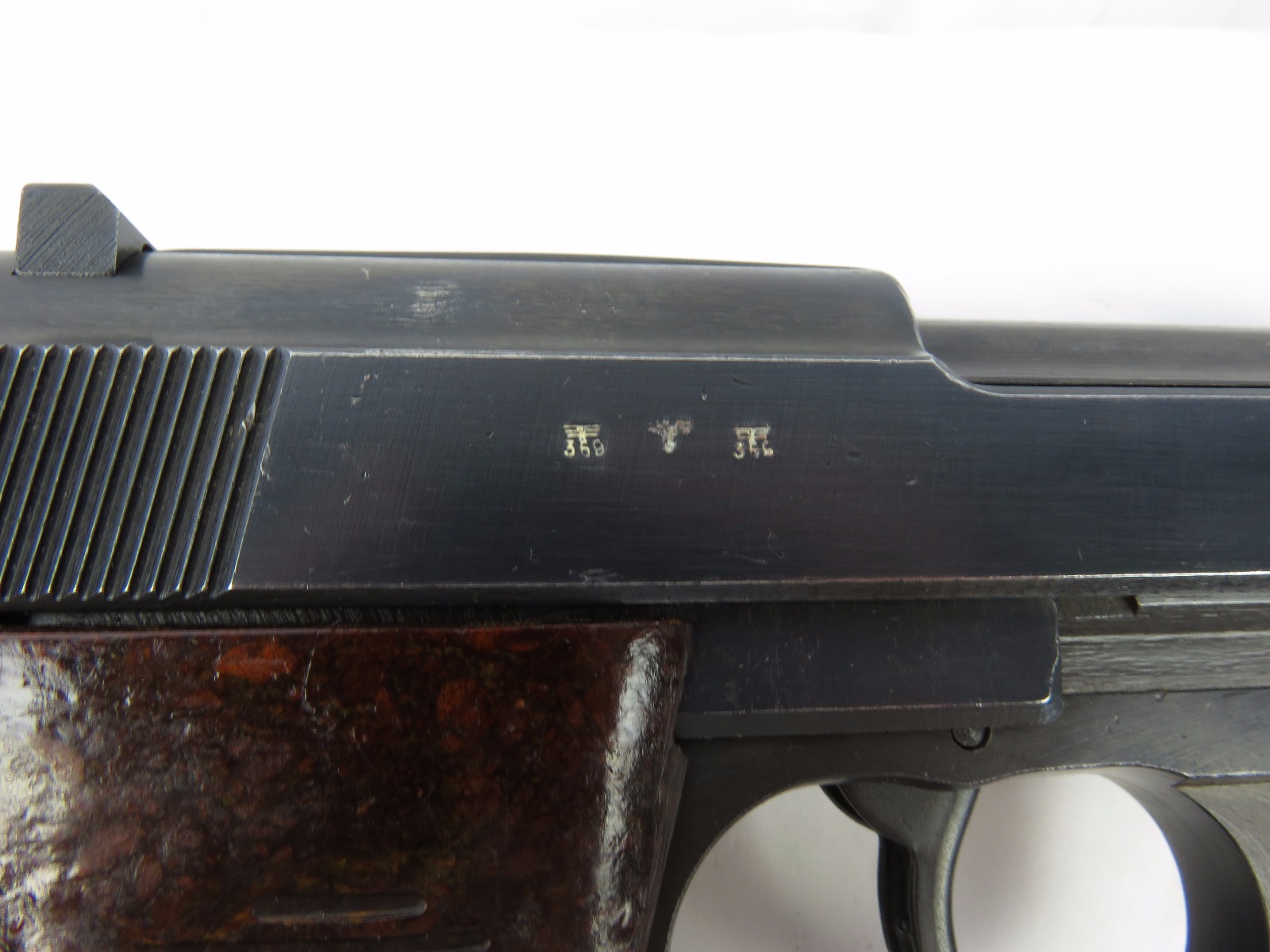 8/28/17 – This is a unique and somewhat rare P.38 variation from late WW2. The pistol is Walther made AC44 – straight line, but has a frame that was made by the FN factory in Belgium. It is properly Eagle 140 proofed on the frame and Eagle 359 (Walther factory) proofed everywhere else. The slide, frame, barrel and locking block are matching. This pistol has the correct mid-war grips and a wartime magazine that is both Walther and Spreewerke proofed. Now for the only negative: This gun had a “dipped” finish (a dark dip that the Russians used to preserve their captured guns). We had the dip removed as well as could be done without hurting the original finish. What we have left is the original finish that is a bit darker than ususal. The spring are all clean – “in the white”, as is the locking block. The bore is very nice – shiny and clean lines. There is NO Russian X or any import marks on this gun. Many of these were brought into the US by Doug Smith of FGS back about 10 years ago, from former East German. He didn’t import mark them and has since passed away. So, overall a tough find.