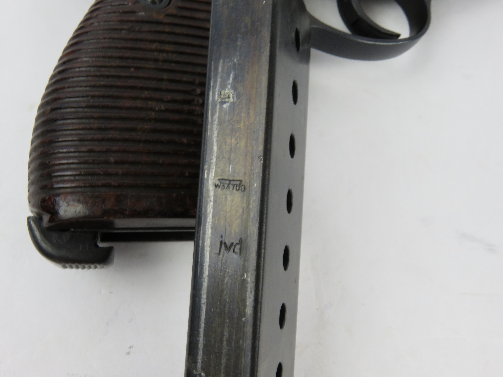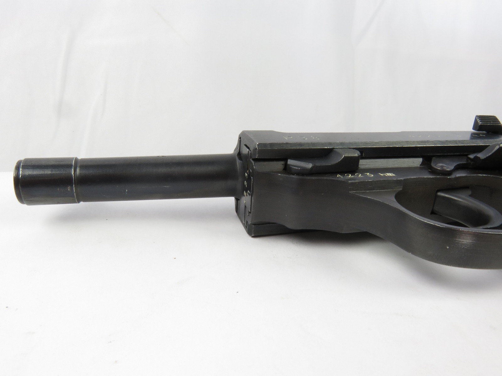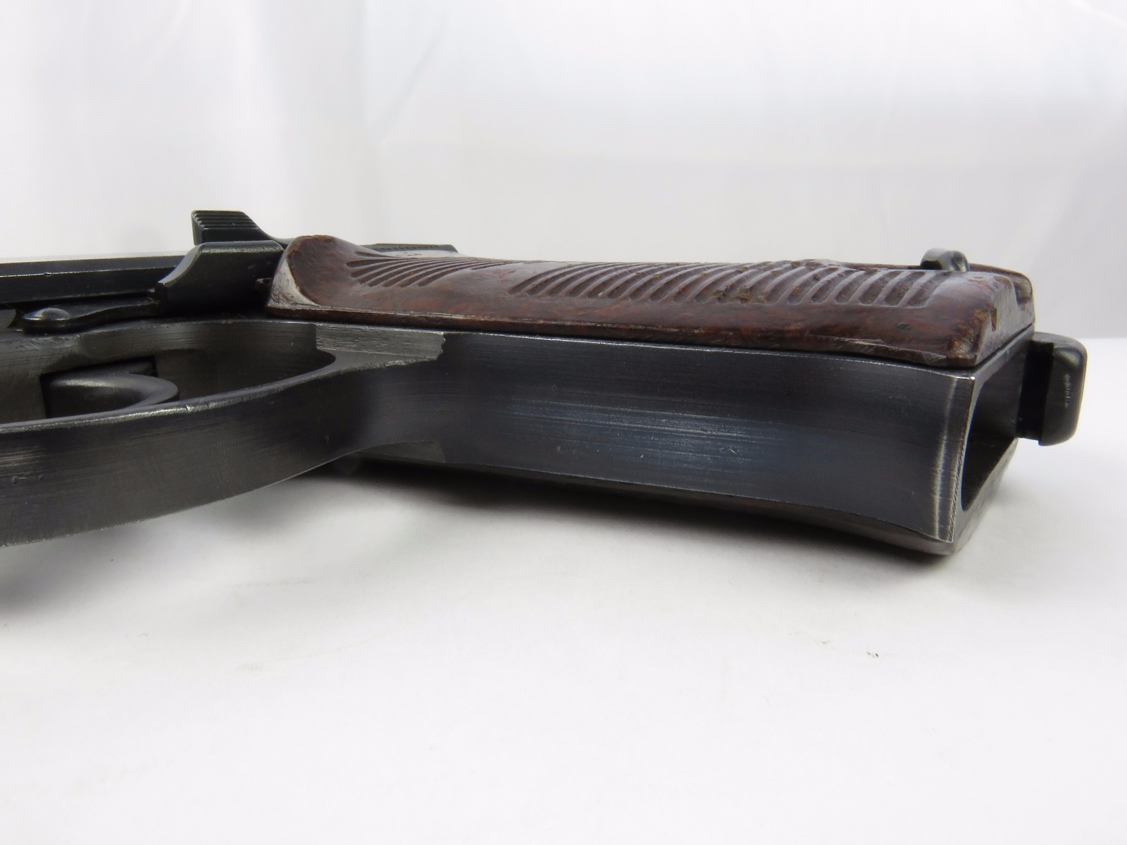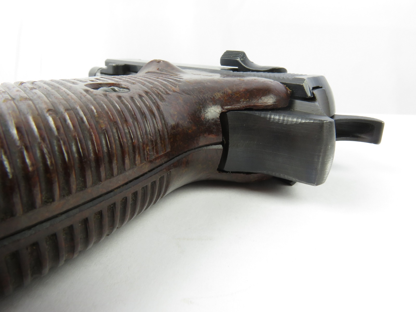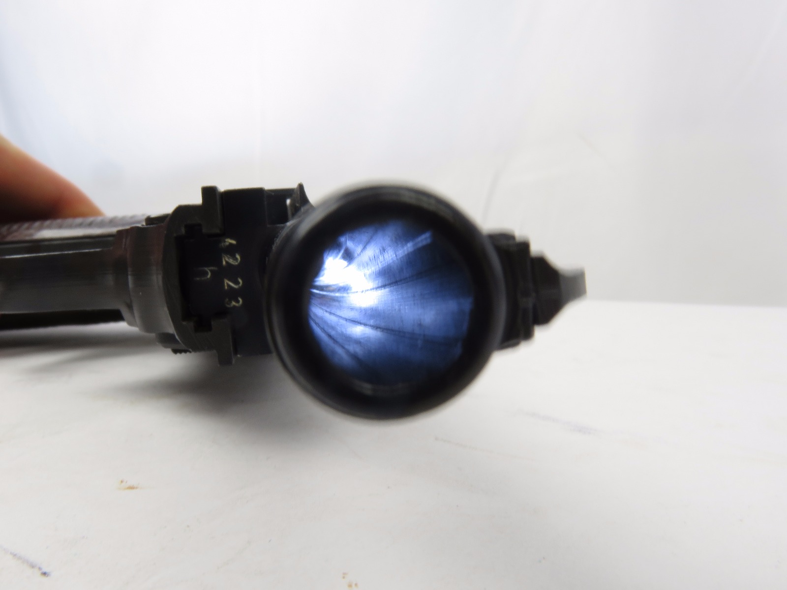 8/28/17 – This is a unique and somewhat rare P.38 variation from late WW2. The pistol is Walther made AC44 – straight line, but has a frame that was made by the FN factory in Belgium. It is properly Eagle 140 proofed on the frame and Eagle 359 (Walther factory) proofed everywhere else. The slide, frame, barrel and locking block are matching. This pistol has the correct mid-war grips and a wartime magazine that is both Walther and Spreewerke proofed. Now for the only negative: This gun had a “dipped” finish (a dark dip that the Russians used to preserve their captured guns). We had the dip removed as well as could be done without hurting the original finish. What we have left is the original finish that is a bit darker than ususal. The spring are all clean – “in the white”, as is the locking block. The bore is very nice – shiny and clean lines. There is NO Russian X or any import marks on this gun. Many of these were brought into the US by Doug Smith of FGS back about 10 years ago, from former East German. He didn’t import mark them and has since passed away. So, overall a tough find.