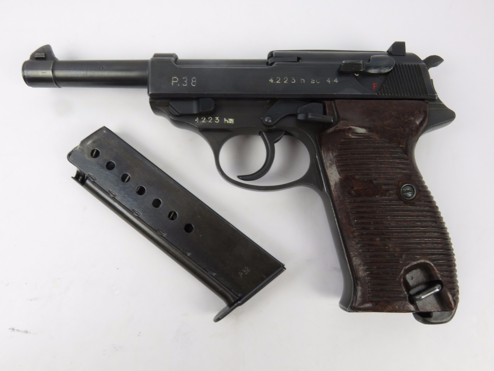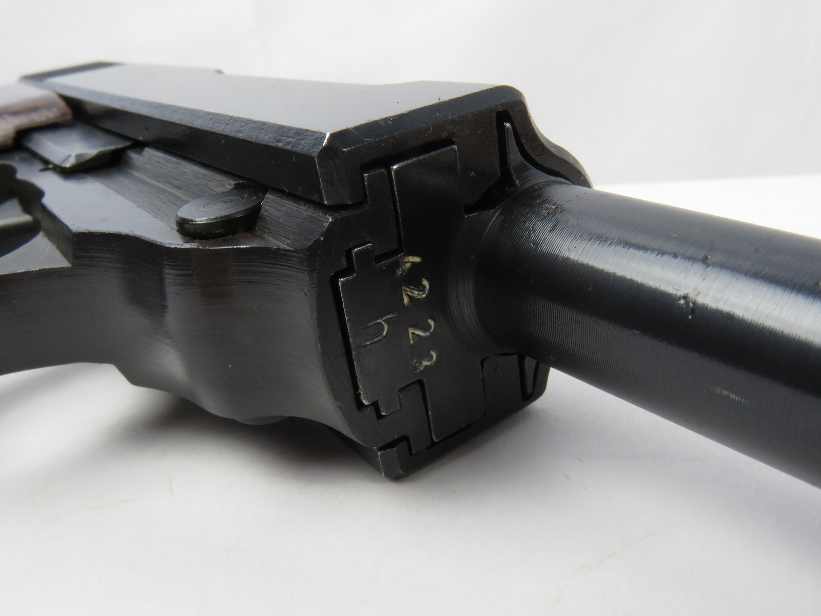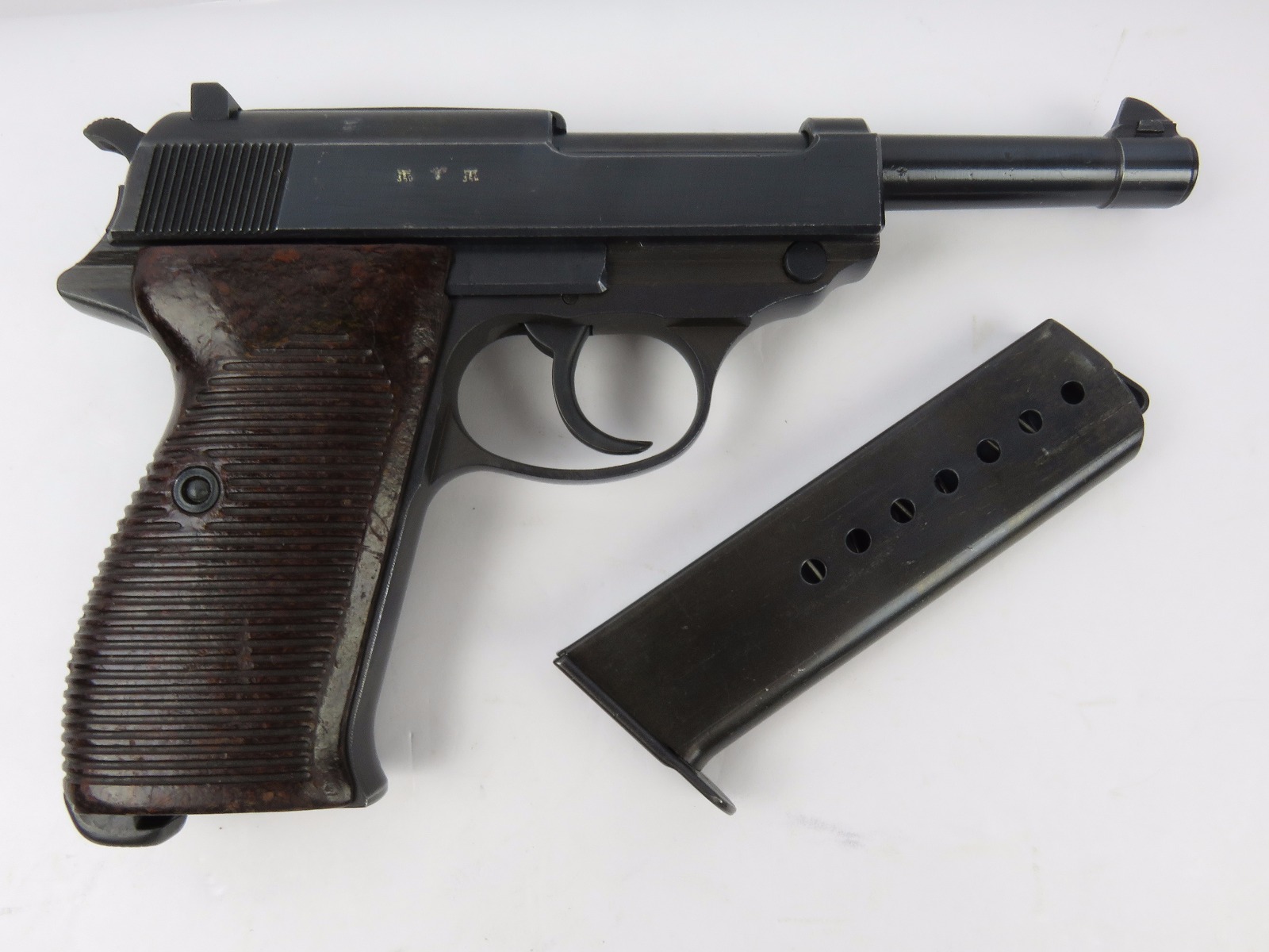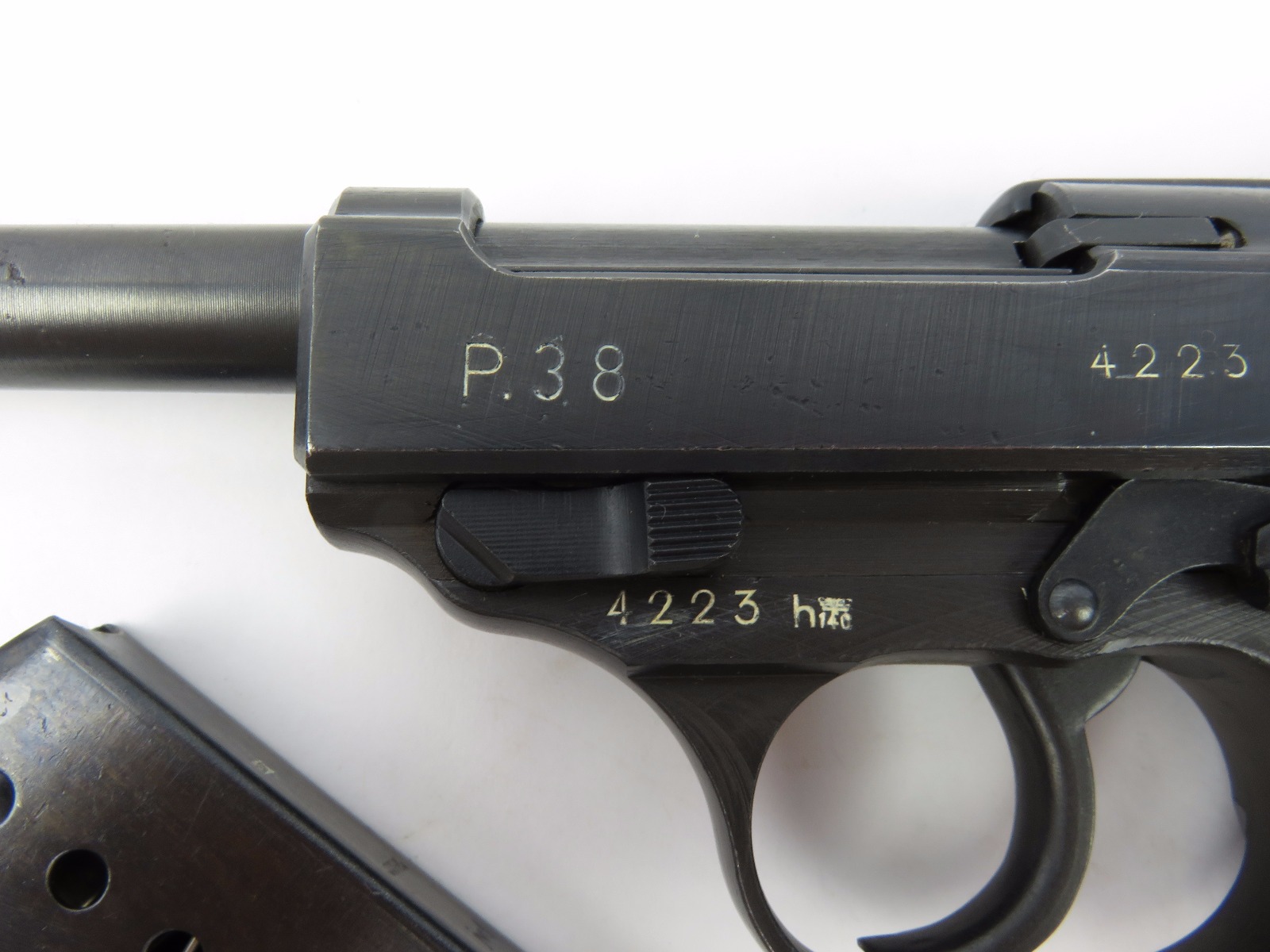 8/28/17 – This is a unique and somewhat rare P.38 variation from late WW2. The pistol is Walther made AC44 – straight line, but has a frame that was made by the FN factory in Belgium. It is properly Eagle 140 proofed on the frame and Eagle 359 (Walther factory) proofed everywhere else. The slide, frame, barrel and locking block are matching. This pistol has the correct mid-war grips and a wartime magazine that is both Walther and Spreewerke proofed. Now for the only negative: This gun had a “dipped” finish (a dark dip that the Russians used to preserve their captured guns). We had the dip removed as well as could be done without hurting the original finish. What we have left is the original finish that is a bit darker than ususal. The spring are all clean – “in the white”, as is the locking block. The bore is very nice – shiny and clean lines. There is NO Russian X or any import marks on this gun. Many of these were brought into the US by Doug Smith of FGS back about 10 years ago, from former East German. He didn’t import mark them and has since passed away. So, overall a tough find.