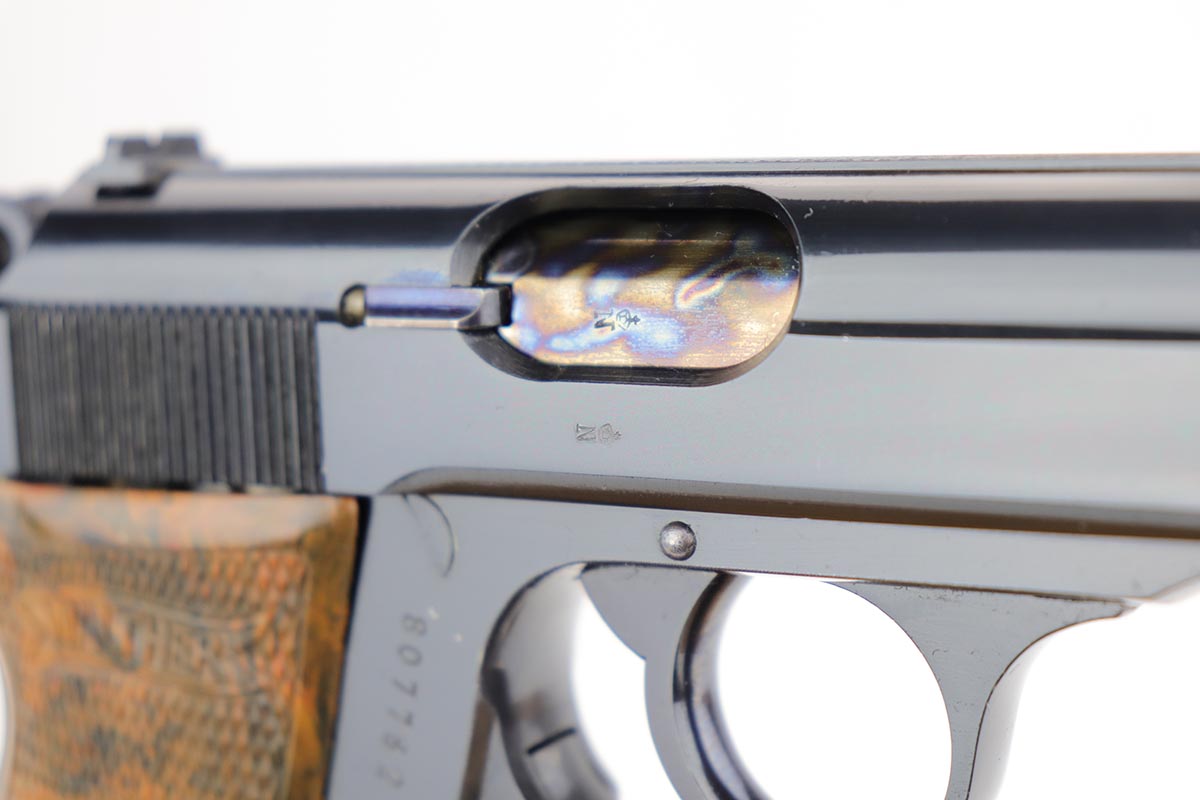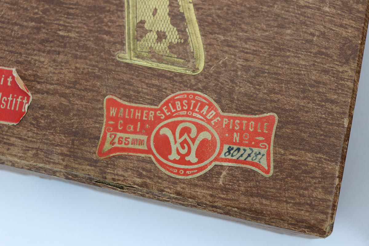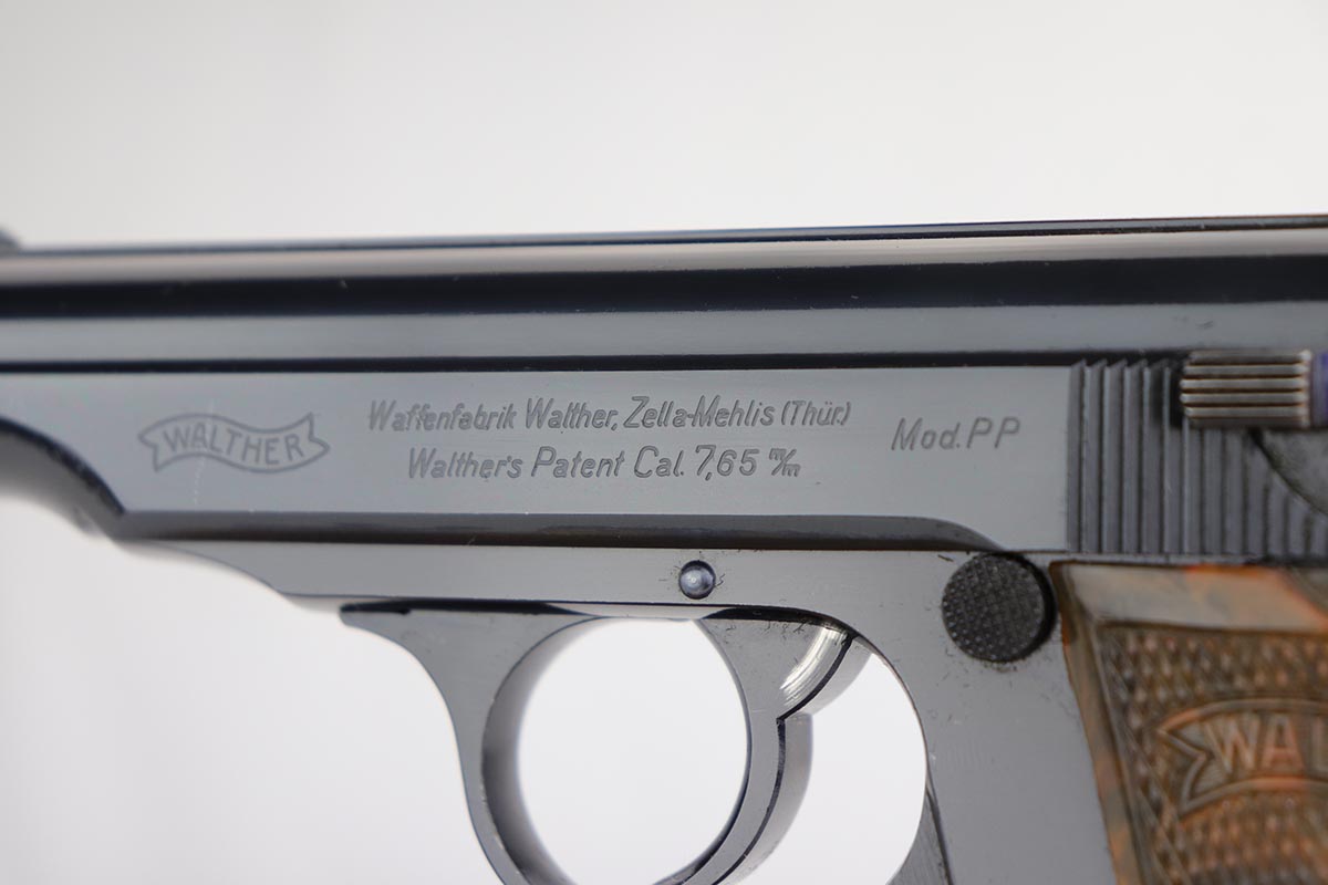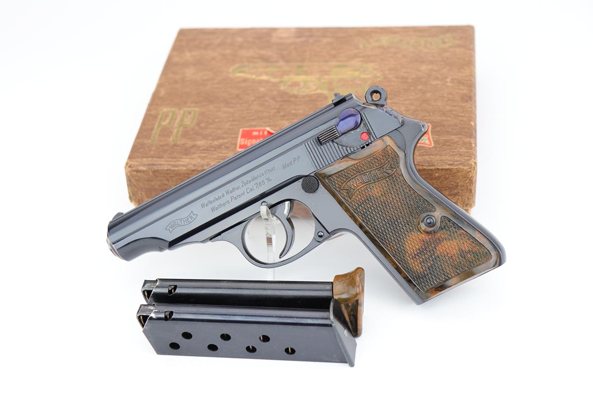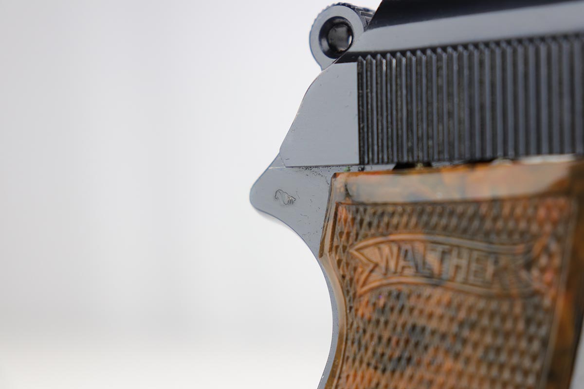 1/2/20 – In 30 years of collecting, I have never seen a Walther PP like this one. Check it out and see what you think! Here we have a 1934-35 manufactured Walther PP, like NEW in the box. The box is hand numbered to the gun and looks to be original. It comes with all of the proper accessories, including an original manual. All of this would be very desirable, but what sets this listing apart from all others is the finish on the PP. Your attention is first drawn to the grips. The coloration is that of a PPK, rather than the typical PP grips. Yet the factory DID make these special grips only for presentation guns and verchromt finish PP’s. Also notice the brown finger extension bottom; again, typically for a PPK. Now, lets examine the finish. It looks to be 99% and all original but check out the case hardening on the front of the muzzle, the back of the slide and the ejection port. I have seen a good number of presentation Walthers, but never one like this. I don’t believe anyone did this postwar. My experience would suggest two options: 1) A factory original gun with unique finish and grips. Possibly one of a kind. Or 2) It was a special order in 1935 by a large German retailer who did the special finish and offered this in their retail shops. We offered a similar engraved PPK by Stuhl and Berger Retailer. See this link: