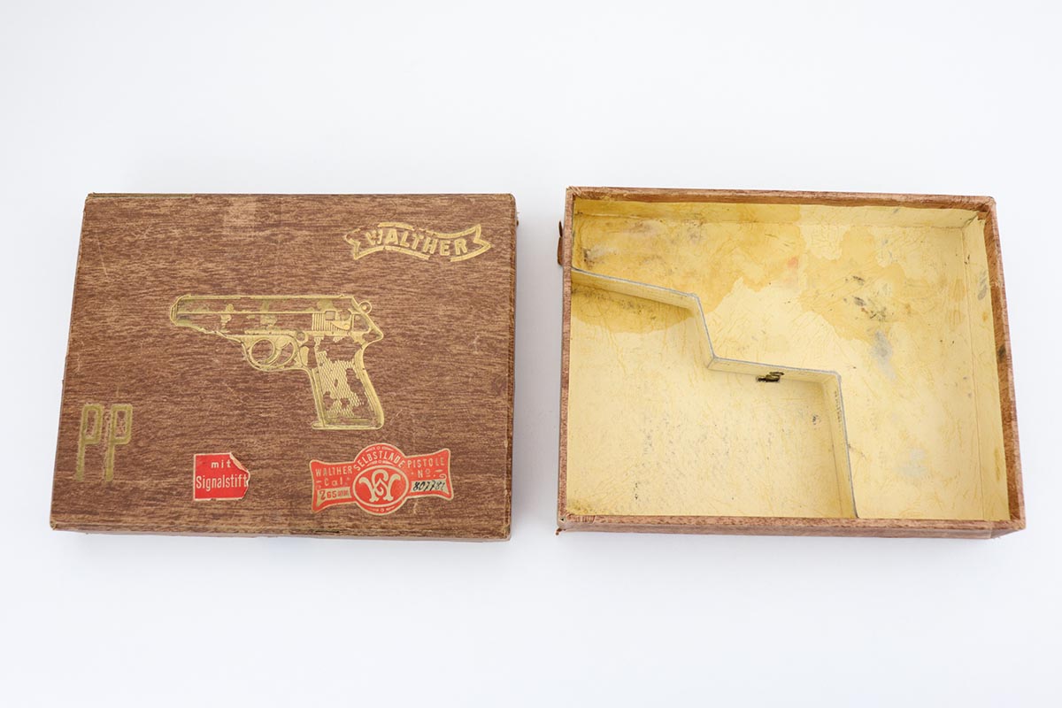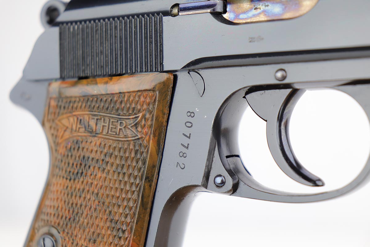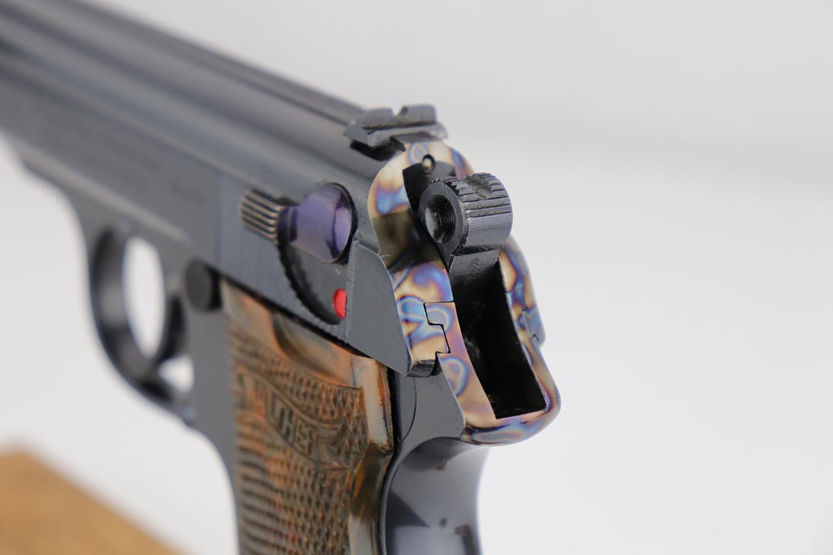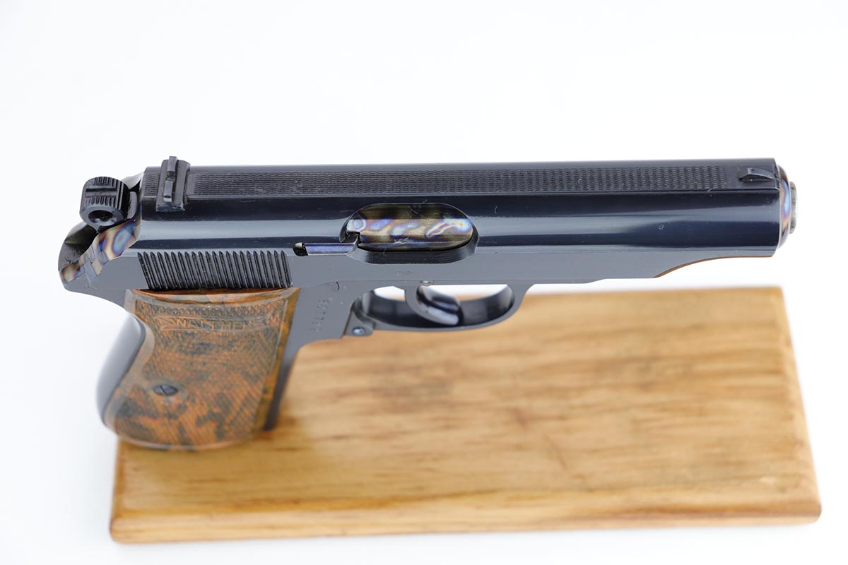 1/2/20 – In 30 years of collecting, I have never seen a Walther PP like this one. Check it out and see what you think! Here we have a 1934-35 manufactured Walther PP, like NEW in the box. The box is hand numbered to the gun and looks to be original. It comes with all of the proper accessories, including an original manual. All of this would be very desirable, but what sets this listing apart from all others is the finish on the PP. Your attention is first drawn to the grips. The coloration is that of a PPK, rather than the typical PP grips. Yet the factory DID make these special grips only for presentation guns and verchromt finish PP’s. Also notice the brown finger extension bottom; again, typically for a PPK. Now, lets examine the finish. It looks to be 99% and all original but check out the case hardening on the front of the muzzle, the back of the slide and the ejection port. I have seen a good number of presentation Walthers, but never one like this. I don’t believe anyone did this postwar. My experience would suggest two options: 1) A factory original gun with unique finish and grips. Possibly one of a kind. Or 2) It was a special order in 1935 by a large German retailer who did the special finish and offered this in their retail shops. We offered a similar engraved PPK by Stuhl and Berger Retailer. See this link: