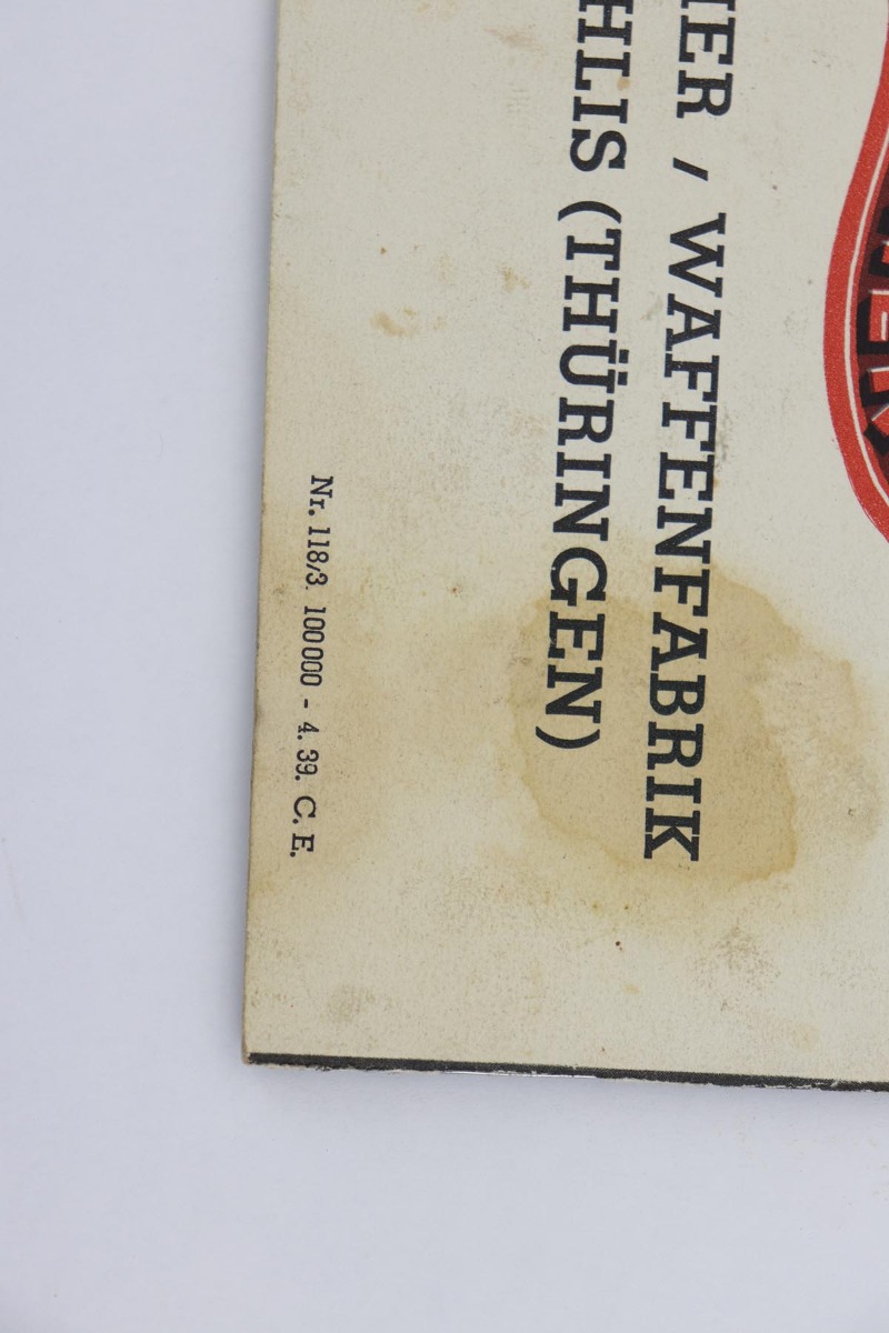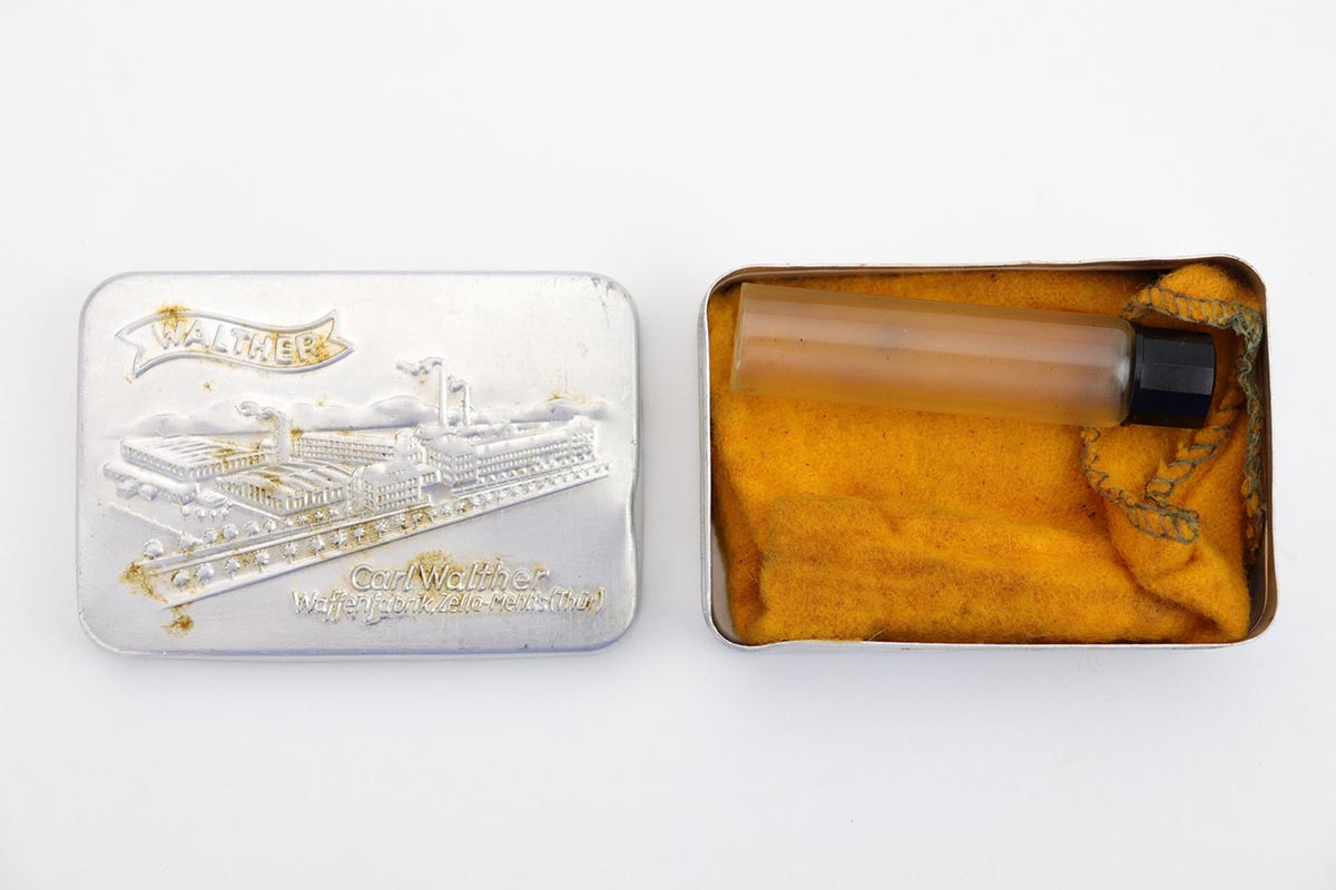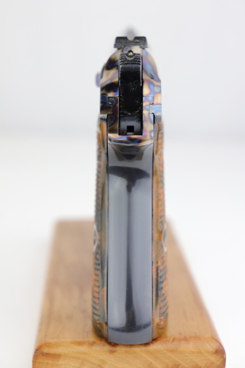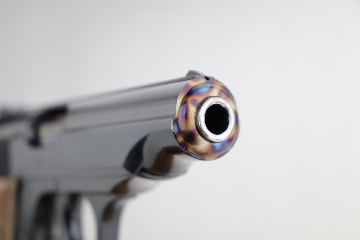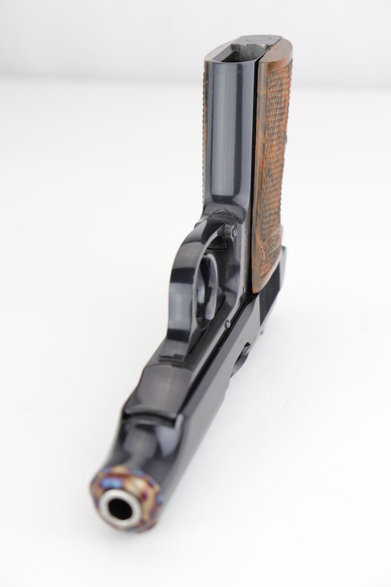 1/2/20 – In 30 years of collecting, I have never seen a Walther PP like this one. Check it out and see what you think! Here we have a 1934-35 manufactured Walther PP, like NEW in the box. The box is hand numbered to the gun and looks to be original. It comes with all of the proper accessories, including an original manual. All of this would be very desirable, but what sets this listing apart from all others is the finish on the PP. Your attention is first drawn to the grips. The coloration is that of a PPK, rather than the typical PP grips. Yet the factory DID make these special grips only for presentation guns and verchromt finish PP’s. Also notice the brown finger extension bottom; again, typically for a PPK. Now, lets examine the finish. It looks to be 99% and all original but check out the case hardening on the front of the muzzle, the back of the slide and the ejection port. I have seen a good number of presentation Walthers, but never one like this. I don’t believe anyone did this postwar. My experience would suggest two options: 1) A factory original gun with unique finish and grips. Possibly one of a kind. Or 2) It was a special order in 1935 by a large German retailer who did the special finish and offered this in their retail shops. We offered a similar engraved PPK by Stuhl and Berger Retailer. See this link: