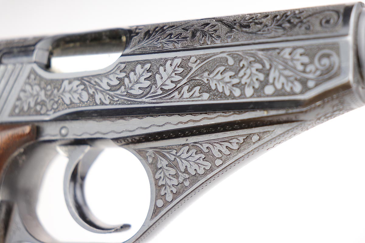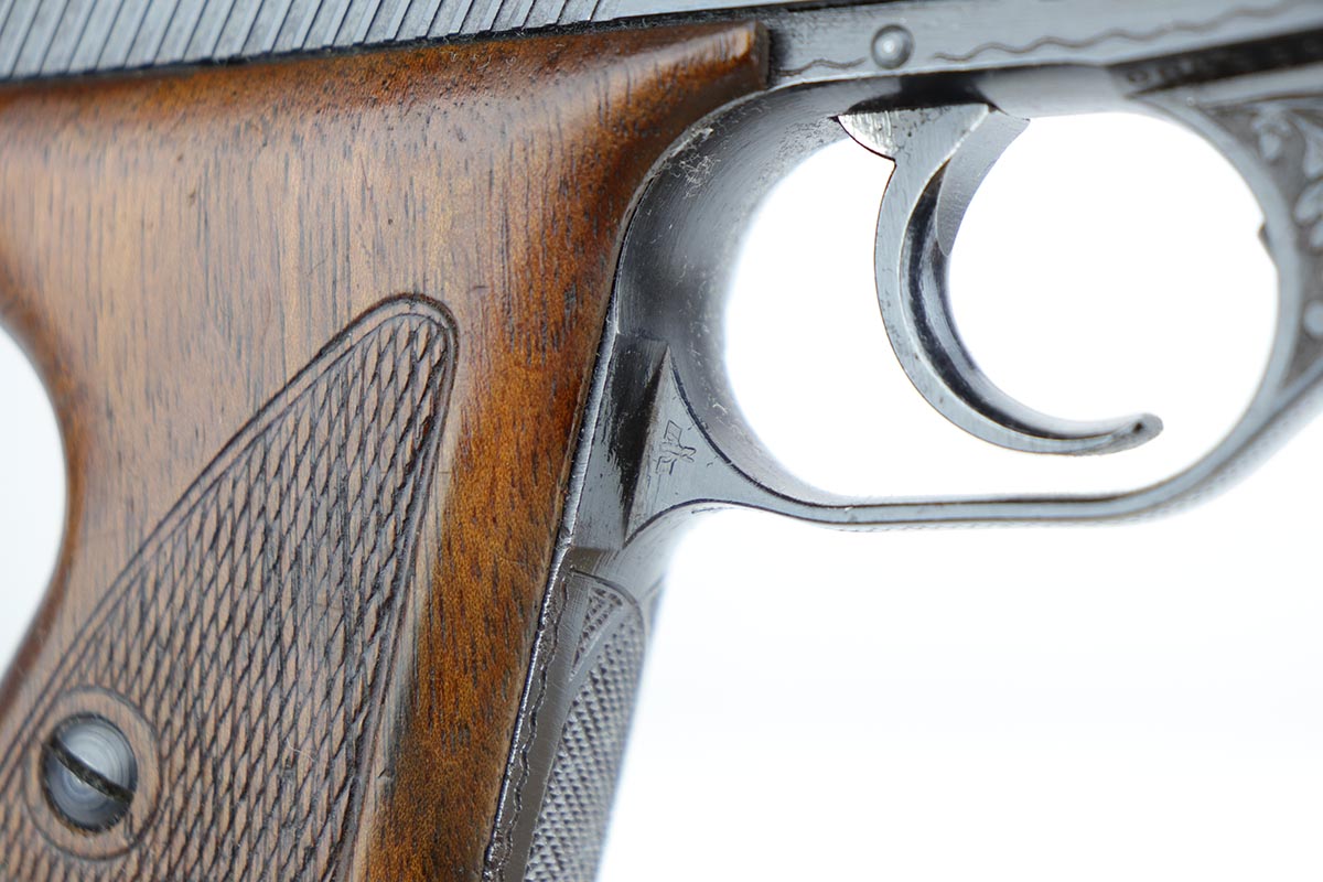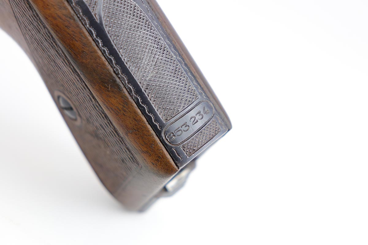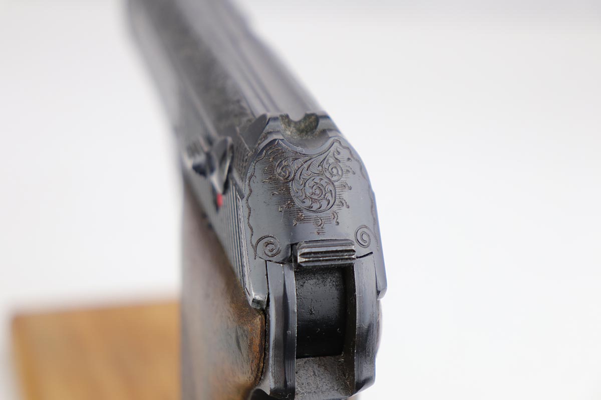 12/26/19 – We have never seen another Engraved Mauser HSc, from the war era like this one. We don’t believe they ever factory engraved an HSc , especially one issued to the Nazi army as indicated by waffenamt on trigger guard. However, in looking at the style and quality of the engraving, we are convinced this was done in Germany in the 1943 to 1946 time period. The Oak Leaf style is exactly what was done by the engravers in the Zella-Mehlis area for Walther and other companies. In looking at the detail on the leaves, especially the style of the “veins” in the leaves, we have only ever seen this done by the German engravers of that era. So our best guess is that this was issued to a German officer who paid to have the gun engraved, or captured by a US GI who stayed in Germany in the immediate post war period who then had it engraved. It has the correct wartime magazine and wooden grips. The workmanship is top quality. The gun is all matching and the bluing is period correct. Bore is mint. A very desirable collectors piece.
