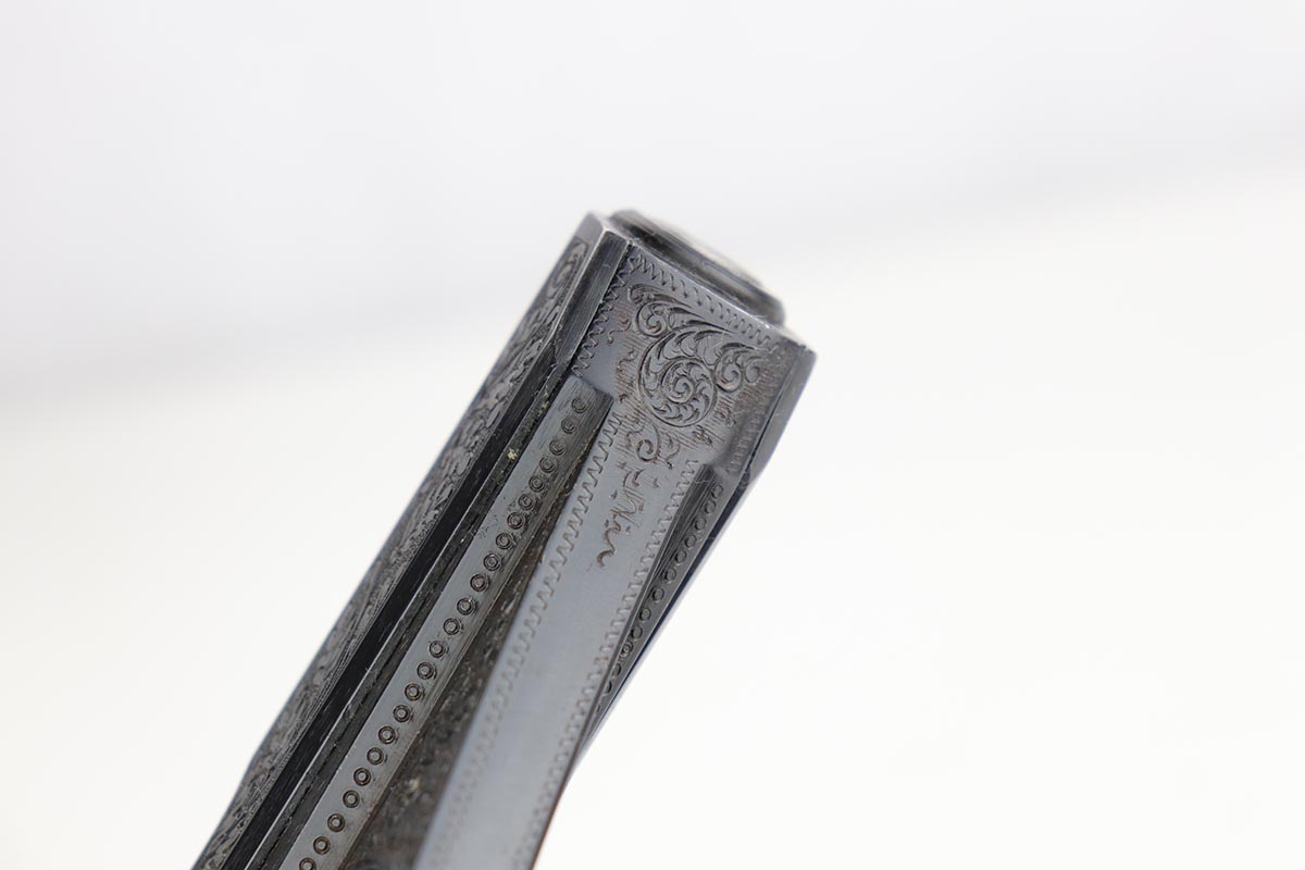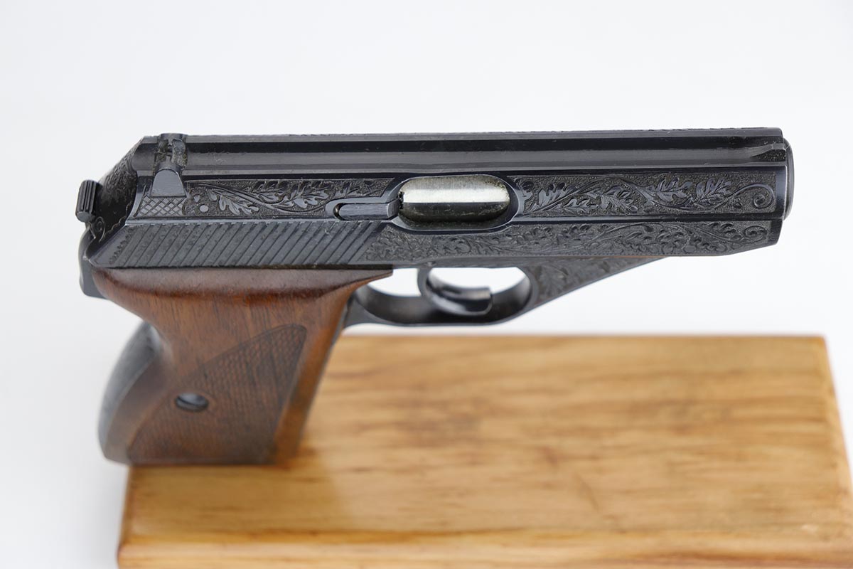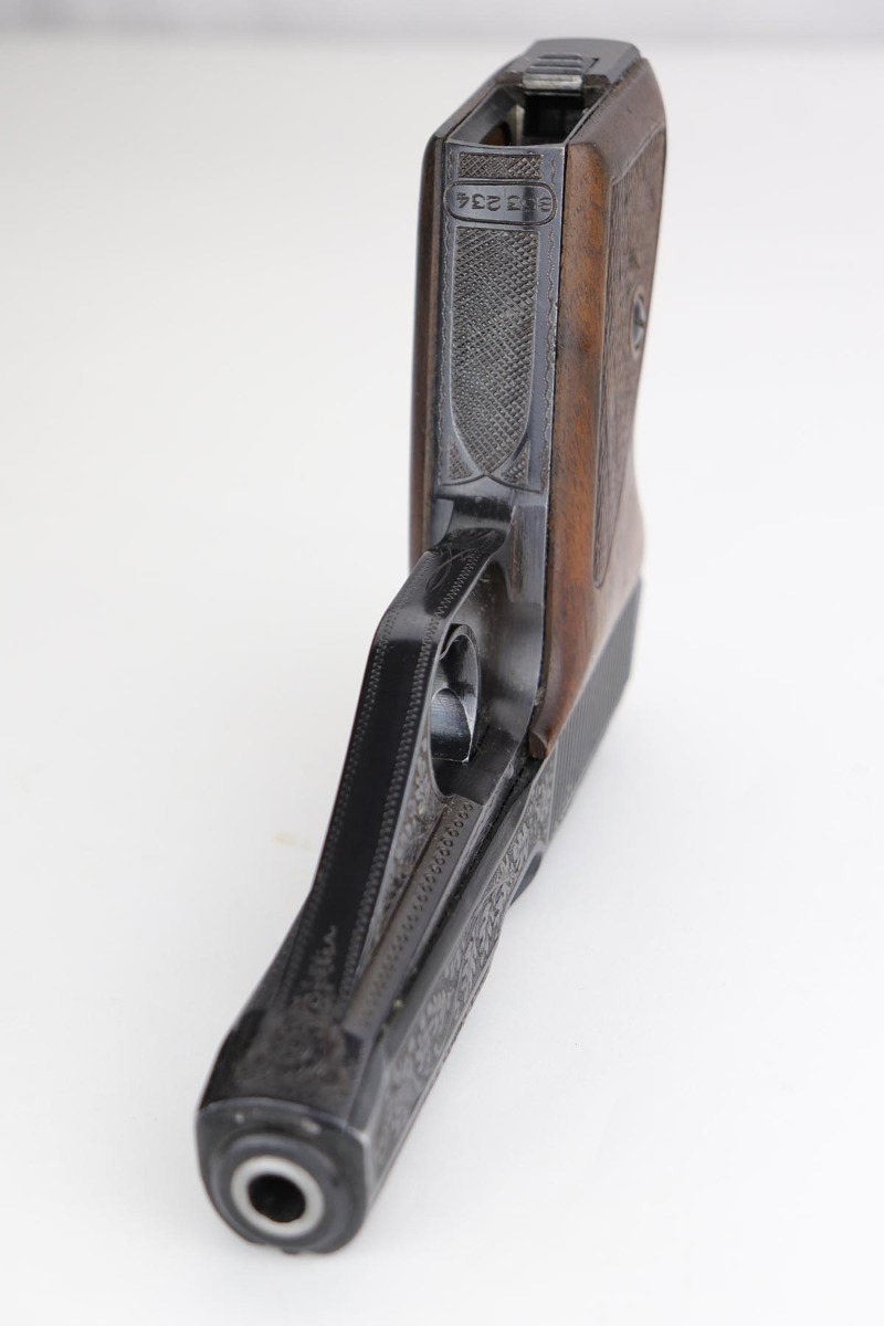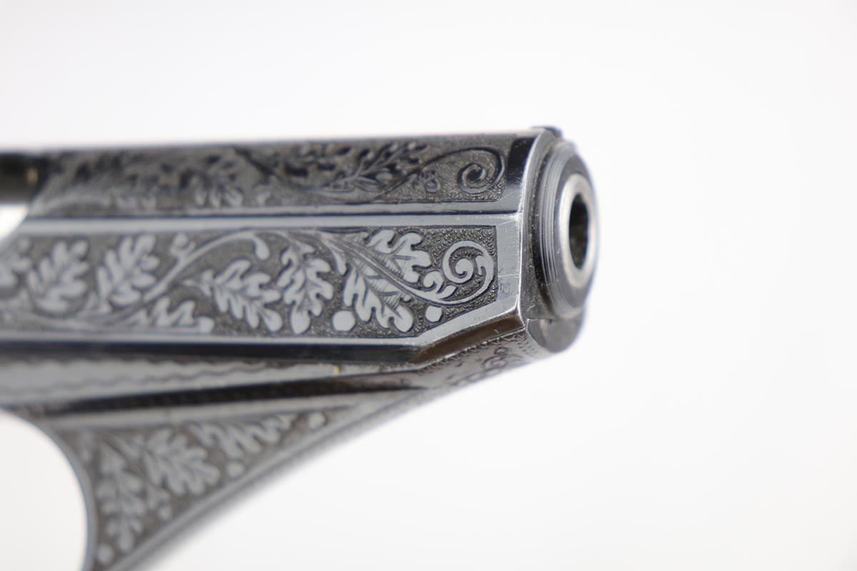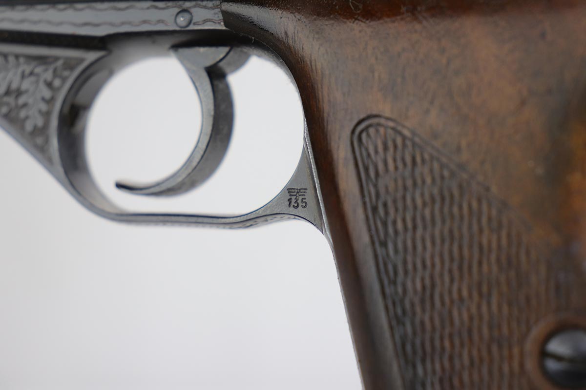 12/26/19 – We have never seen another Engraved Mauser HSc, from the war era like this one. We don’t believe they ever factory engraved an HSc , especially one issued to the Nazi army as indicated by waffenamt on trigger guard. However, in looking at the style and quality of the engraving, we are convinced this was done in Germany in the 1943 to 1946 time period. The Oak Leaf style is exactly what was done by the engravers in the Zella-Mehlis area for Walther and other companies. In looking at the detail on the leaves, especially the style of the “veins” in the leaves, we have only ever seen this done by the German engravers of that era. So our best guess is that this was issued to a German officer who paid to have the gun engraved, or captured by a US GI who stayed in Germany in the immediate post war period who then had it engraved. It has the correct wartime magazine and wooden grips. The workmanship is top quality. The gun is all matching and the bluing is period correct. Bore is mint. A very desirable collectors piece.