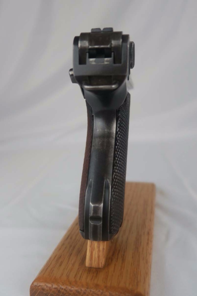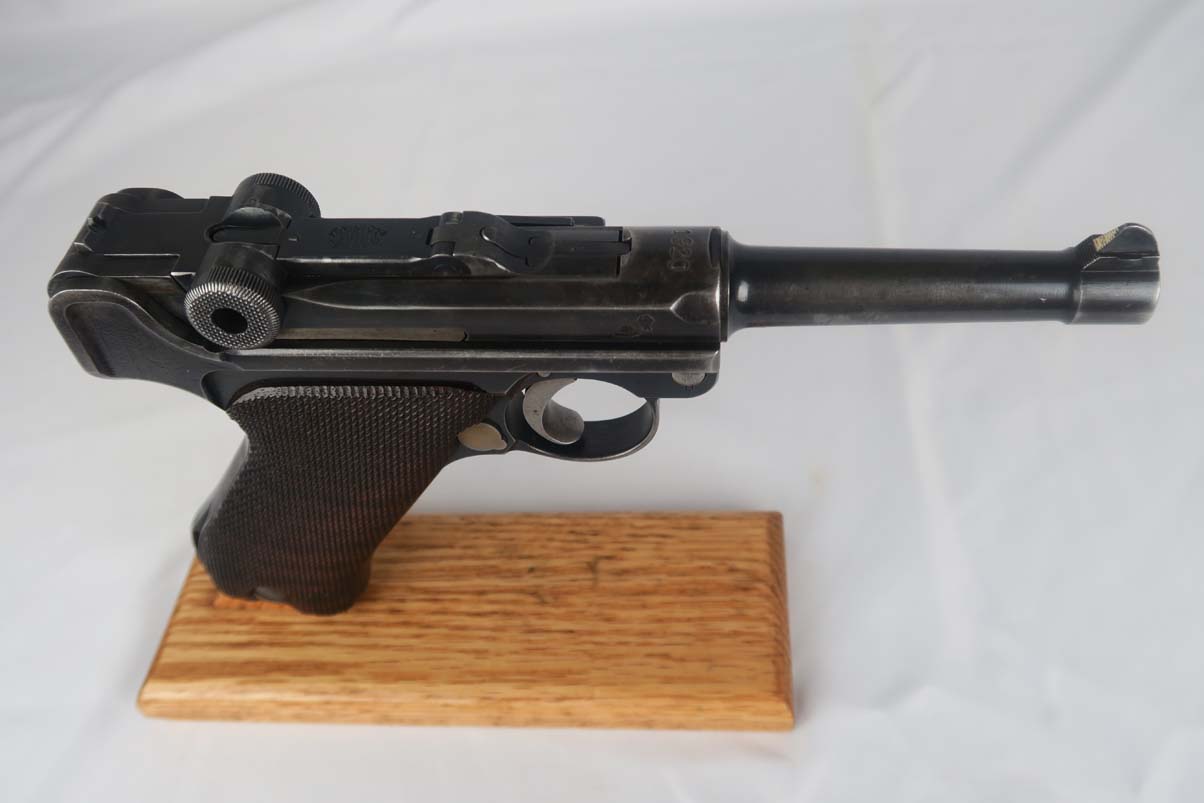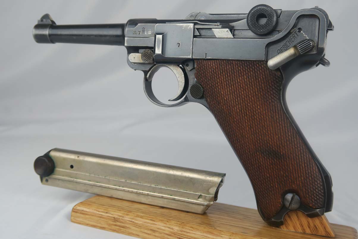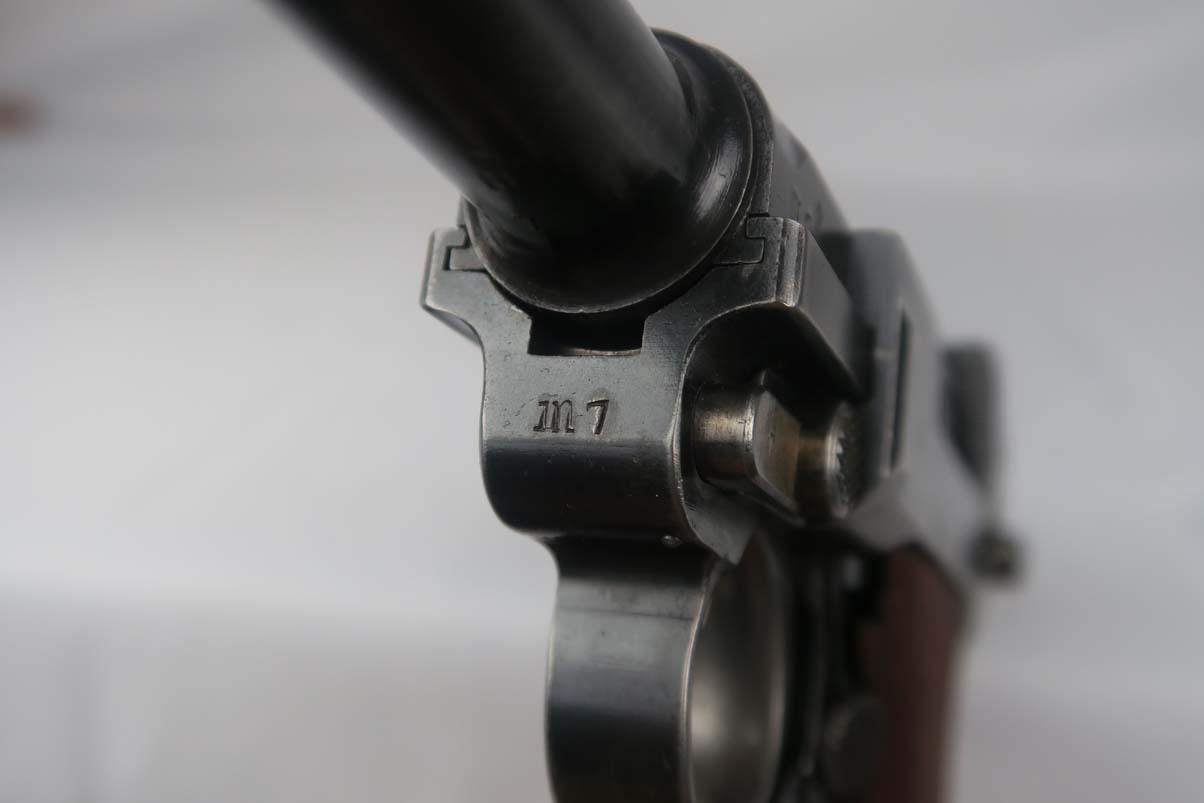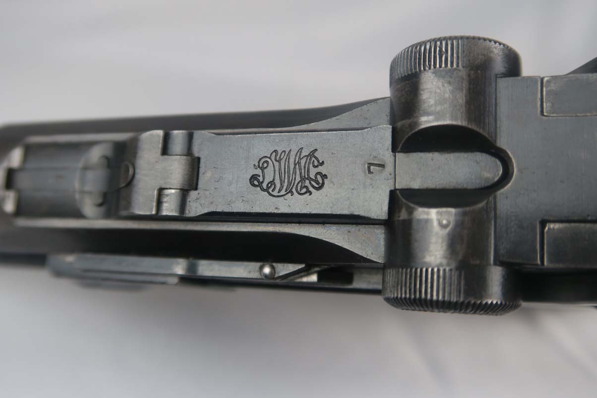 5/5/17- This could perhaps be considered a “sneak” Luger.  Between the wars, during the Weimar period in Germany, and when the Nazi’s first rose to power, they violated the treaty against them re-arming their military or police units. This was most likely a luger from WW1 which was reworked for the commercial market in 1920.   Then it was again re-worked by the Nazi’s for military or police use.   It comes in 9mm, and has crown/N commercial proofs on the barrel, frame and receiver.   One of the reasons I’m not sure about where this gun ended up after the last rework is because it has 2 police safety’s added – the sear safety above the side plate, and the magazine safety at the top of the grip – left side.   That piece missing on the grip is NOT a chip but rather the police style magazine safety.   But I believe the unit marking on the front strap is military – Artillery Unit.  S. Ar. II  I 325.  However, someone can correct me.  Then on the right side of receiver is a Nazi re-work proof – WaA66- from around 1934.  OK, then the serial number is something I have not seen before.   The serial on the frame and receiver is M7.  All other small parts and the barrel are just marked 7, including the hold open, rear toggle pin and the firing pin.  We are not sure of the meaning of the M.    The grips look original, but are not numbered.   The finish appears to be original despite 2 re-works.  All numbers are matching and the bore is excellent.  The magazine is not matching but from a WW1 era luger. (#567)
