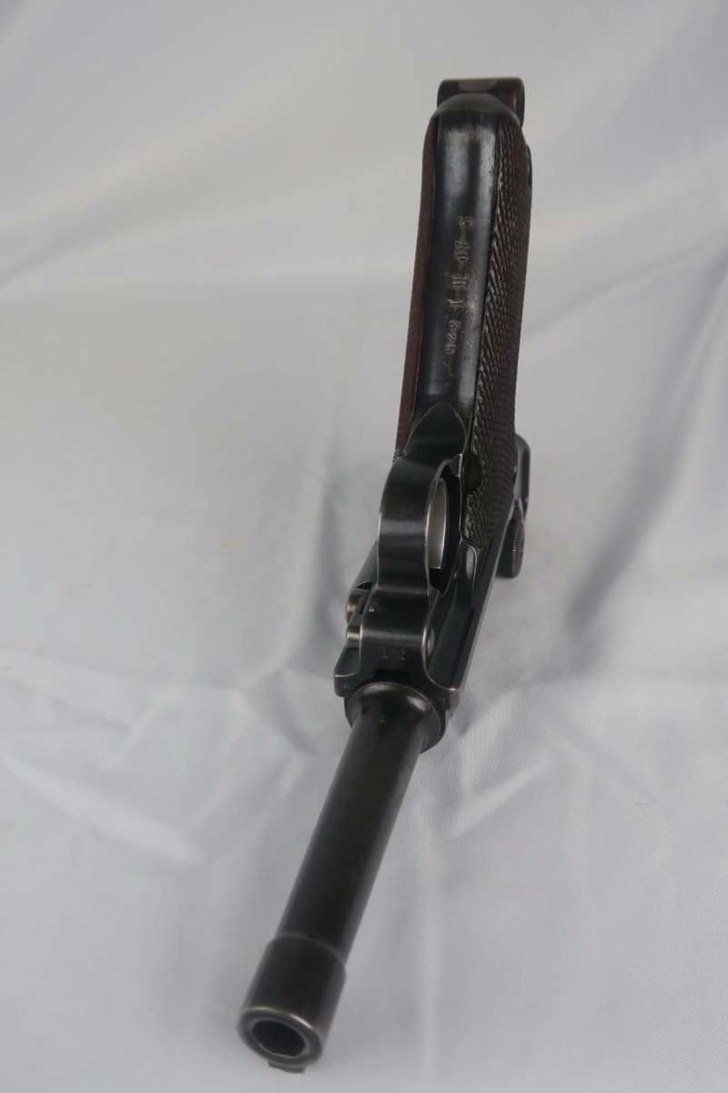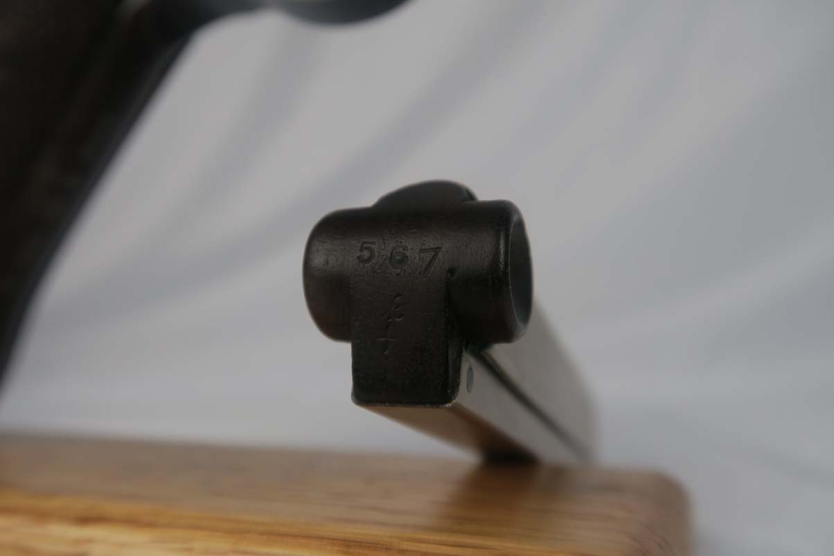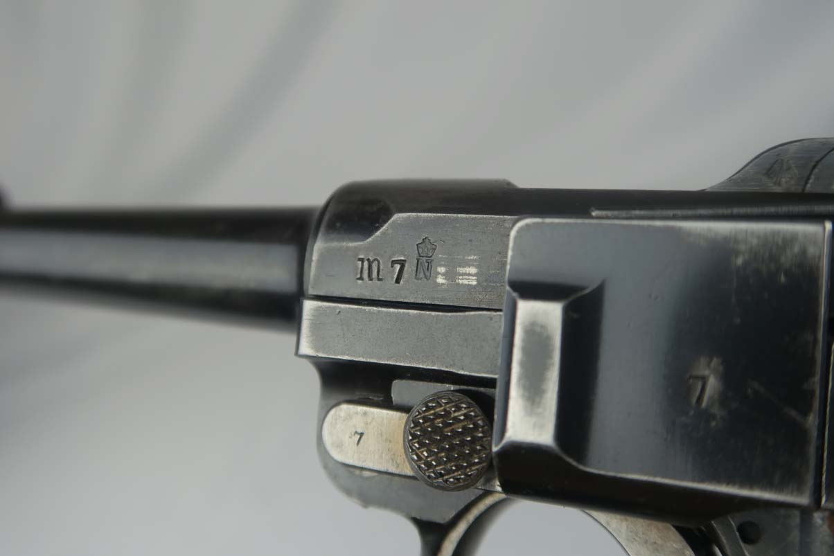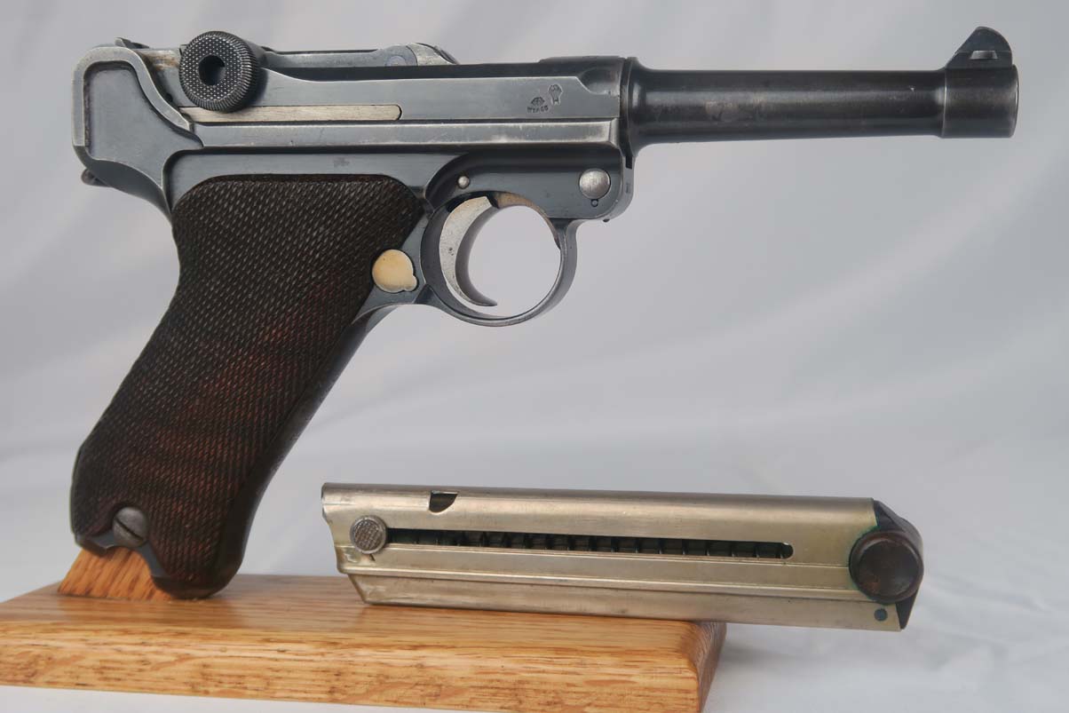 5/5/17- This could perhaps be considered a “sneak” Luger.  Between the wars, during the Weimar period in Germany, and when the Nazi’s first rose to power, they violated the treaty against them re-arming their military or police units. This was most likely a luger from WW1 which was reworked for the commercial market in 1920.   Then it was again re-worked by the Nazi’s for military or police use.   It comes in 9mm, and has crown/N commercial proofs on the barrel, frame and receiver.   One of the reasons I’m not sure about where this gun ended up after the last rework is because it has 2 police safety’s added – the sear safety above the side plate, and the magazine safety at the top of the grip – left side.   That piece missing on the grip is NOT a chip but rather the police style magazine safety.   But I believe the unit marking on the front strap is military – Artillery Unit.  S. Ar. II  I 325.  However, someone can correct me.  Then on the right side of receiver is a Nazi re-work proof – WaA66- from around 1934.  OK, then the serial number is something I have not seen before.   The serial on the frame and receiver is M7.  All other small parts and the barrel are just marked 7, including the hold open, rear toggle pin and the firing pin.  We are not sure of the meaning of the M.    The grips look original, but are not numbered.   The finish appears to be original despite 2 re-works.  All numbers are matching and the bore is excellent.  The magazine is not matching but from a WW1 era luger. (#567)