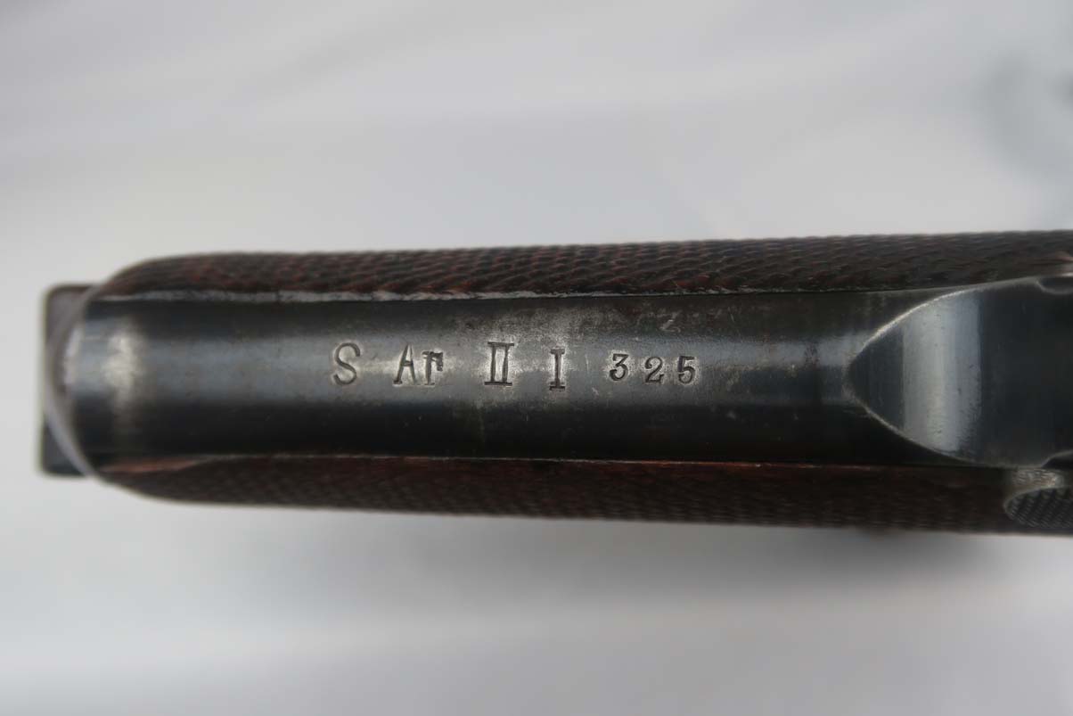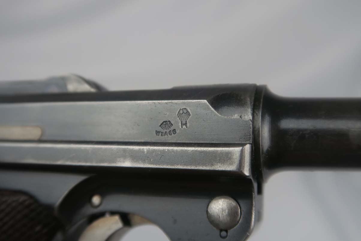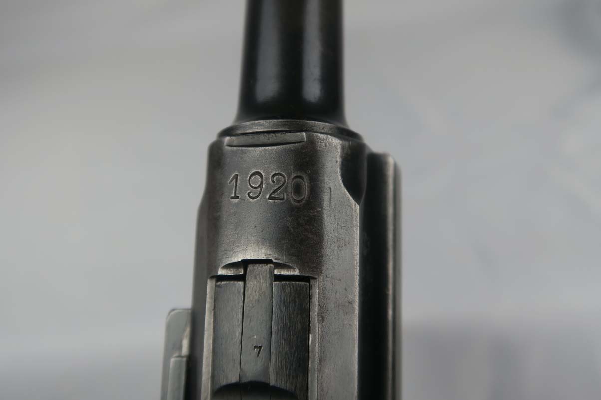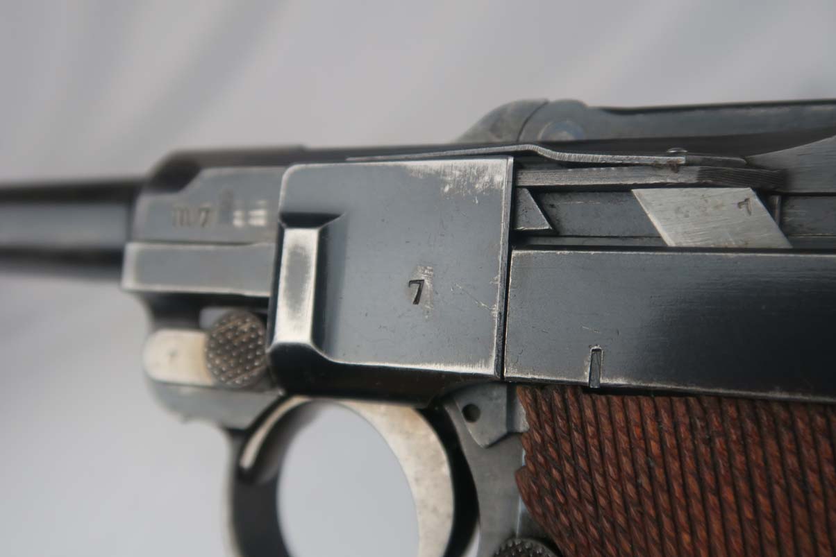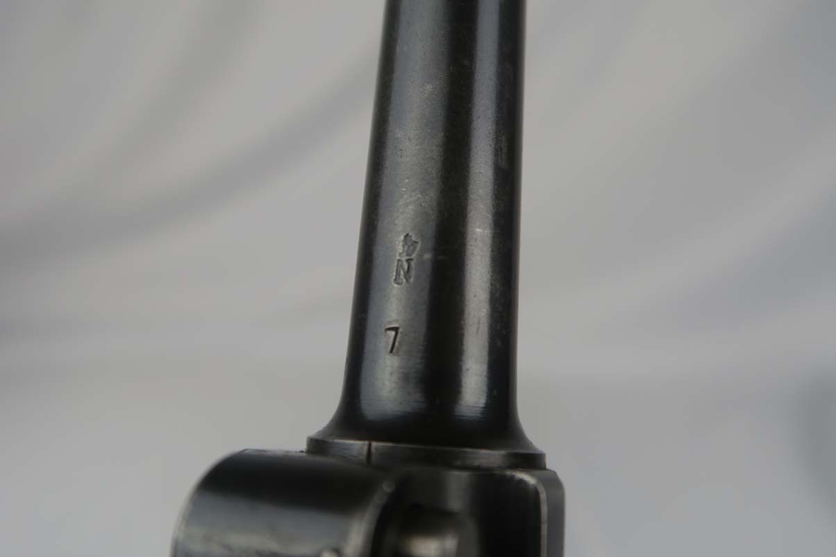 5/5/17- This could perhaps be considered a “sneak” Luger.  Between the wars, during the Weimar period in Germany, and when the Nazi’s first rose to power, they violated the treaty against them re-arming their military or police units. This was most likely a luger from WW1 which was reworked for the commercial market in 1920.   Then it was again re-worked by the Nazi’s for military or police use.   It comes in 9mm, and has crown/N commercial proofs on the barrel, frame and receiver.   One of the reasons I’m not sure about where this gun ended up after the last rework is because it has 2 police safety’s added – the sear safety above the side plate, and the magazine safety at the top of the grip – left side.   That piece missing on the grip is NOT a chip but rather the police style magazine safety.   But I believe the unit marking on the front strap is military – Artillery Unit.  S. Ar. II  I 325.  However, someone can correct me.  Then on the right side of receiver is a Nazi re-work proof – WaA66- from around 1934.  OK, then the serial number is something I have not seen before.   The serial on the frame and receiver is M7.  All other small parts and the barrel are just marked 7, including the hold open, rear toggle pin and the firing pin.  We are not sure of the meaning of the M.    The grips look original, but are not numbered.   The finish appears to be original despite 2 re-works.  All numbers are matching and the bore is excellent.  The magazine is not matching but from a WW1 era luger. (#567)
