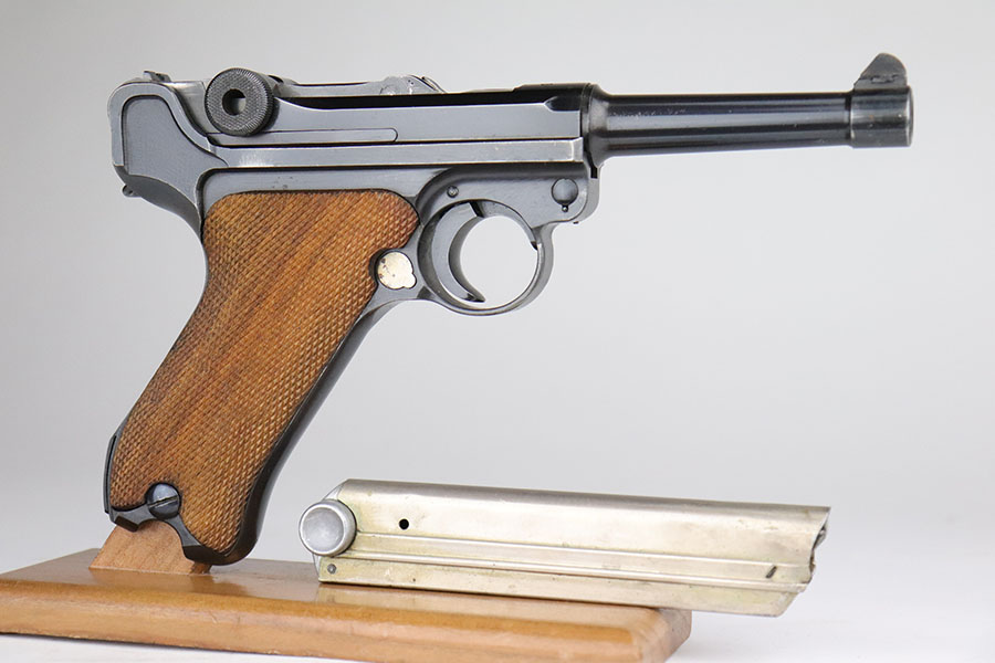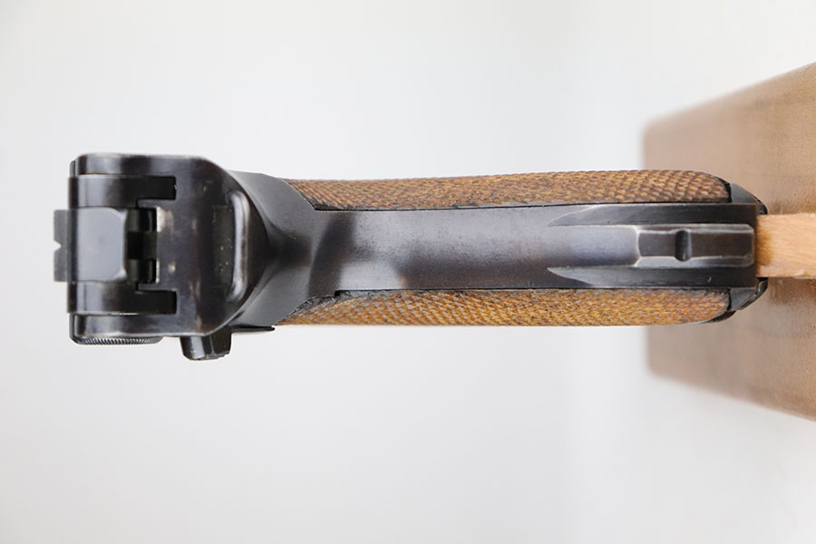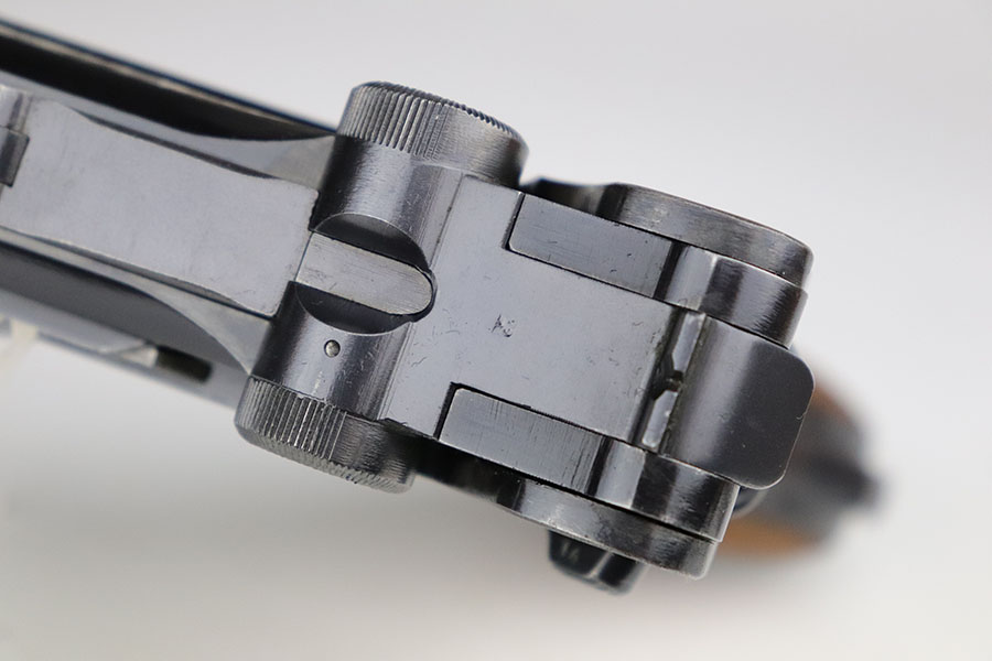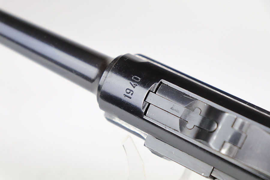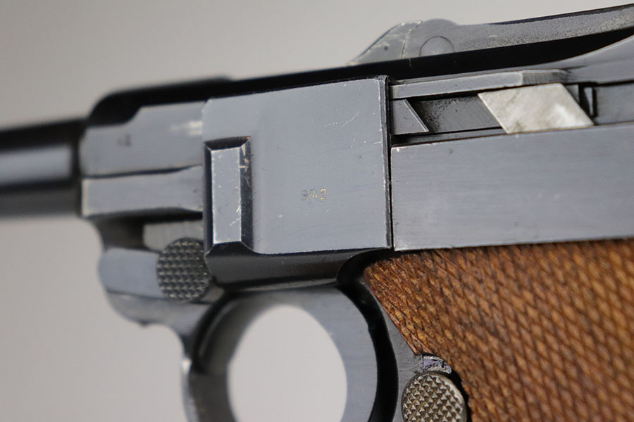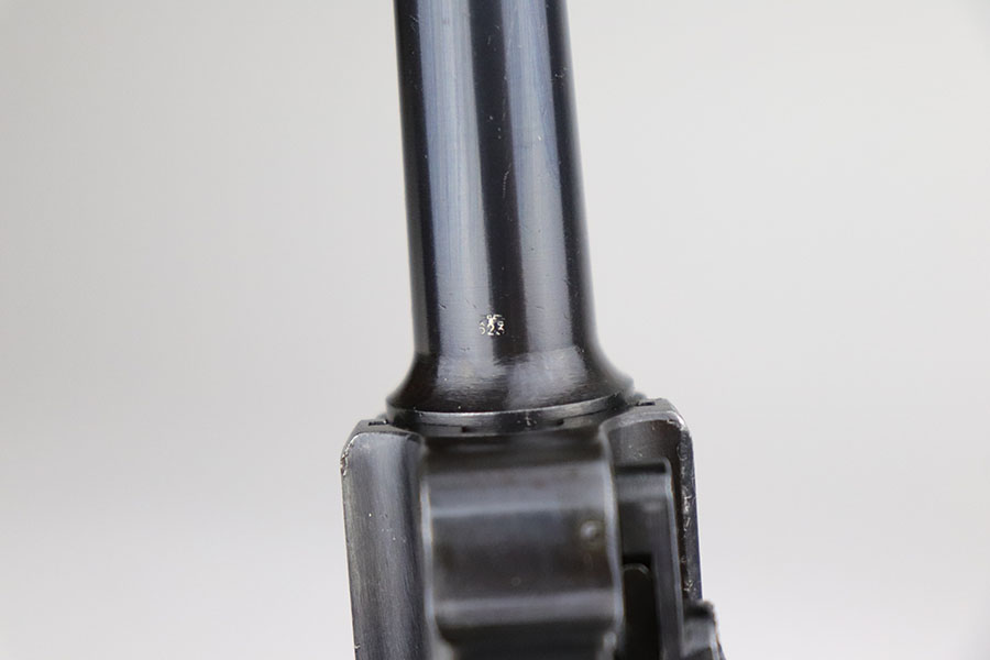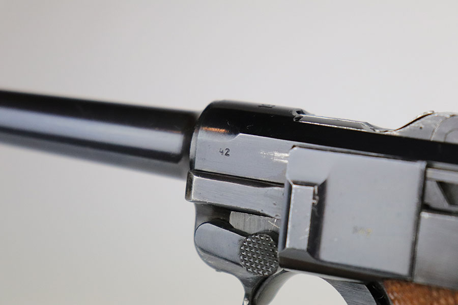 8/11/20 – This is a a rare and interesting Mauser Luger we are calling an “armorer’s” Luger, as it has no serial number and is comprised of armorer replacement parts. It’s 1940 dated, but unknown as to when it was put together. Most parts are marked 42 or S/42, which was the Mauser code and indicated it was an armorers replacement part. These parts were sent to field units so that when a Luger broke they would have field replacement parts and not have to send the gun back. However, once they switched to the P38, or near wars end when there was a shortage of equipment, they actually put together entire Lugers from the PARTS in the armorers supply. We have only seen two others like this one. The barrel has a Steyr proof. The rest of the gun including frame, sideplate, take down lever, and magazine are all 42 or S/42 code. A very unique and desirable Luger. Original finish rates at about 98%. The bore is shiny with strong rifling. The grips are not numbered but Eagle 135 proofed meaning it had to have been put together in 1942 or later. The tolerances for disassembly are very tight due to the “parts” quality of this Luger.