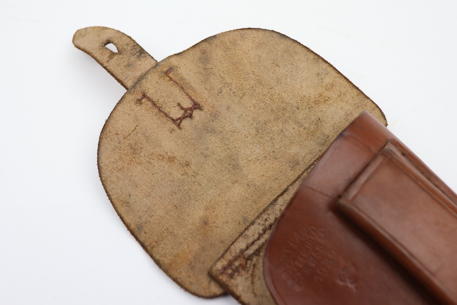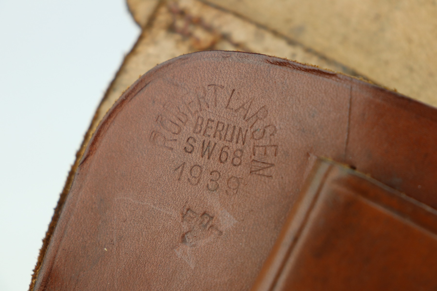 4/13/21 – This is an unissued example of a police style holster for a Walther PPK. The holster is dated 1939 and has the proper Nazi police eagle marking. The holster is in unissued condition, so it is a little stiff. A gun will likely fit a little tight. The top flap wants to stay open. There are just minor handling marks here and there.