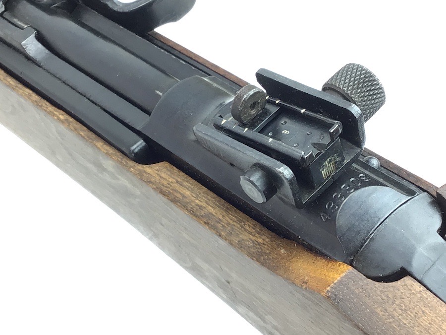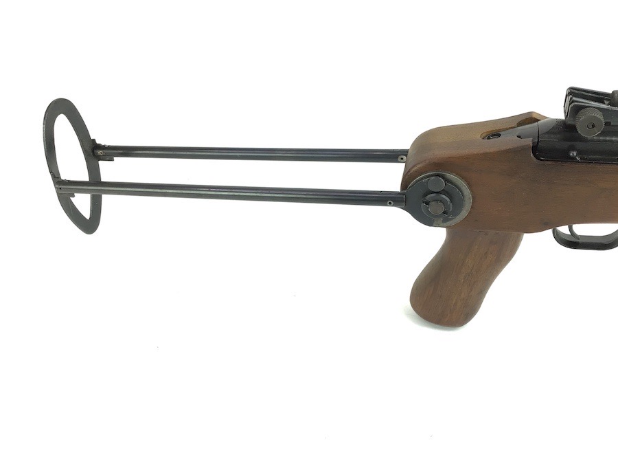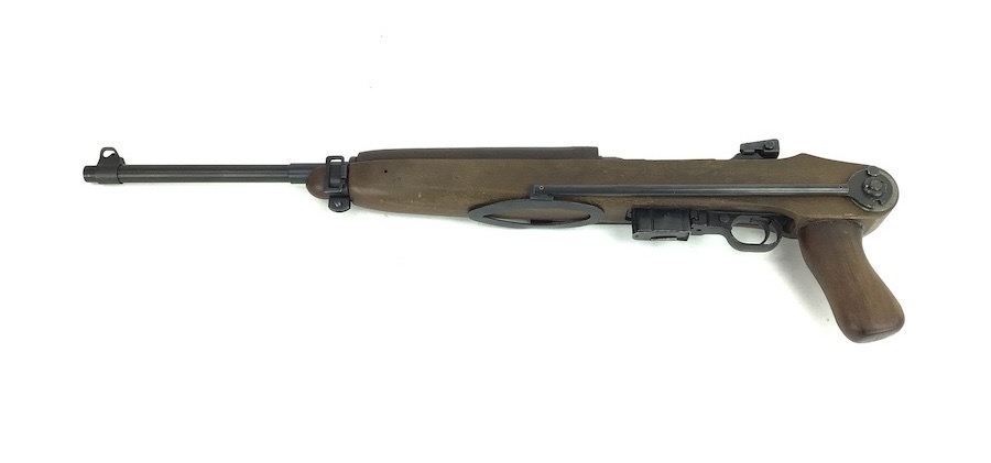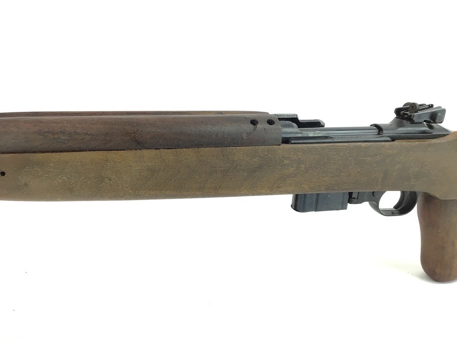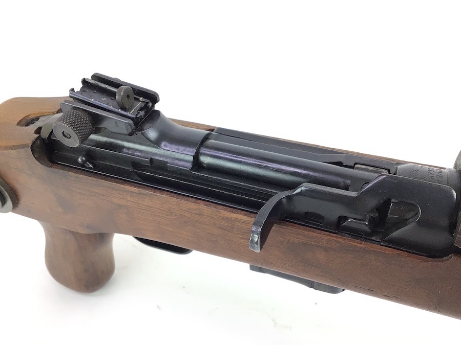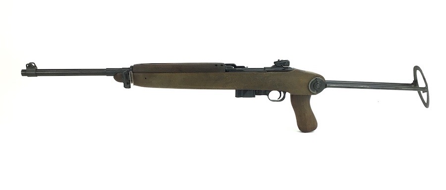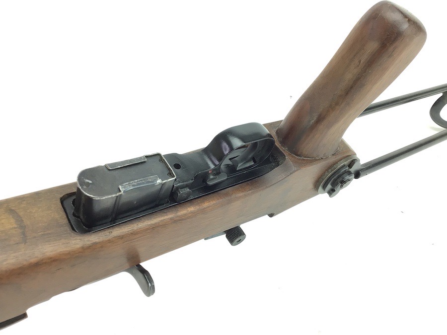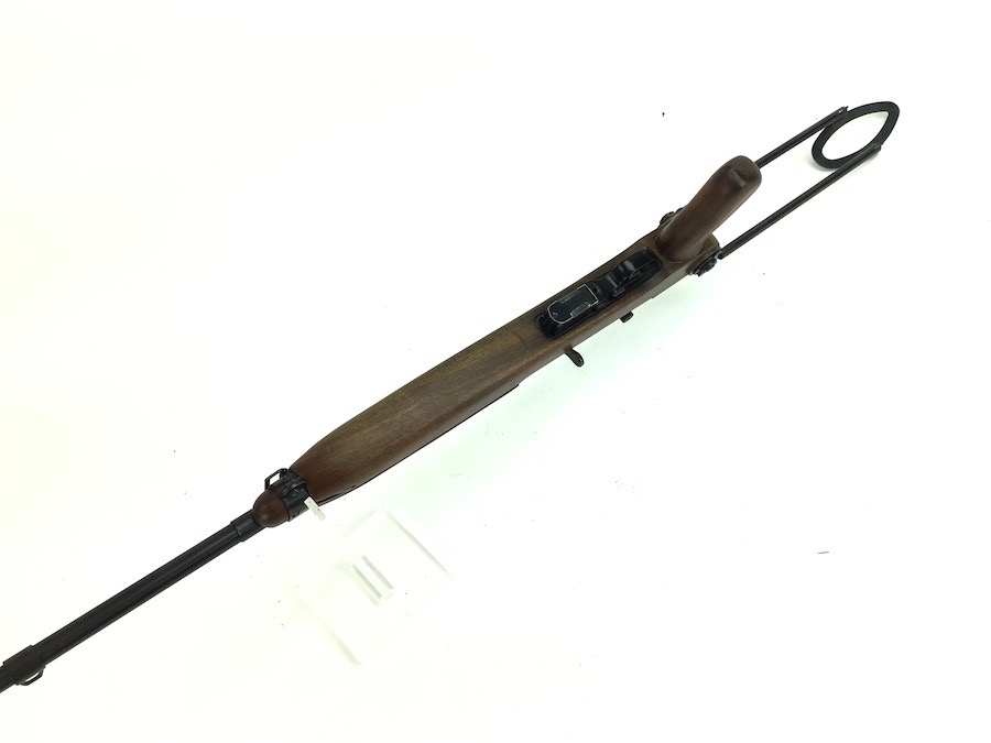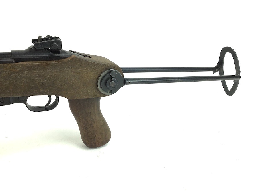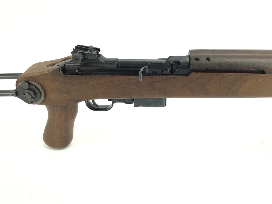 7/11/24 – Original and great condition. This unique M1 carbine is manufactured by Universal and features an under folder stock similar to a paratrooper design. Manufactured in the 1980’s. Finish rates about 98% with barely any finish loss. Bore has strong rifling and rates a 9 of 10. The wood furniture is solid with no markings. The folding stock locks up solid and folds away for easy transport. Includes one 5 round magazine. Fully functional.