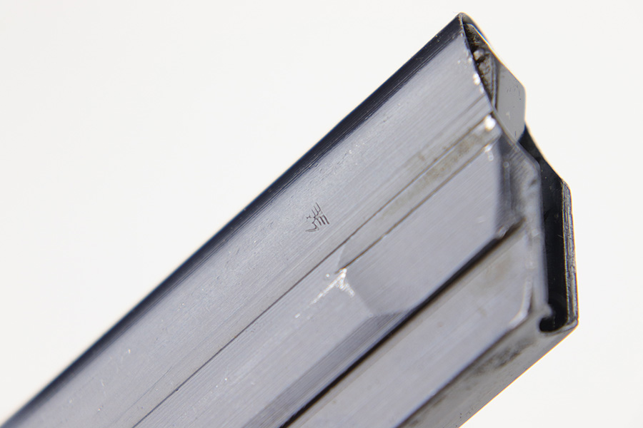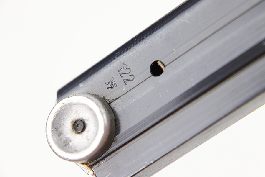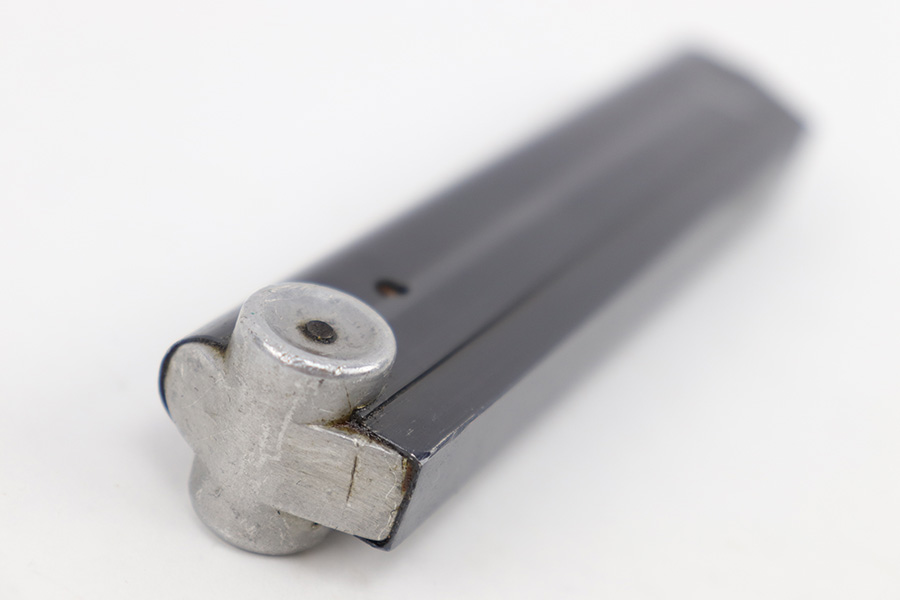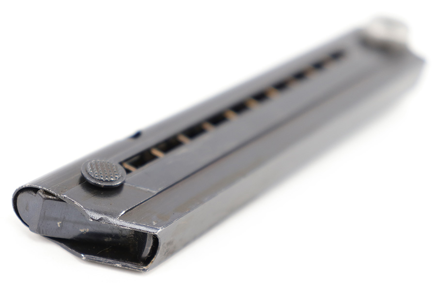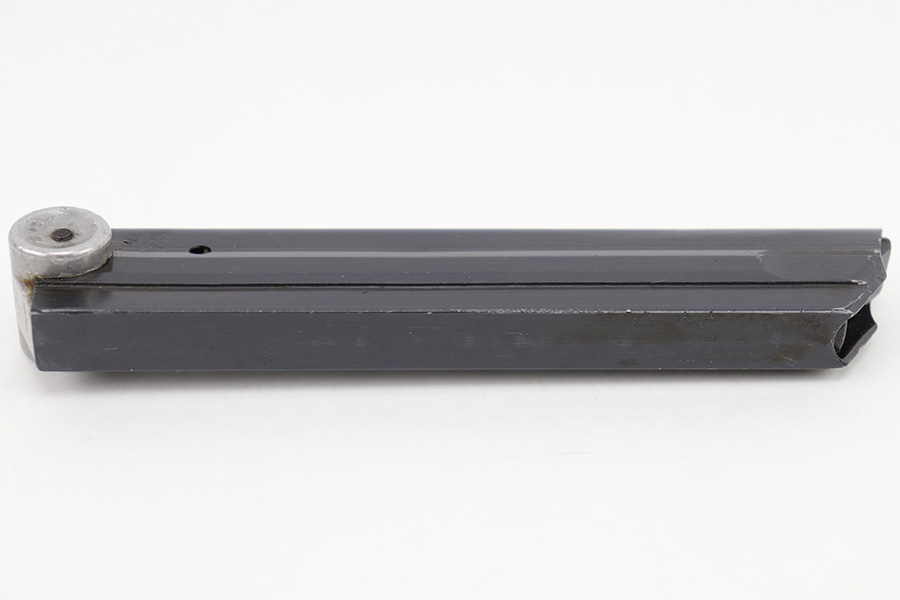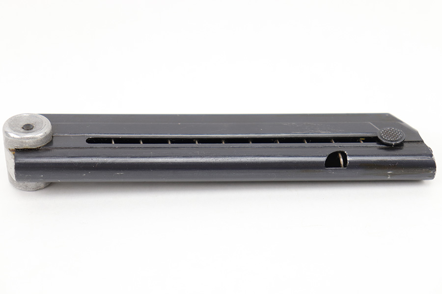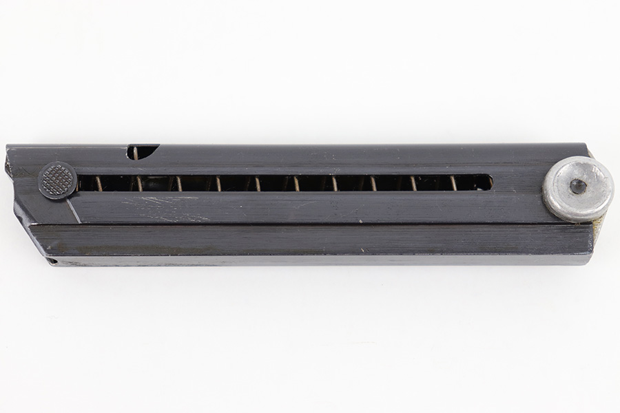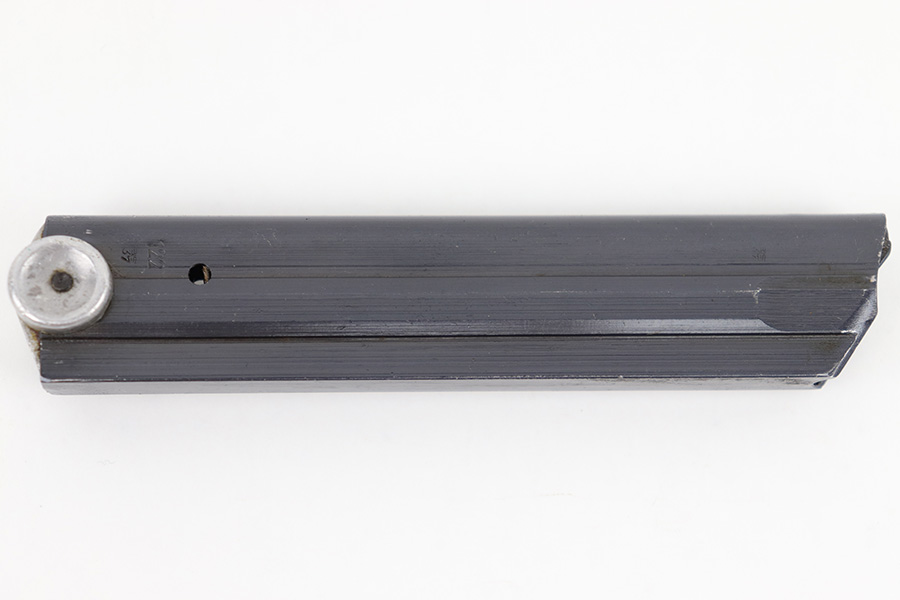 4/10/23 – This is an original “122” code Luger magazine from WW2. The magazine has a blued tube and aluminum base. The base is unmarked and shows no signs of alteration, making this a desirable late-Luger production magazine. Excellent overall condition with strong bluing throughout the tube and a fully functional spring. The left side of the tube is “122” code stamped by Haenel with two eagle 37 proof stamps. Likely made as a field replacement luger magazine by Haenel.