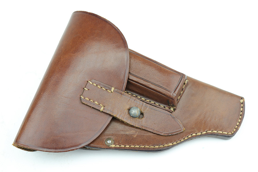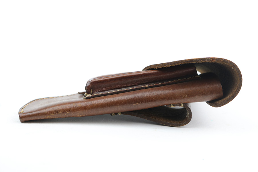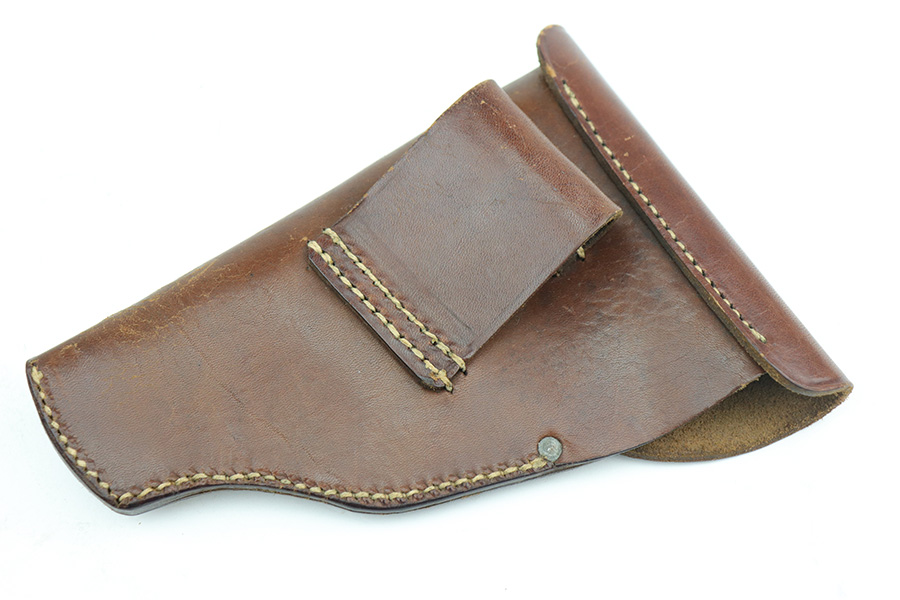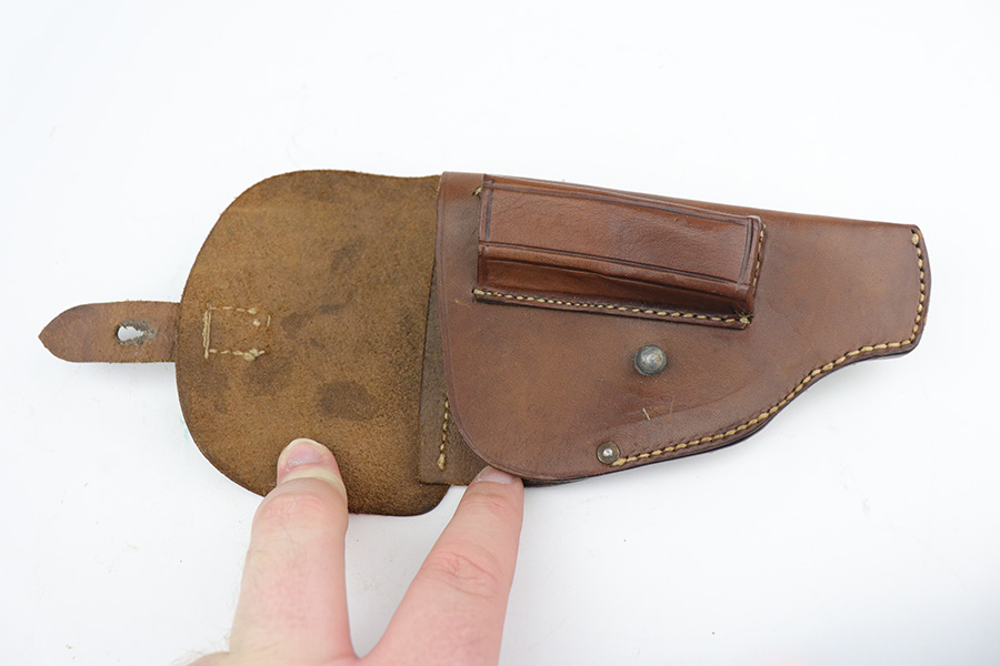 10/4/21 – This brown holster is from the WW2 era and is meant to accommodate a 6.35mm/.25 cal pistol indicated by the size of the extra magazine pouch. The stitching is intact. The leather is in great condition, showing only minor wear throughout. The closure strap does have some minor cracking due to use.