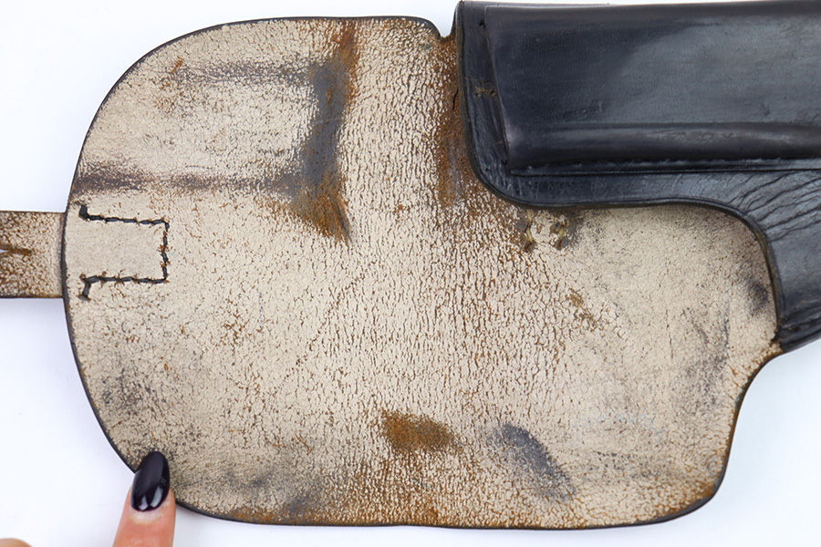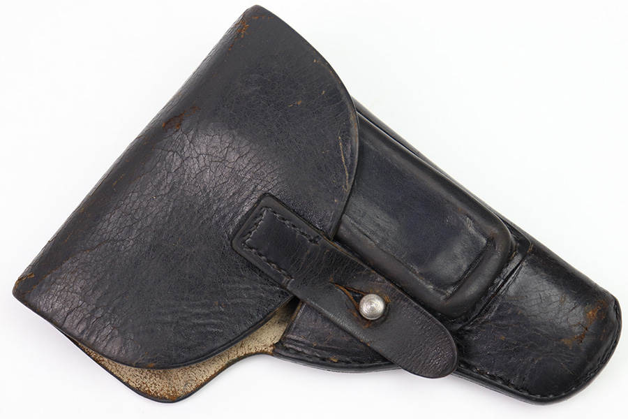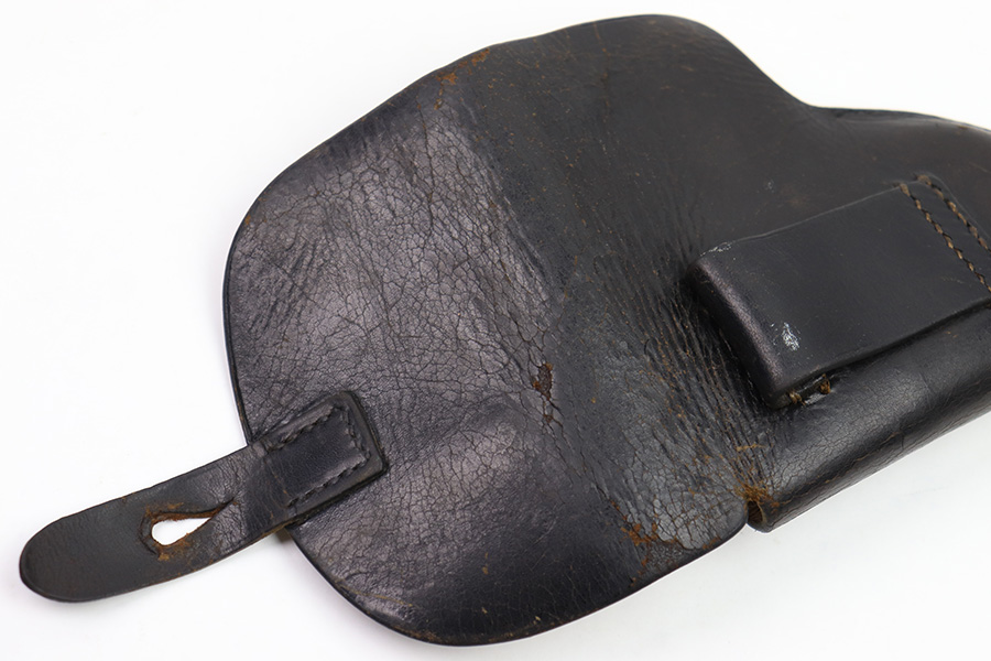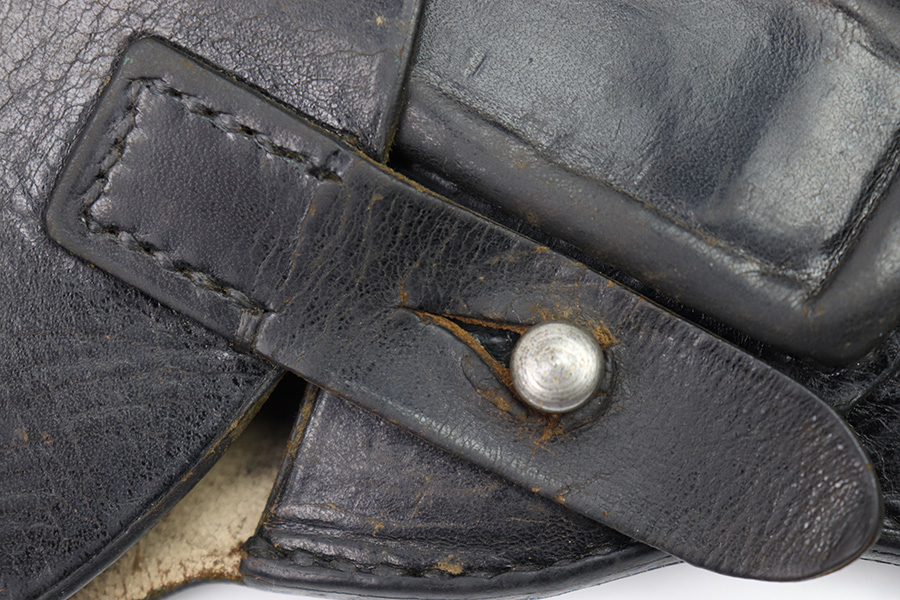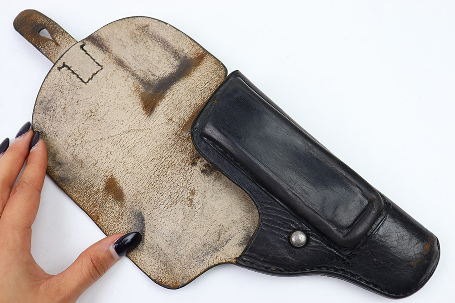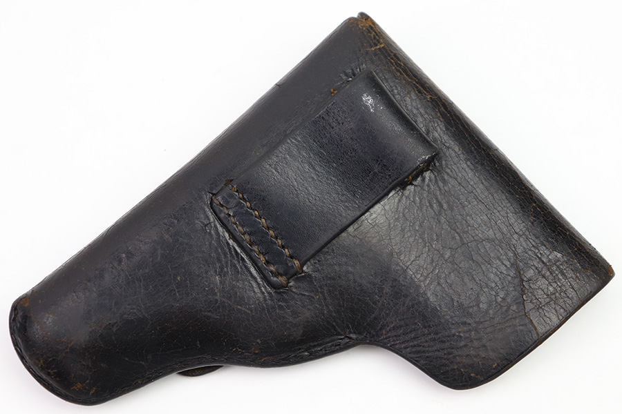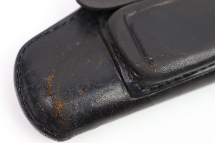 11/22/22 – This is an unmarked holster for a 7.65mm pistol such as the Mauser HSc, Sauer 38h, or Walther PPK. The black leather has some mild surface wrinkling throughout and typical signs of aging. Normal pliability. The stitching is all tight and intact but the belt loop has straw colored stitching while the rest of the stitching is black, leading us to think the belt loop has replaced stitching.