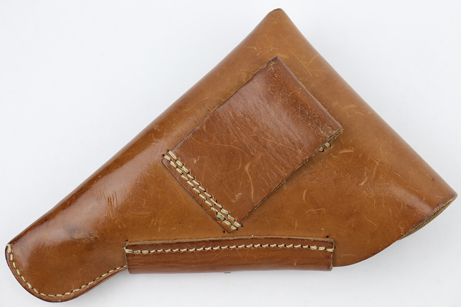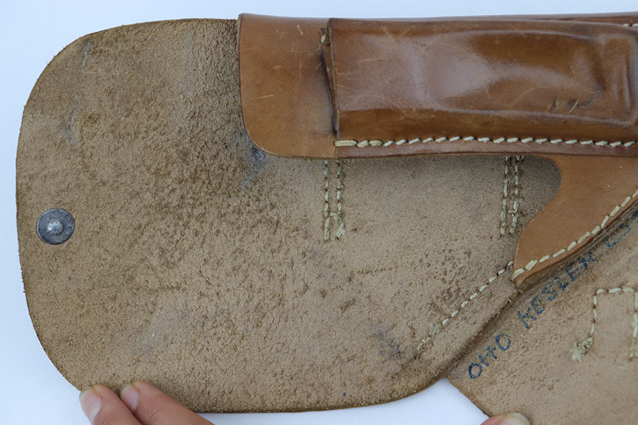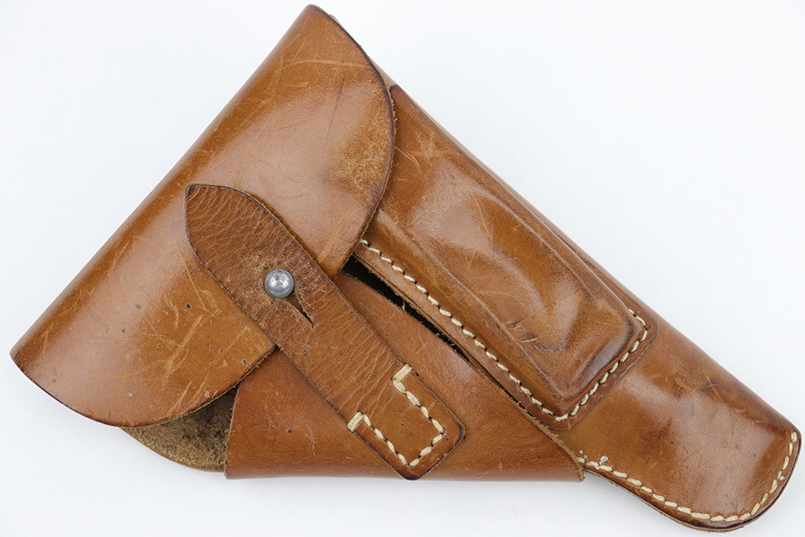5/4/23 – This is an original WW2 production holster for a 7.65mm Axis pistol such as a Walther PP, Mauser HSc, or Sauer 38h. The holster has nice light brown leather with normal pliability and light use wear. Excellent straw-colored stitching throughout. The interior leather is clean with mild use wear and a name written on the side flap as shown.