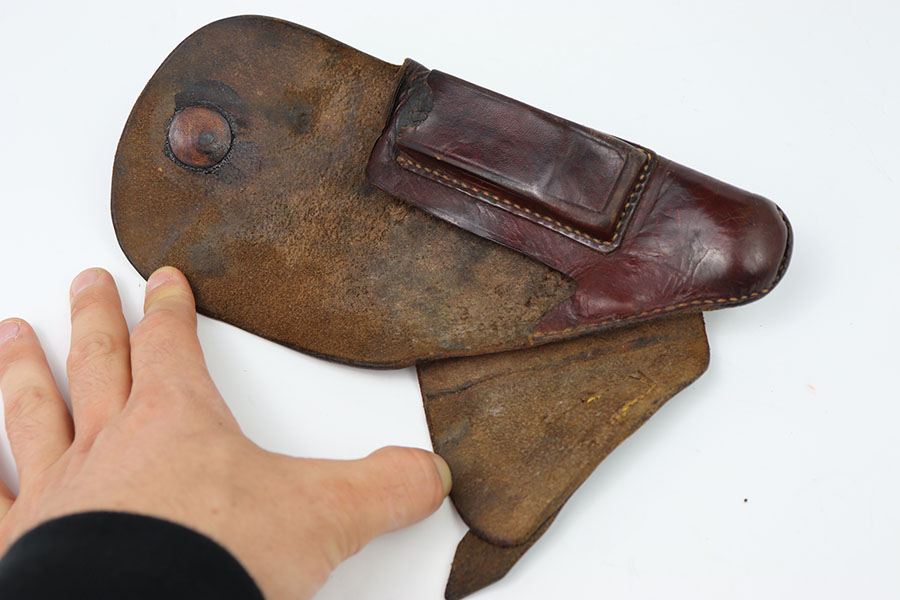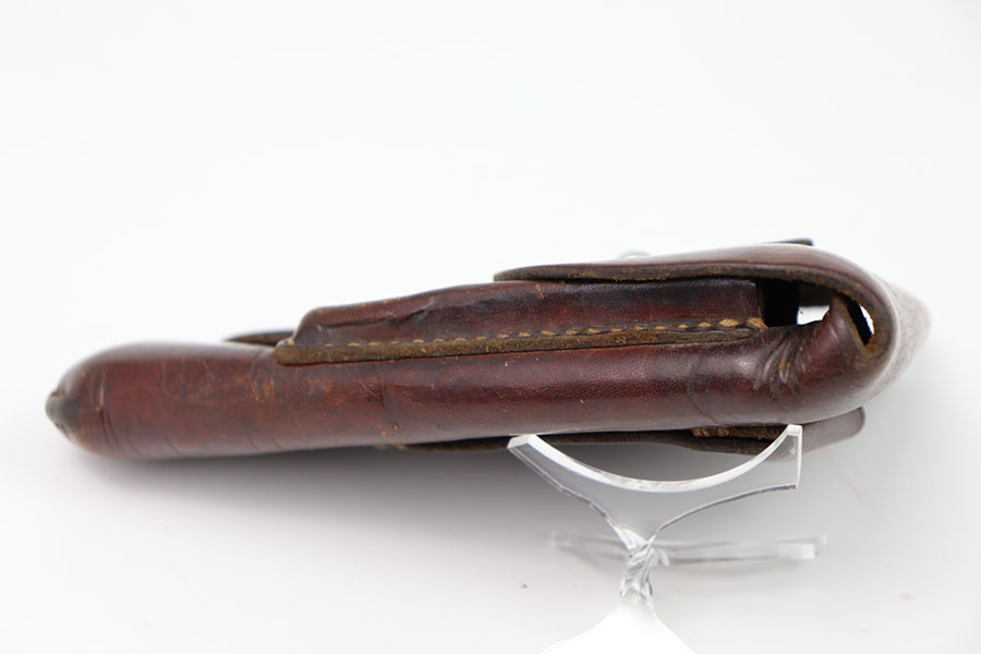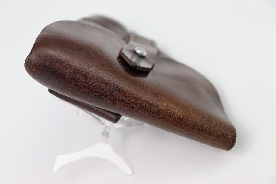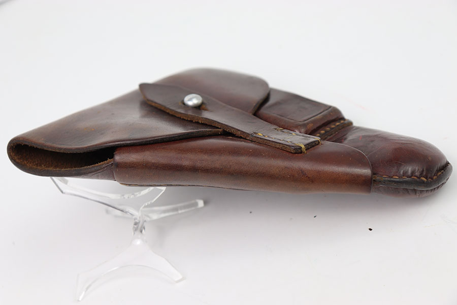 3/14/24 – This is an excellent condition, unmarked 7.65mm holster. Fits a Walther PPK or similar sized Axis pistol. The leather is soft and clean throughout and has normal pliability. No stitching issues or cracking.
