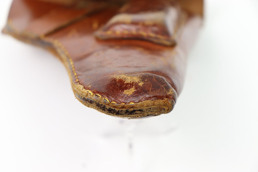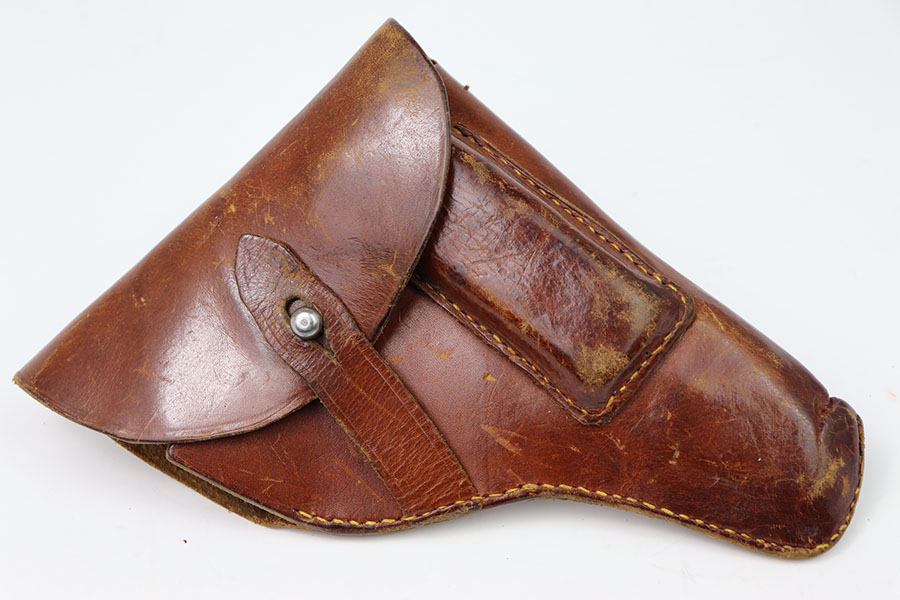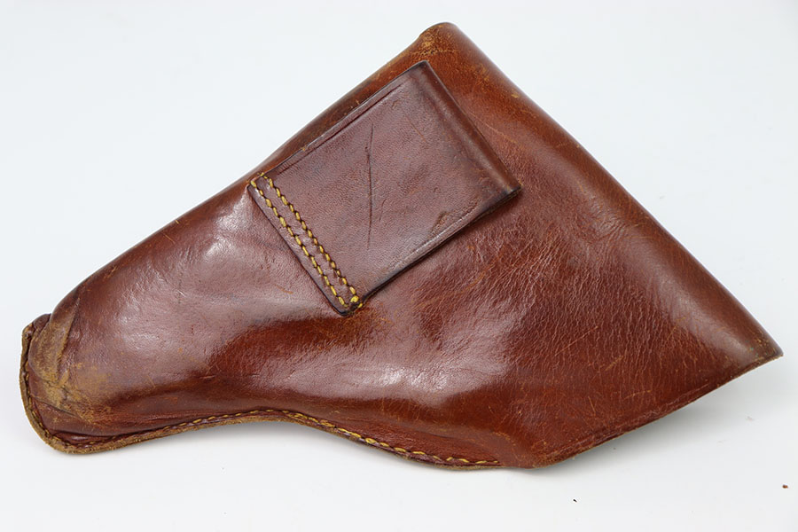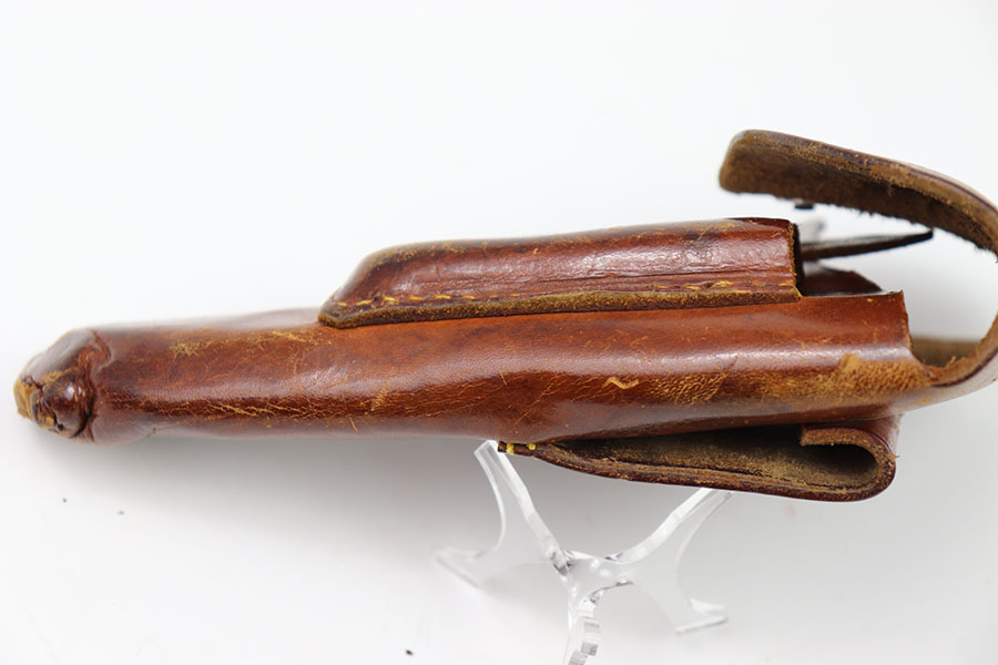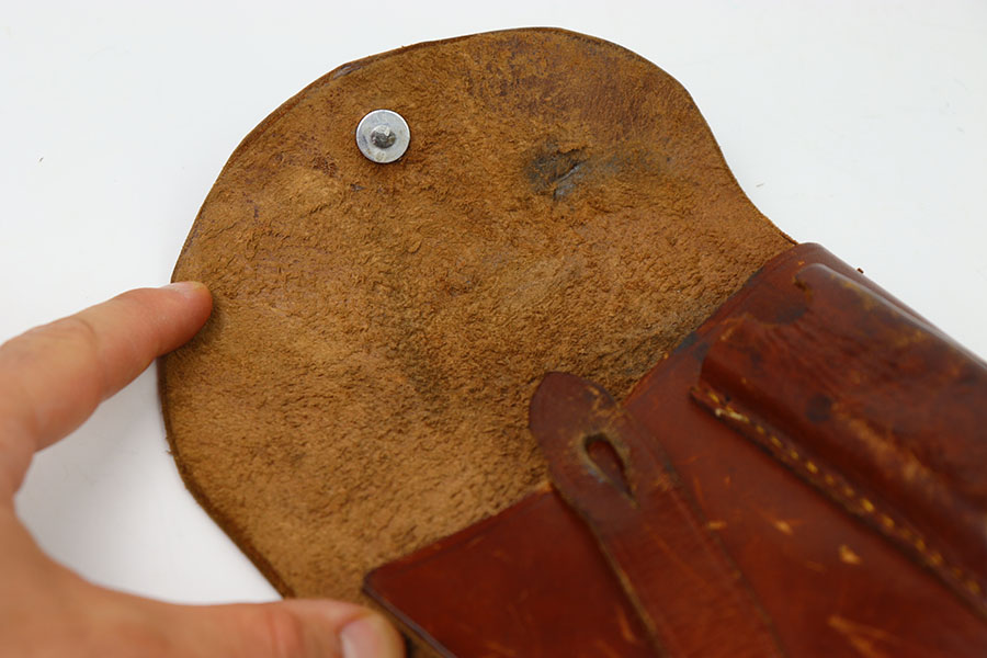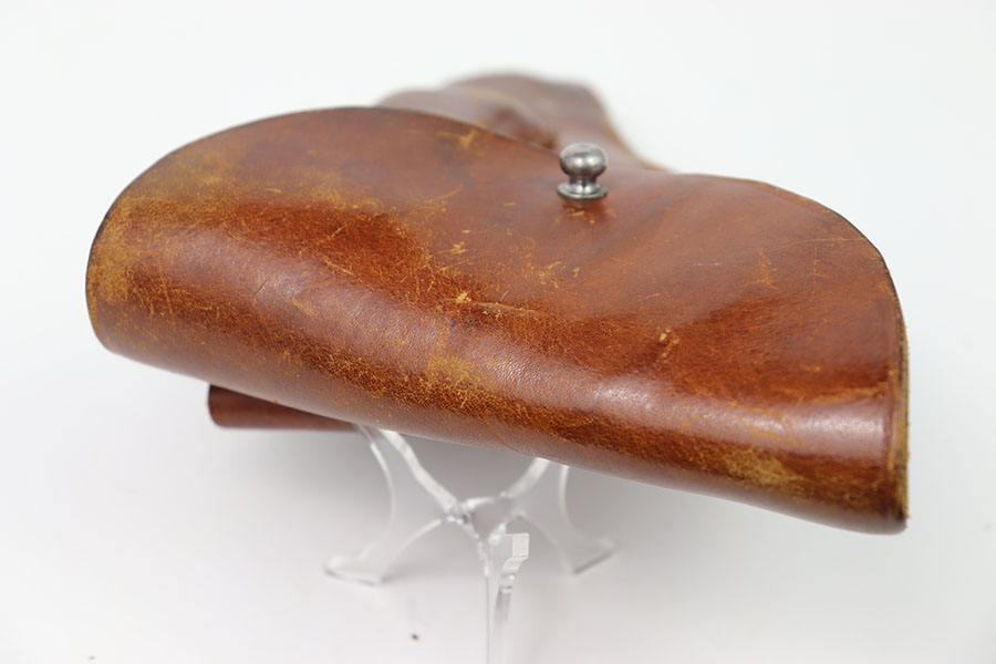3/14/24 – This is an unmarked leather holster from WW2. Similar style to other Mauser examples we’ve found, therefore this holster is most appropriate for a Mauser HSC or model 1934. Also fits most similar sized Axis pistols. Steel closure stud and clean brown leather with some mild exterior wear (mostly on the tip/toe of the holster) and normal pliability. Excellent interior. No stitching issues.