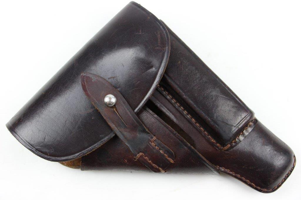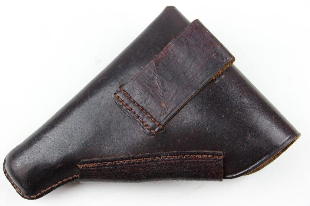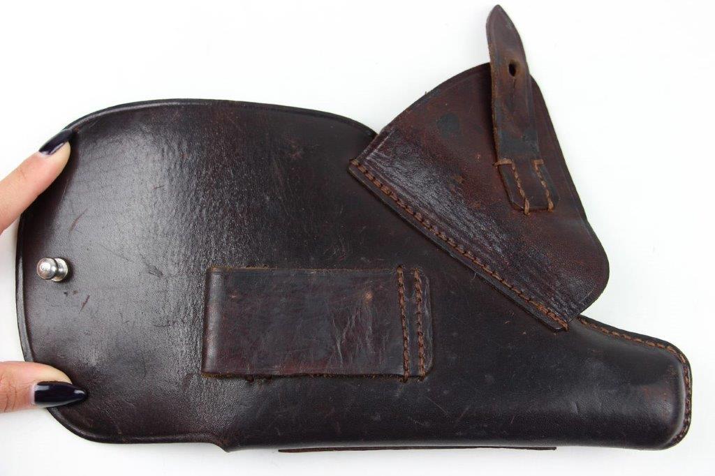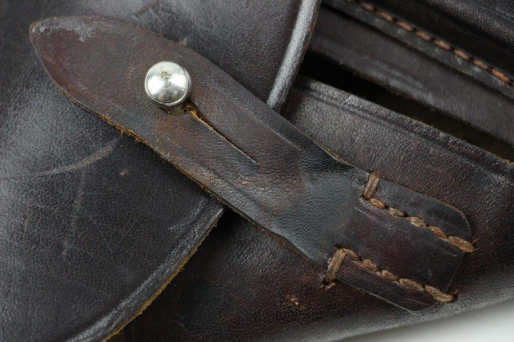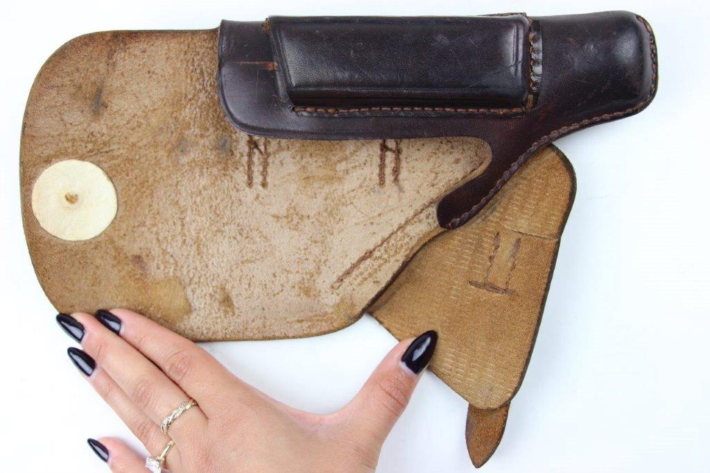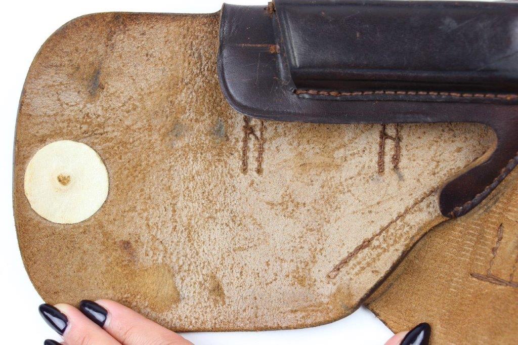 4/30/24 – This is an unmarked 7.65mm holster from WW2. The holster is in great overall condition made in typical German style. Great for a later wartime production Walther PP, Mauser HSC, or Sauer 38h. The leather has normal pliability and typical signs of previous use without any excessive damage or wear. The stitching is tight and original throughout with no missing stitches. The interior leather has an added leather patch over the closure knob, as shown.
