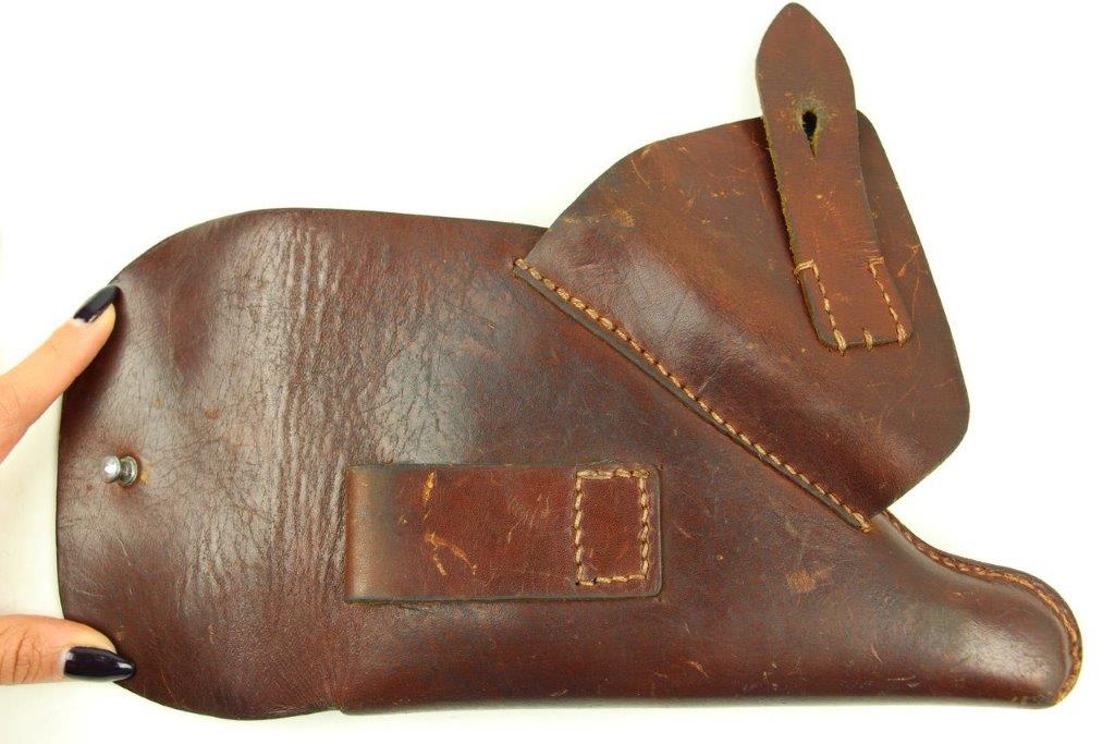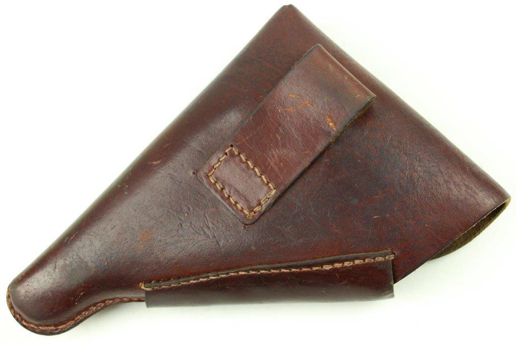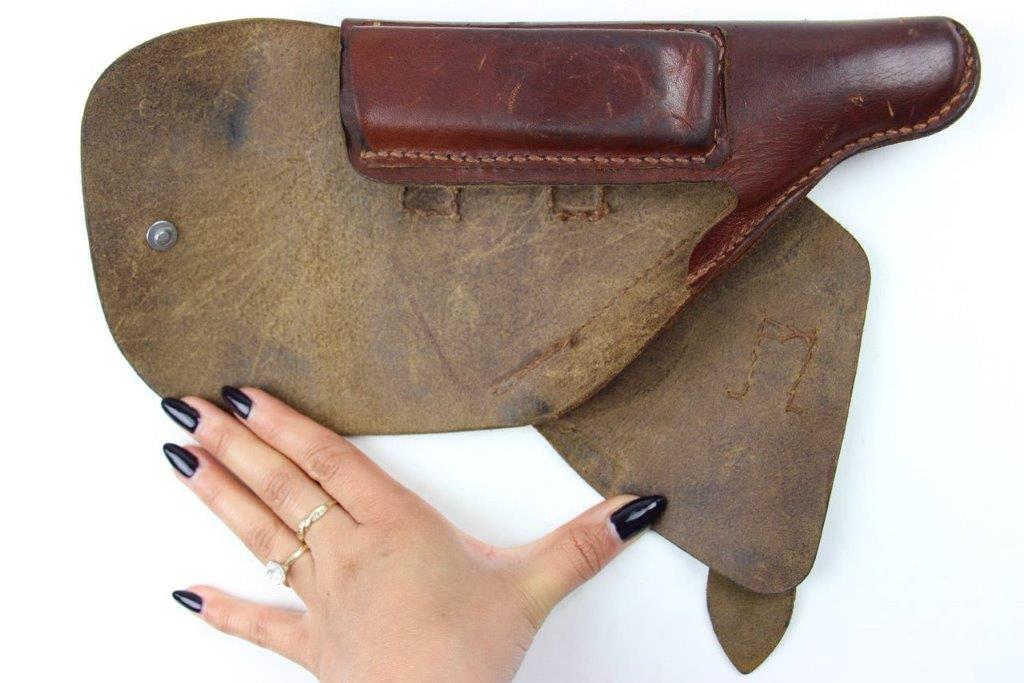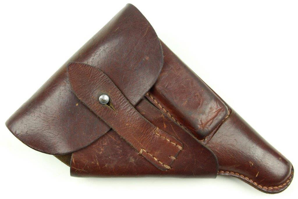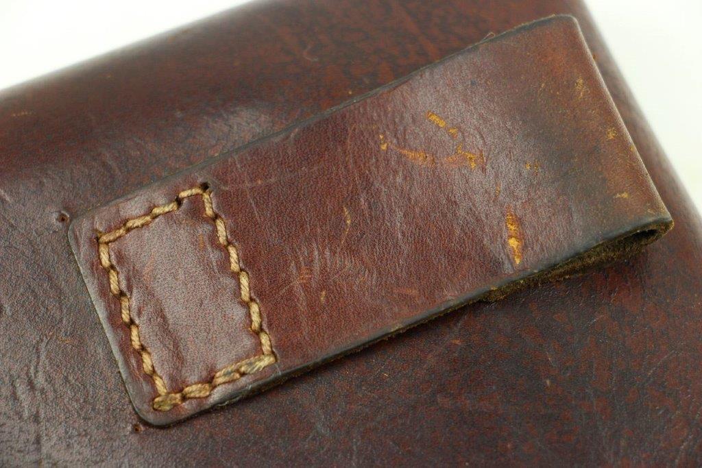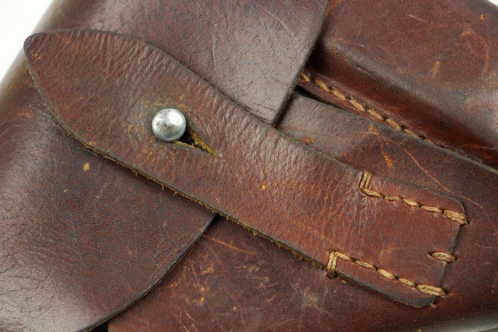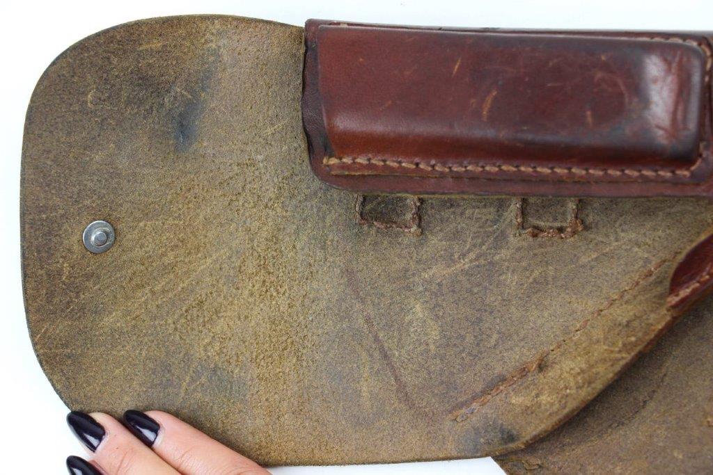 4/30/24 – This is an unmarked 7.65mm holster from the WW2 era. The holster is in great overall condition with typical signs of age and previous use with no excessive wear or damage. The holster measures about 7.75 inches long (when shut) along the leading edge, or magazine edge of the holster. Width is about 5.5 inches at the top. The magazine pouch measures about 4 inches long and 1.5 inches wide.