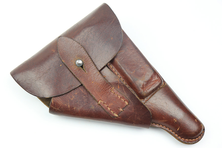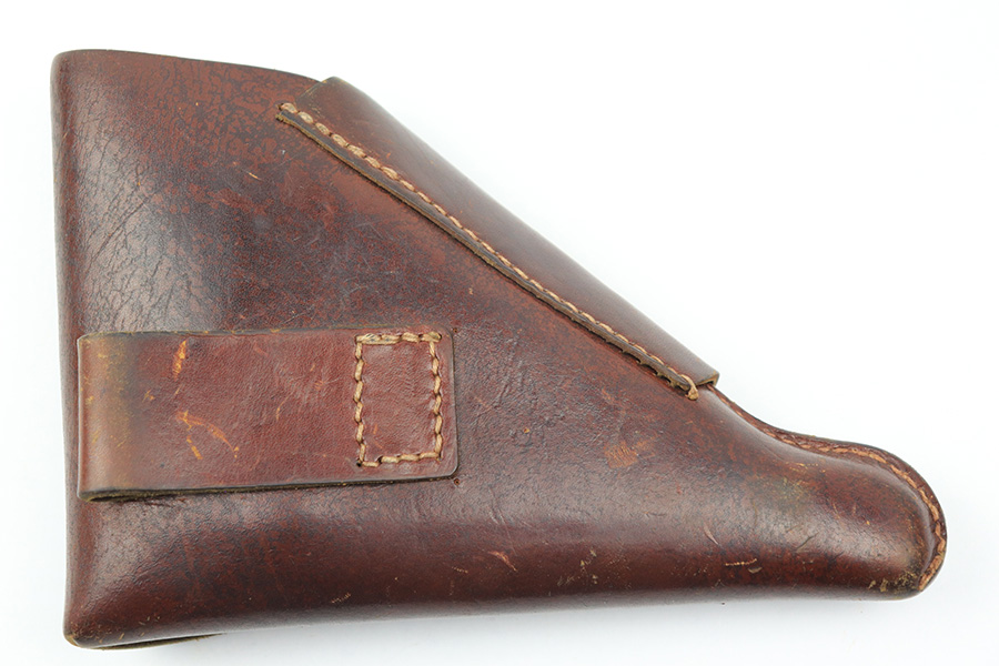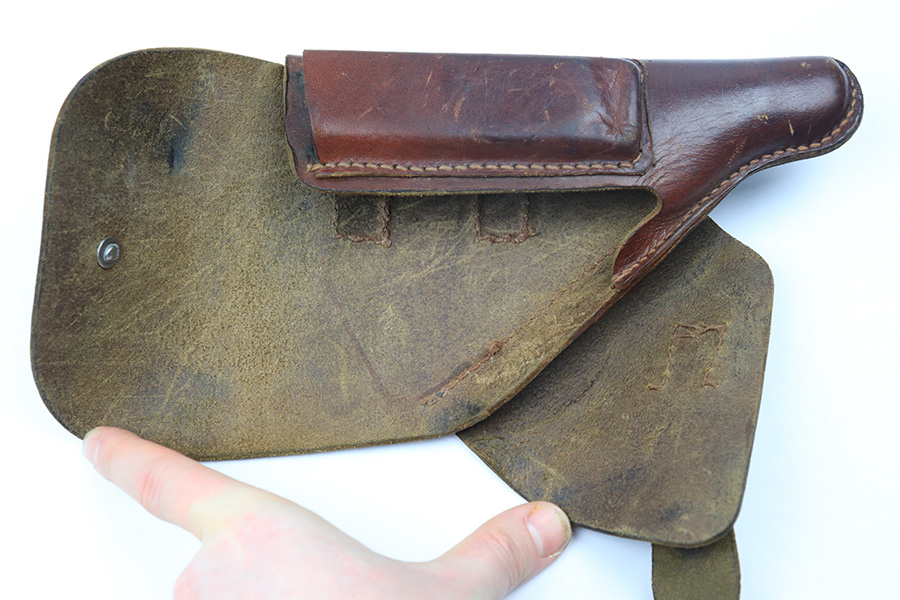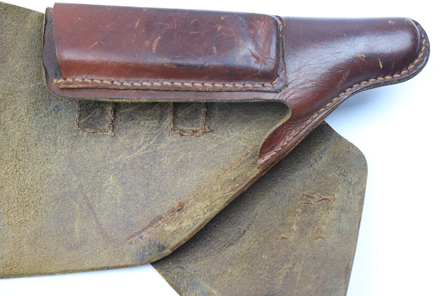1/28/22 – This is an unmarked leather holster for a 7.65mm pistol. The holster measures about 8 inches long and 5.5 inches wide when closed. The stitching is all intact without any notable flaws. The leather has some mild surface wear but no major issues.